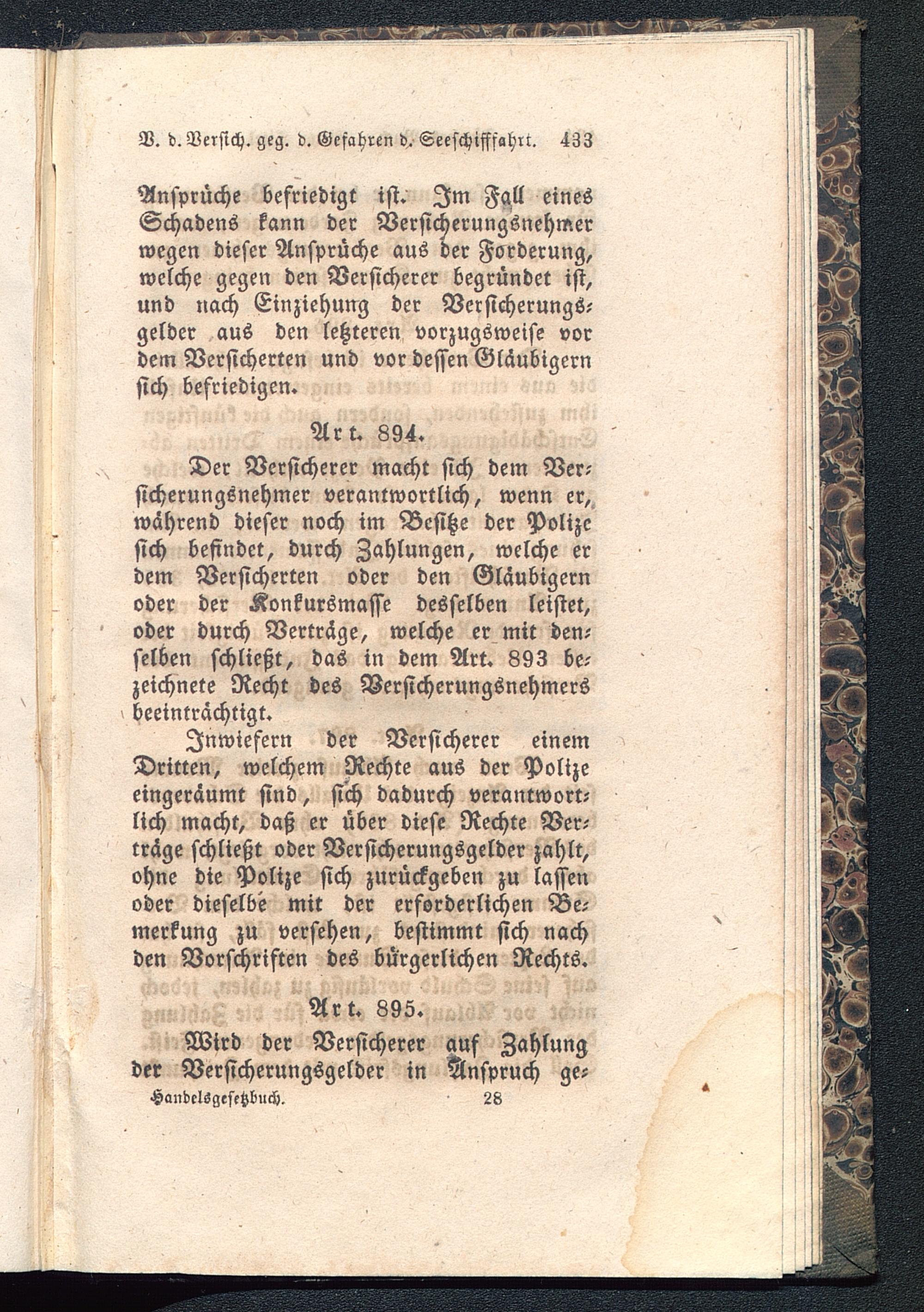 Der Versicherer macht sich dem Ver-sicherungsnehmer verantwortlich, wenn er,während dieser noch im Besitze der Polizesich befindet, durch Zahlungen, welche erdem Versicherten oder den Gläubigernoder der Konkursmasse desselben leistet,oder durch Verträge, welche er mit den-selben schließt, das in dem Art. 893 be-zeichnete Recht des Versicherungsnehmersbeeinträchtigt.