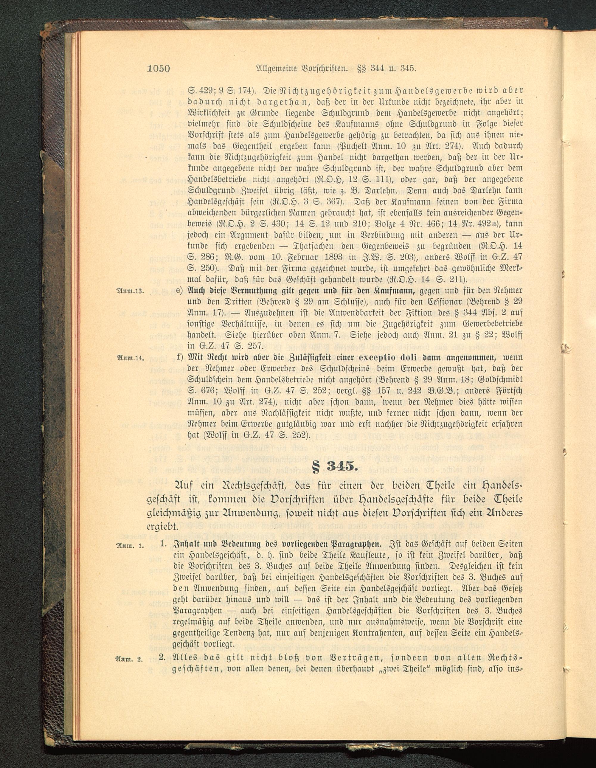 S.429; 9 S. 474). Die Nichtzngehörigkeit zum Handelsgewerbe wird aberdadurch nicht dargethan, daß der in der Urkunde nicht bezeichnete, ihr aber inWirklichkeit zu Grunde liegende Schuldgrund dem Handelsgewerbe nicht angehört:vielmehr sind die Schuldscheine des Kaufmanns ohne Schuldgrund in Folge dieserVorschrift stets als zum Handelsgewerbe gehörig zu betrachten, da sich aus ihnen nie-mals das Gegentheil ergeben kann <Puchelt Anm. 10 zn Art. 274>. Auch dadurchkaun die Nichtzugehörigkcit zum Handel nicht dargethan werden, daß der in der Ur-kunde angegebene nicht der wahre Schuldgrund ist, der wahre Schuldgrund aber demHandelsbetriebe nicht angehört (R.O.H, 12 S- 111), oder gar, daß der angegebeneSchnldgrund Zweifel übrig läßt, wie z. B. Darlehn. Denn auch das Dnrlehn kannHandelsgeschäft sein M.O.H. 3 S. 367). Daß der Kaufmann seinen von der Firmaabweichenden bürgerlichen Namen gebraucht hat, ist ebenfalls kein ausreichender Gegen-beweis M.O.H. 2 S. 430,' 14 S. 12 und 210; Bolze 4 Nr. 466; 14 Nr. 492 a>, kannjedoch ein Argument dafür bilden, um in Verbindung mit anderen — aus der Ur-kunde sich ergebenden — Thatsachen den Gegenbeweis zn begründen M.O.H. 14S. 286; R.G. von- 10. Februar 1893 in J.W. S. 203>, anders Wolff in 47S. 250). Daß mit der Firma gezeichnet wurde, ist umgekehrt das gewöhnliche Merk-mal dafür, daß für das Geschäft gehandelt wurde (R.O.H. 14 S. 211>.Anm.13. s) Auch diese Vermuthung gilt gegen und für den Kaufmann, gegen uud für den Nehmer