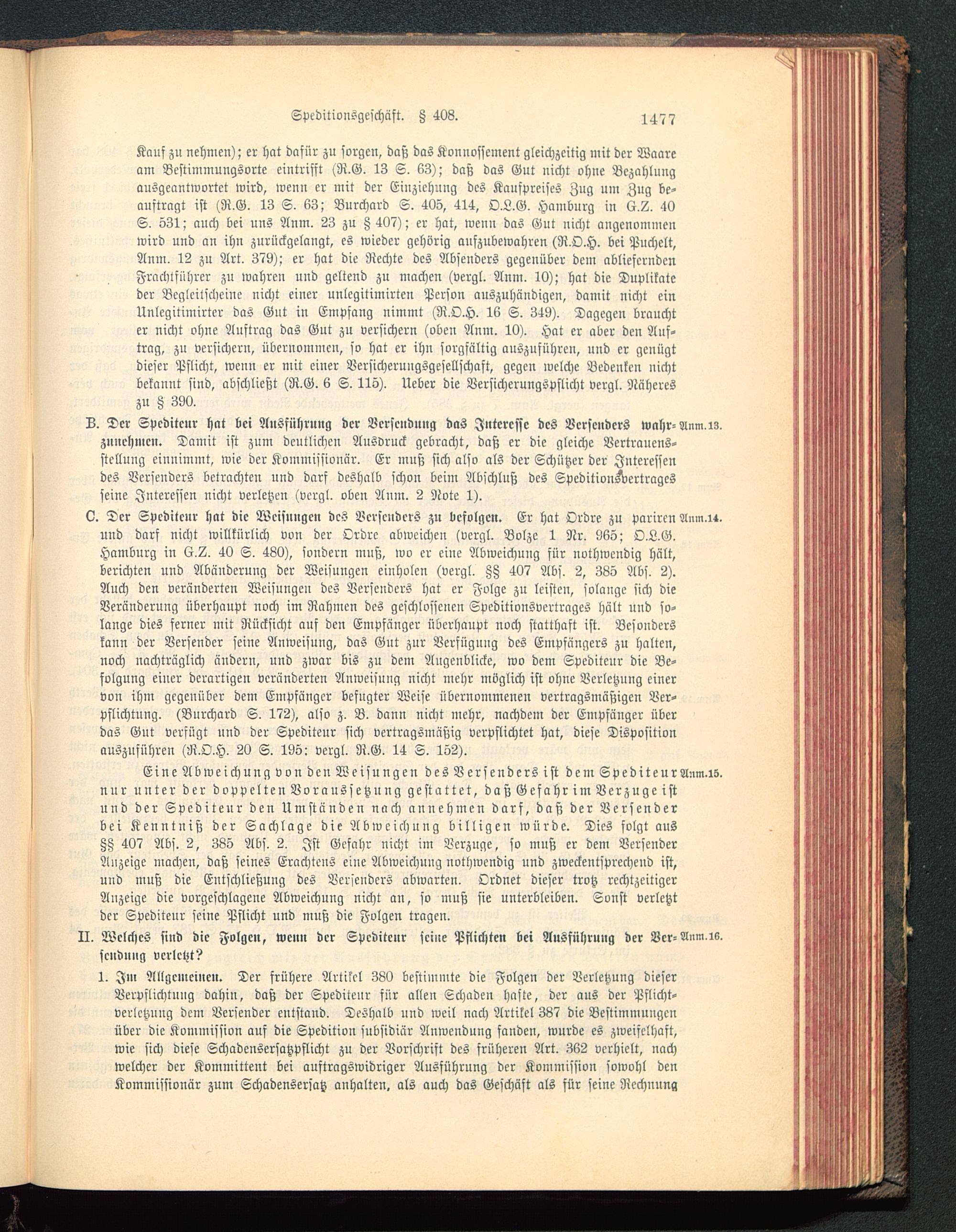Eine Abweichung von den Weisungen des Versenders ist dem SpediteurAnm.is.nur unter der doppelten Voraussetzung gestattet, daß Gefahr im Verzüge istund der Spediteur den Umständen nach annehmen darf, daß der Versenderbei Kenntniß der Sachlage die Abweichung billigen würde. Dies folgt ausZZ 407 Abf. 2, 385 Abs. 2. Ist Gefahr nicht im Verzüge, so muß er dem VersenderAnzeige machen, daß seines Erachtens eine Abweichung nothwendig und zweckentsprechend ist,und muß die Entschließung des Versenders abwarten. Ordnet dieser trotz rechtzeitigerAnzeige die vorgeschlagene Abweichung nicht an, so muß sie unterbleiben. Sonst verletztder Spediteur seine Pflicht und muß die Folgen tragen.II. Welches siud die Folgen, wenn der Spediteur seine Pflichten bei Ausführung der Vcr-Anm.is.fcudu»g verletzt?