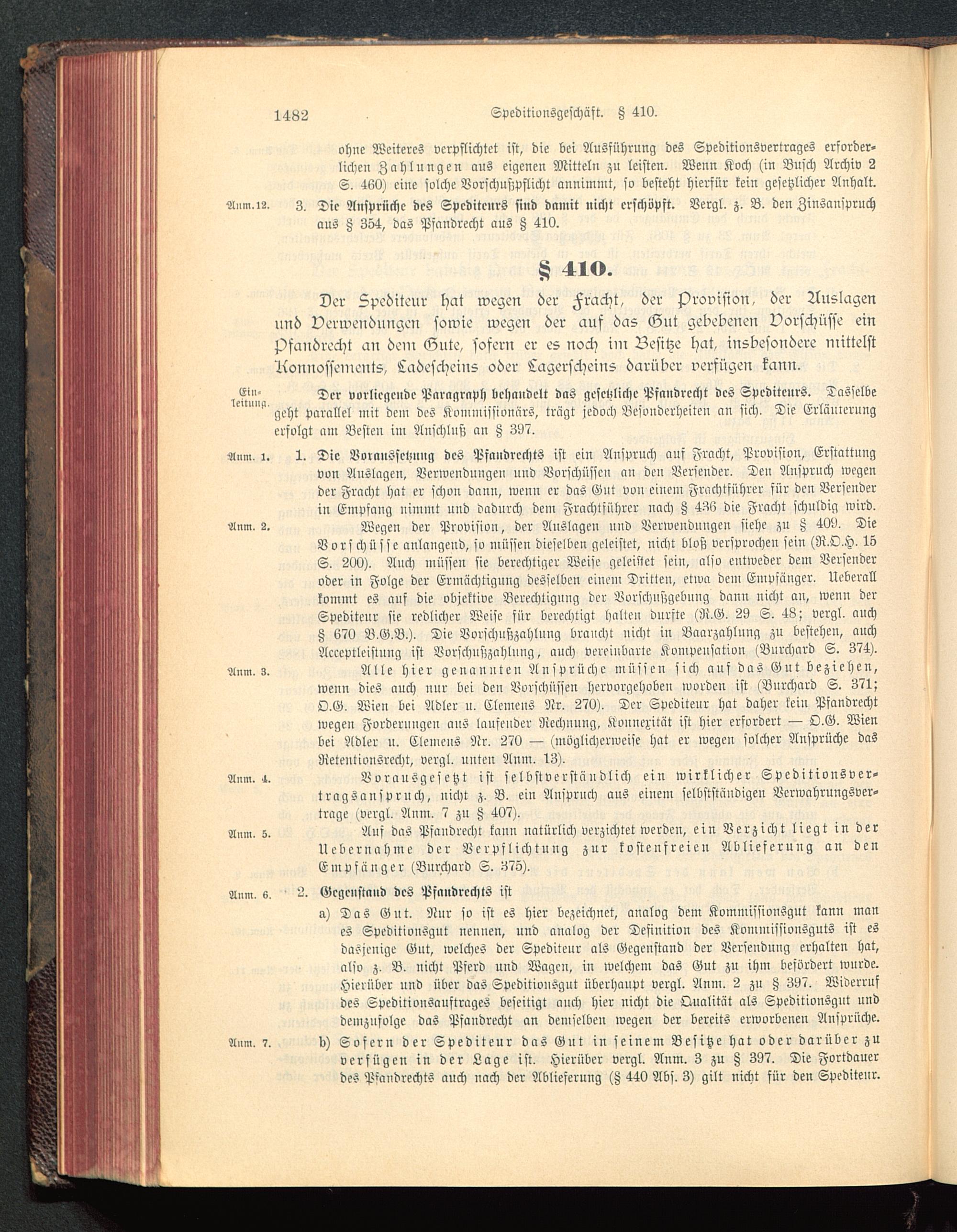 weuu dies auch mir bei den Vorschüssen hervorgehoben worden ist (Bnrchard S. 371;O.G. Wien bei Adler u. Clemens Nr. 270). Der Spediteur hat daher kein Pfandrechtwegen Forderungen ans laufender Rechunng, Kvuuexität ist hier erfordert — O.G. Wien bei Adler n. Clemens Nr. 270 — (möglicherweise hat er wegen solcher Ansprüche dasRetentionsrecht, vergl. unten Anm. 13).