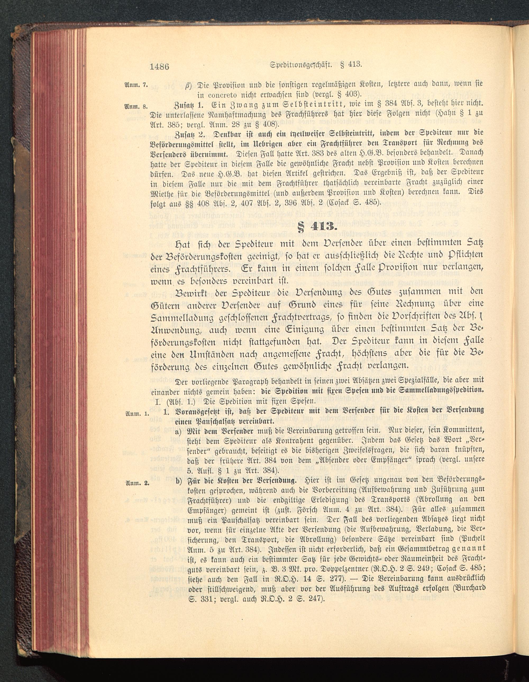 Zusatz '<!. Denkbar ist auch ei» tiicllwciser Sclbstcintritt, indem der Spediteur »nr dieBeförderungsmittel stellt, im Ucbrigcu aber ein Frachtführer den Transport für Rechnung desVersenders übernimmt. Diesen Fall hatte Art. 383 des alten H.G.B, besonders behandelt. Danachhatte der Spediteur iu diesem Falle die gewöhnliche Fracht nebst Provision und Kosten berechnendürfen. Das nene H.G.B, hat diesen Artikel gestrichen. Das Ergebniß ist, daß der Spediteurin diesem Falle nur die mit dein Frachtführer thatsächlich vereinbarte Fracht zuzüglich einerMiethe für die Befördernngsmittel (und außerdem Provision und Kosten) berechnen kann. Diesfolgt ans §8 408 Abs. 2, 407 Abs. 2, M6 Abs. 2 (Cosack S. 485).