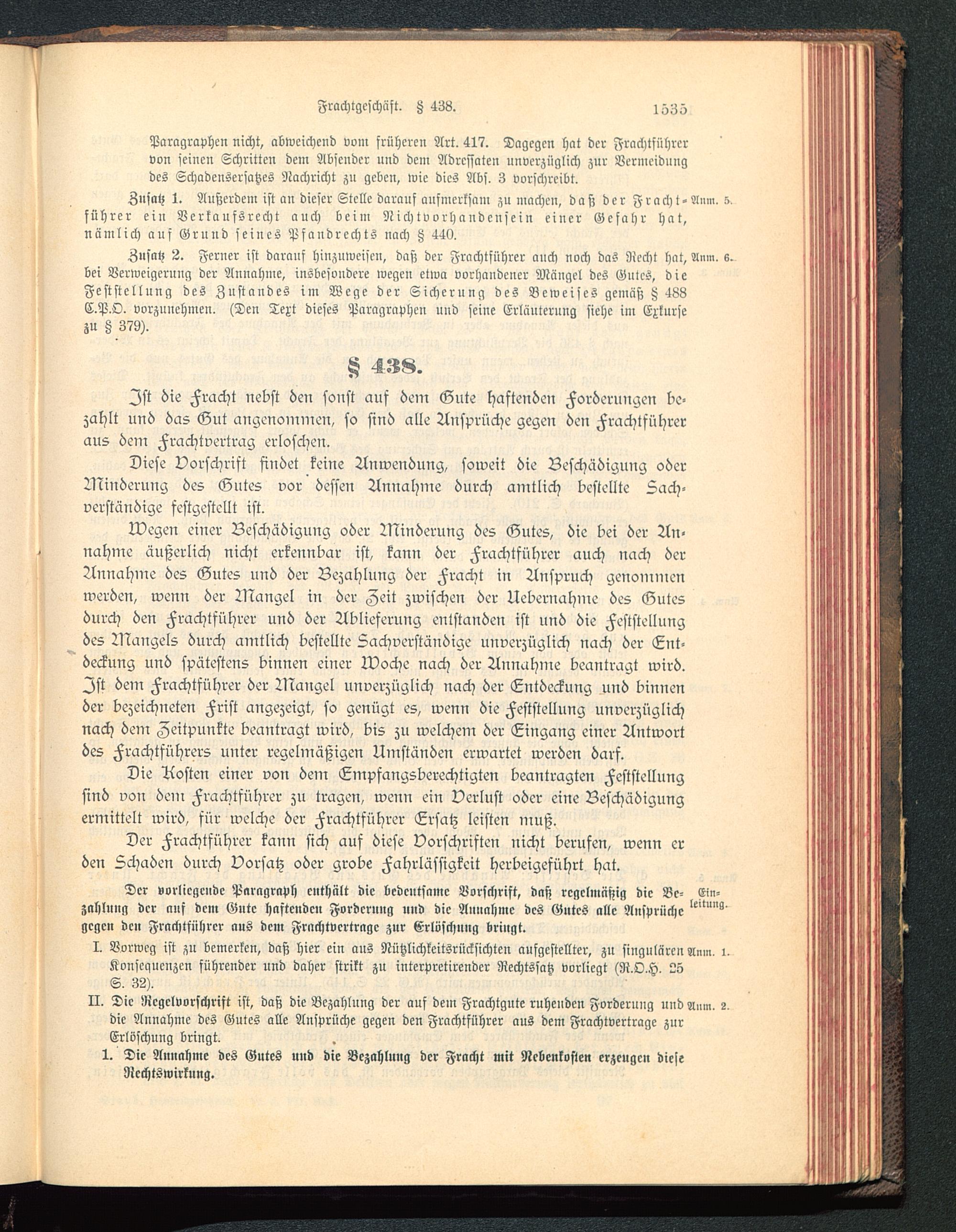 Paragraphen nicht, abweichend vom früheren Art. 417. Dagegen hat der Frachtführervon feinen Schritten dem Absender und dem Adressaten unverzüglich zur Vermeidungdes Schadeusersatzes Nachricht zn geben, wie dies Abs. 3 vorschreibt.Zusatz 1. Außerdem ist au dieser Stelle darauf aufmerksam zu macheu, daß der Fr acht-Am», 5>,führer eiu Verkaufsrecht auch beim NichtVorhandensein einer Gefahr hat,nämlich ans Grund seines Pfandrechts nach Z 44V.