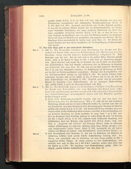 Anm.is. i. Ms, 2.) Die Ansprüche erlöschen trotz Bezahlung der Fracht und An-nahme des Gutes nicht, wenn die Beschädigung oder Minderung vor derAnnahme durck amtlich bestellte Sachverständige festgestellt ist. DieseAusnahme geht sehr weit. Von ihr wird wohl in den meisten Fällen Gebrauch gemachtwerden, svdaß in der Praxis die Regel des Abs. 1 wohl kaum zur Anwendung gelangenwird. Ihrem Wortlaut uach bezieht sich die Borschrift nur auf die Fälle von Quantitäts-oder Qualitätsfehlern, (über diese Begriffe, insbesondere über die Minderung im Gegensatzzum Totalvcrlust siehe unten Anm. 13), nicht auch auf den Fall verspäteter Ablieferung.Und es ist auch keine Möglichkeit vorhanden, die Beschädigung und Minderung des Gutesauf den Fall des Vcrspätnugsfchadens auszudehnen. Analogie aber ist ausgeschlossen, weileine Ansnahmcvorschrift vorliegt (so anch Cosack S. 445). Die amtlich bestellten Sach-verständigen brauchen nicht kck Iwo bestellt zu sein, es können auch ein für alle Mal be-stellte Sachverständige sein (Denkschrift S. 262). Natürlich genügt trotz des gebrauchtenPlurals die Zuziehung eines Sachverständigen. Ist der zugezogene Sachverständigenicht amtlich bestellt, so greift die Ansnahmcvorschrift nicht Platz.