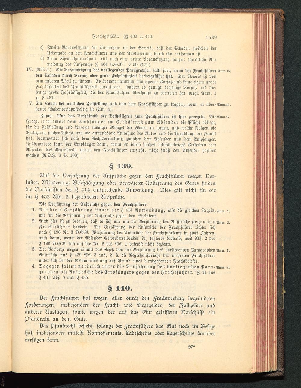 Zusatz. Nur das Verhältniß der Bcthciligten zum Frachtführer ist hier geregelt. Die Anm.i?.Frage, inwieweit dem Empfänger im Verhältniß zum Absender die Pflicht obliegt,für die Feststellung und Anzeige etwaiger Mängel der Waare zu sorgen, und welche Folgen dieVerletzung solcher Pflicht und die anstandslose Annahme des Gutes uud die Bezahlung der Frachthat, beantwortet sich nach dem Ncchtsvcrhältuiß zwischen dem Absender und dem Empfänger.Insbesondere kann der Empfänger dann, wenn er durch solches pflichtwidriges Verhalten demAbsender das Regreßrecht gegen den Frachtführer entzieht, nicht selbst den Absender haftbarmachen (R.O.H. 6 S. 108).