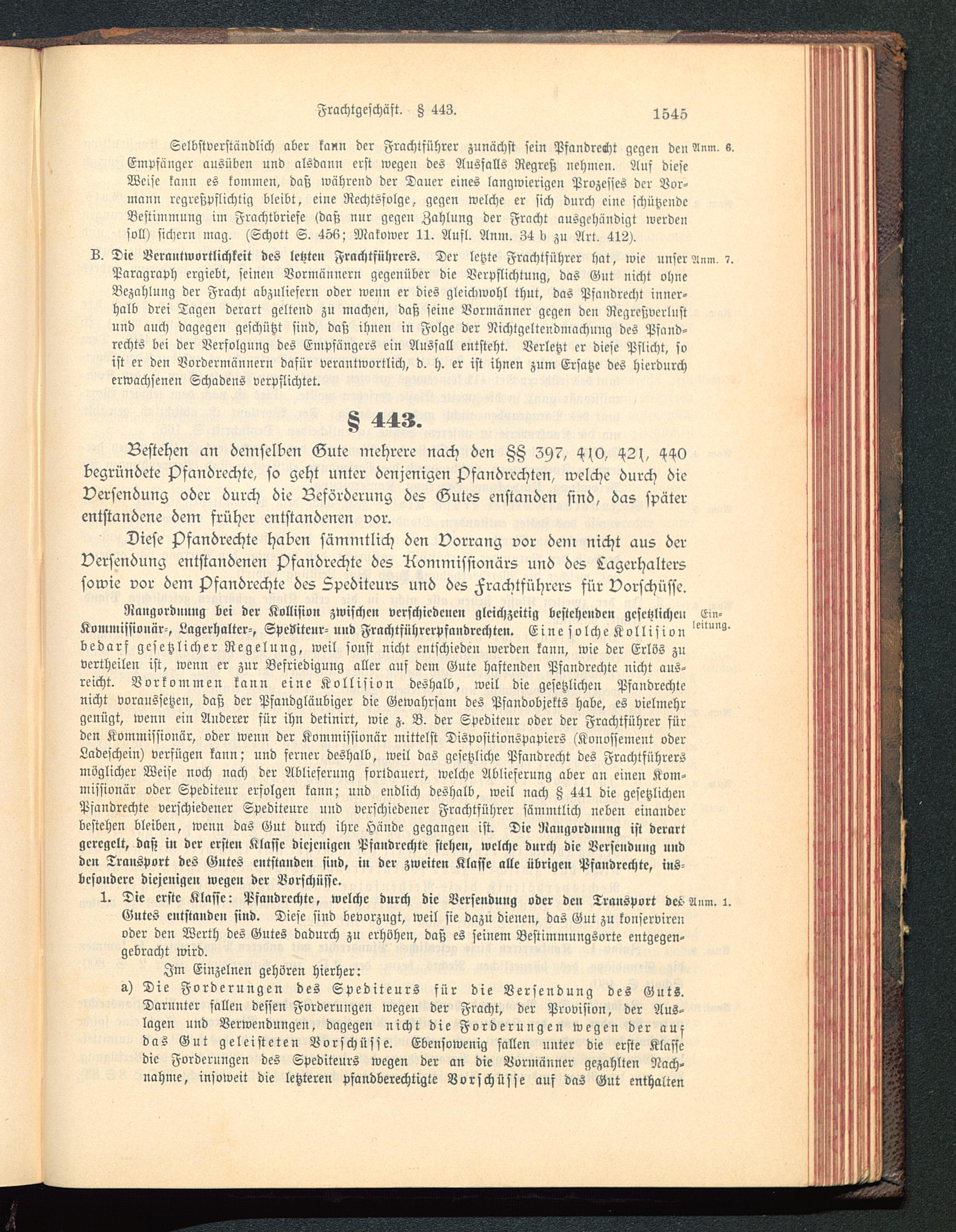 Selbstverständlich aber kann der Frachtführer zunächst sein Pfandrecht gegen den Anm. «,Empfänger ausüben und alsdann erst wegen des Aussalls Regreß nehmen. Auf diefeWeise kann es kommen, daß während der Dauer eines langwierige» Prozesses der Vor-mann regreßpflichtig bleibt, eine Rechtsfolge, gegen welche er sich durch eiuc schützendeBestimmung im Frachtbriefe <daß nur gegen Zahlung der Fracht ausgehändigt werdensoll) sichern mag. (Schott S. 456; Makowcr 11. Aufl. Anm. 34 b zu Art. 412).L. Die Verantwortlichkeit des letzten Frachtführers. Der letzte Frachtführer hat, wie unser Anm, ?.Paragraph ergiebt, seinen Vormännern gegenüber die Verpflichtung, das Gnt nicht ohneBezahlung der Fracht abzuliefern oder wenn er dies gleichwohl thut, das Pfandrecht inner-halb drei Tagen derart geltend zu machen, daß seine Vormänncr gegen den Rcgreßvcrlustuud auch dagegen geschützt sind, daß ihnen in Folge der Nichtgcltcndmachnng des Pfand-rechts bei der Verfolgung des Empfängers ein Ausfall entsteht. Verletzt er diese Pflicht, soist er den Vordermännern dafür verantwortlich, d. h. er ist ihnen zum Ersatze des hierdurcherwachsenen Schadens verpflichtet.