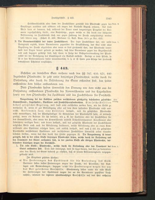 Rangordnung bei der Kollision zwischen verschiedenen gleichzeitig bestehenden gescylicheu i5>n-Komlttissionnr-, Lagerhalter-, SpcSitcur-und Frachtfnhrerpfandrechten. Eine solche Kollision """'2'bedarf gesetzlicher Regelung, weil sonst nicht entschieden werden kauu, wie der Erlös zuvertheilen ist, weun er znr Befriedigung aller auf dem Gute hastenden Pfandrechte nicht aus-reicht. Vorkommen kann eine Kollision deshalb, weil die gesetzlichen Pfandrechtenicht voraussetzen, daß der Pfandgläubiger die Gewahrsam des Pfandobjekts habe, es vielmehrgenügt, wenn ein Anderer für ihn detinirt, wie z. B. der Spediteur oder der Frachtführer fürden Kommissionär, oder wenn der Kommissionär mittelst Dispositionspapiers (Konossement oderLadeschein) verfügen kann? und ferner deshalb, weil das gesetzliche Pfandrecht des Frachtführersmöglicher Weife noch nach der Ablieferung fortdauert, welche Ablieferung aber an einen Kom-missionär oder Spediteur ersolgen kann; und endlich deshalb, weil nach ß 441 die gesetzlichenPfandrechte verschiedener Spediteure uud verschiedener Frachtführer sämmtlich neben einanderbestehen bleiben, wenn das Gut durch ihre Häude gegangen ist. Die Rangordnung ist derartgeregelt, daß in der ersten jilassc diejenigen Pfandrechte stehen, welche durch die Versendung undden Transport des Gutes entstanden sind, in der zweiten Klasse alle übrigen Pfandrechte, ins-besondere diejenigen wegen der Vorschüsse.