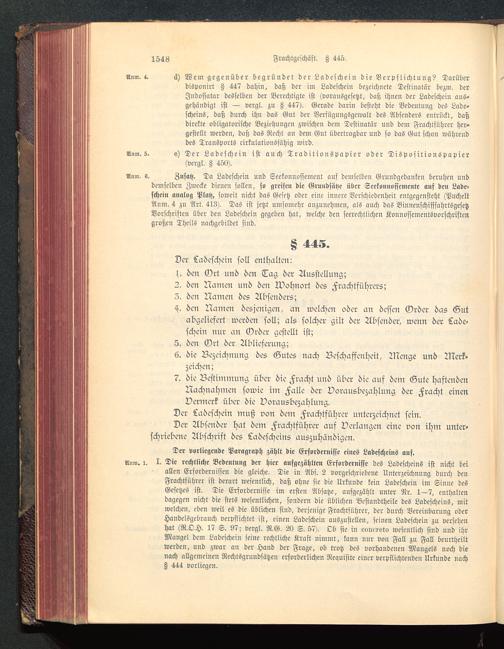 Der vorliegende Paragraph zählt die Erfordernisse eines Ladescheins auf.Sl»m. i. I. Die rechtliche Bcdentnng der hier aufgezählten Erfordernisse des Ladescheins ist nicht beiallen Erfordernissen die gleiche. Die in Abs. 2 vorgeschriebene Unterzeichnung durch denFrachtführer ist derart wesentlich, daß ohne sie die Urkunde kein Ladeschein im Sinne desGesetzes ist. Die Erfordernisse im ersten Absätze, aufgezählt unter Nr. 1—7, enthaltendagegen nicht die stets wesentlichen, sondern die üblichen Bestandtheile des Ladescheins, mitwelchen, eben weil es die üblichen sind, derjenige Frachtführer, der durch Vereinbarung oderHandclsgebrauch verpflichtet ist, einen Ladeschein auszustellen, seinen Ladeschein zu versehenhat (R.O.H. 17 S. 97; vergl. R.G. 20 S. 57). Ob sie in eonvieto wesentlich sind und ihrMangel dein Ladeschein seine rechtliche Kraft nimmt, kann mir von Fall zn Fall beurtheiltwerden, und zwar au der Hand der Frage, ob trotz des vorhandenen Mangels noch dienach allgemeinen Rechtsgrnndsätzen erforderlichen Requisite einer verpflichtenden Urkunde nachZ 444 vorliegen.