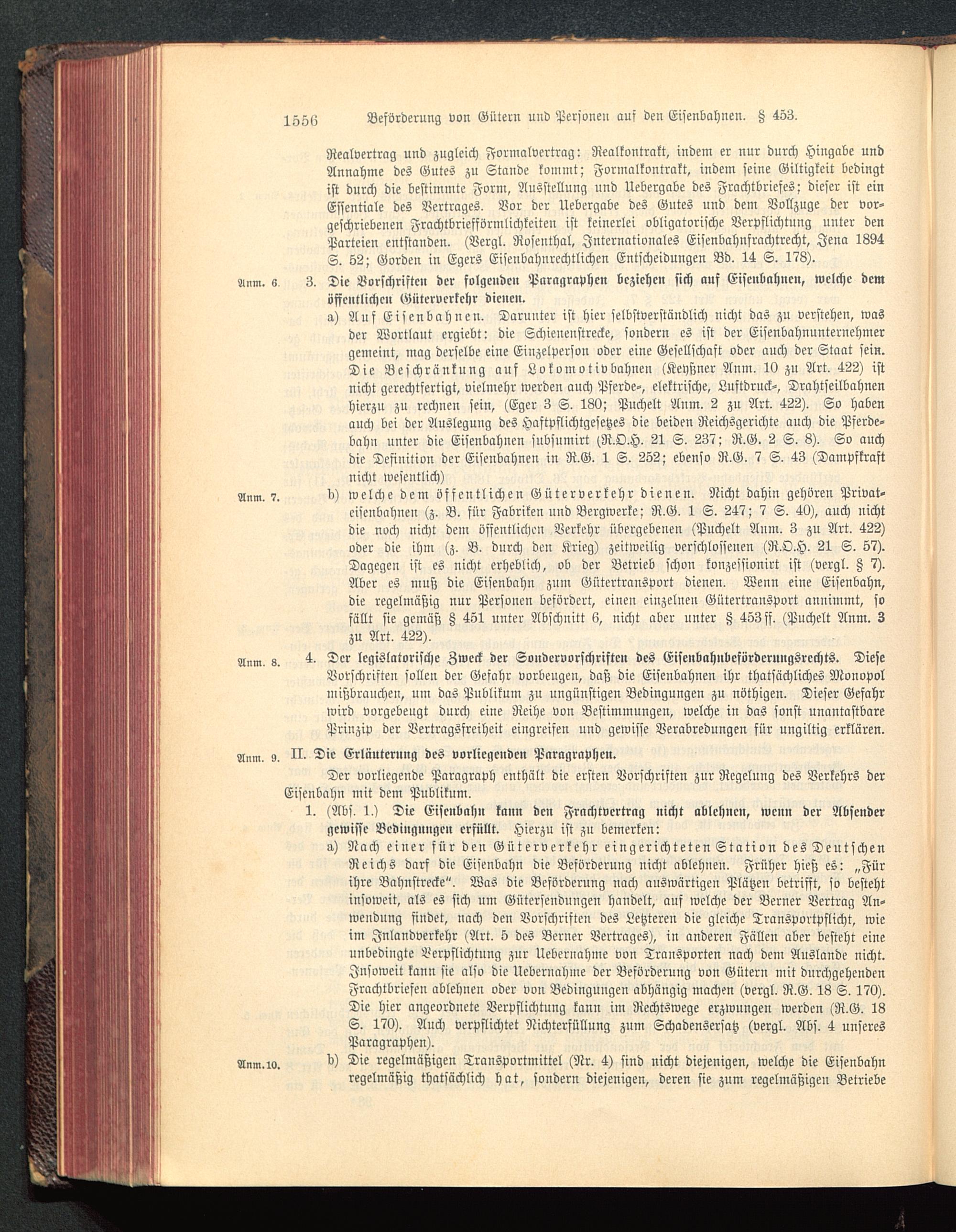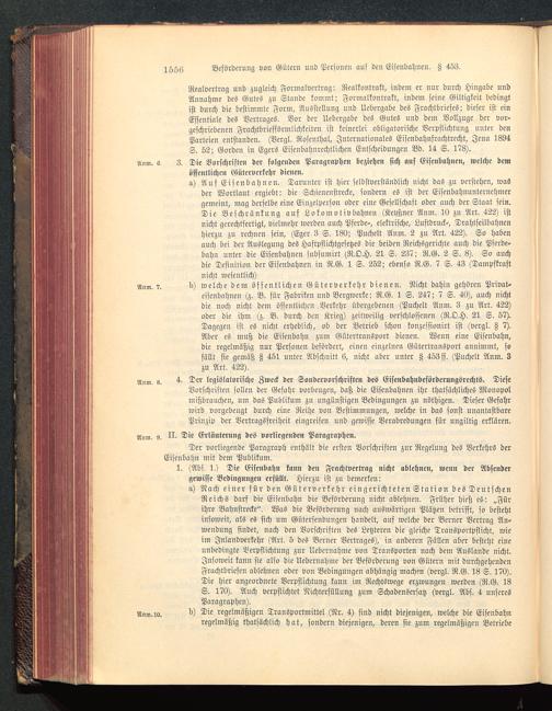 Anm. ?. b) welche dem öffentlichen Güterverkehr dienen. Nicht dahin gehören Privat-eisenbahnen (z, B, für Fabriken und Bergwerke; R,G. 1 S. 247; 7 S. 40), auch nichtdie noch nicht dem öffentlichen Verkehr übergebenen (Pnchelt Anm. 3 zu Art. 422)oder die ihm (z. B. durch den Krieg) zeitweilig verschlossenen (R.O.H. 21 S. 57).Dagegen ist es nicht erheblich, ob der Betrieb schon konzessionirt ist (vergl. Z 7).Aber es muß die Eisenbahn zum Gütertransport dienen. Wenn eine Eisenbahn,die regelmäßig nur Personen befördert, einen einzelnen Gütertransport annimmt, sofällt sie gemäß ß 451 unter Abschnitt 6, nicht aber unter Z 453 ff, (Puchelt Anm. 3zu Art. 422).