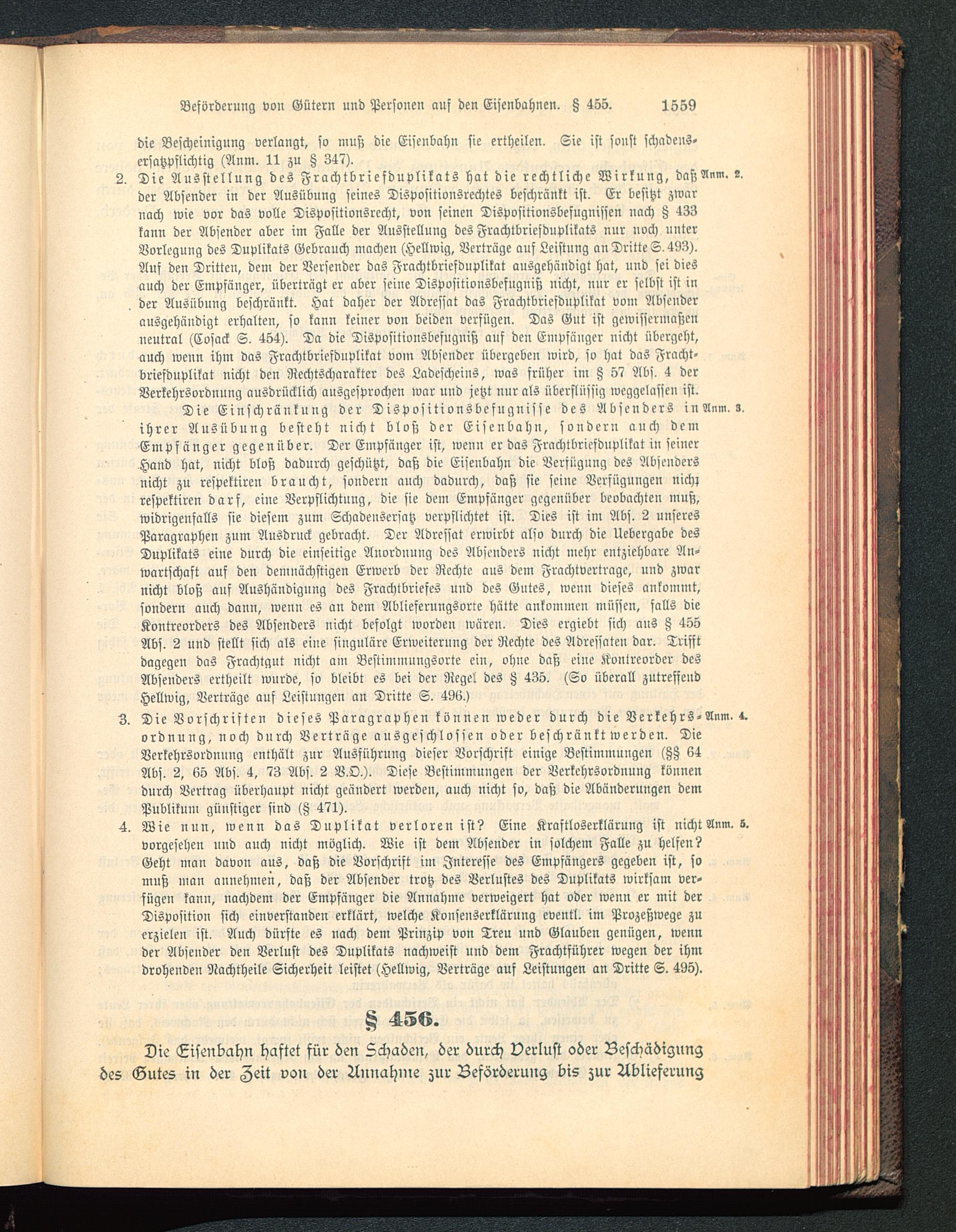 2. Die Ausstellung des Frachtbriefduplikats hat die rechtliche Wirkung, daß Anm. ?.der Absender in der Ausübung seines Dispositionsrechtes beschränkt ist. Er besitzt zwarnach wie vor das volle Dispositionsrccht, von seinen Dispositionsbefugnissen nach H 433kann der Absender aber im Falle der Ausstellung des Frachtbricsduplikats nur uoch uiitcrVorlegung des Duplikats Gebrauch macheu (Hellwig, Verträge auf Leistung an Dritte S. 493).Auf den Dritten, dem der Versender das Frachtbricsduplikat ausgehändigt hat, und sei diesauch der Empfänger, überträgt er aber seine Dispositionsbcfuguiß nicht, nur er selbst ist inder Ausübung beschränkt. Hat daher der Adressat das Frachtbriefdnplikat vom Absenderausgehändigt erhalten, so kann keiner von beiden verfügen. Das Gnt ist gewissermaßenneutral (Cosack S. 454). Da die Dispositionsbcfngniß ans den Empfänger nicht übergeht,auch wenn ihm das Frachtbriefduplikat vom Absender übergebe» wird, so hat das Fracht-briefduplikat nicht den Rechtscharaktcr des Ladescheins , was früher im Z 57 Abs. 4 derVerkehrsordnnng ausdrücklich ausgesprochen war und jetzt mir als überflüssig weggelassen ist.