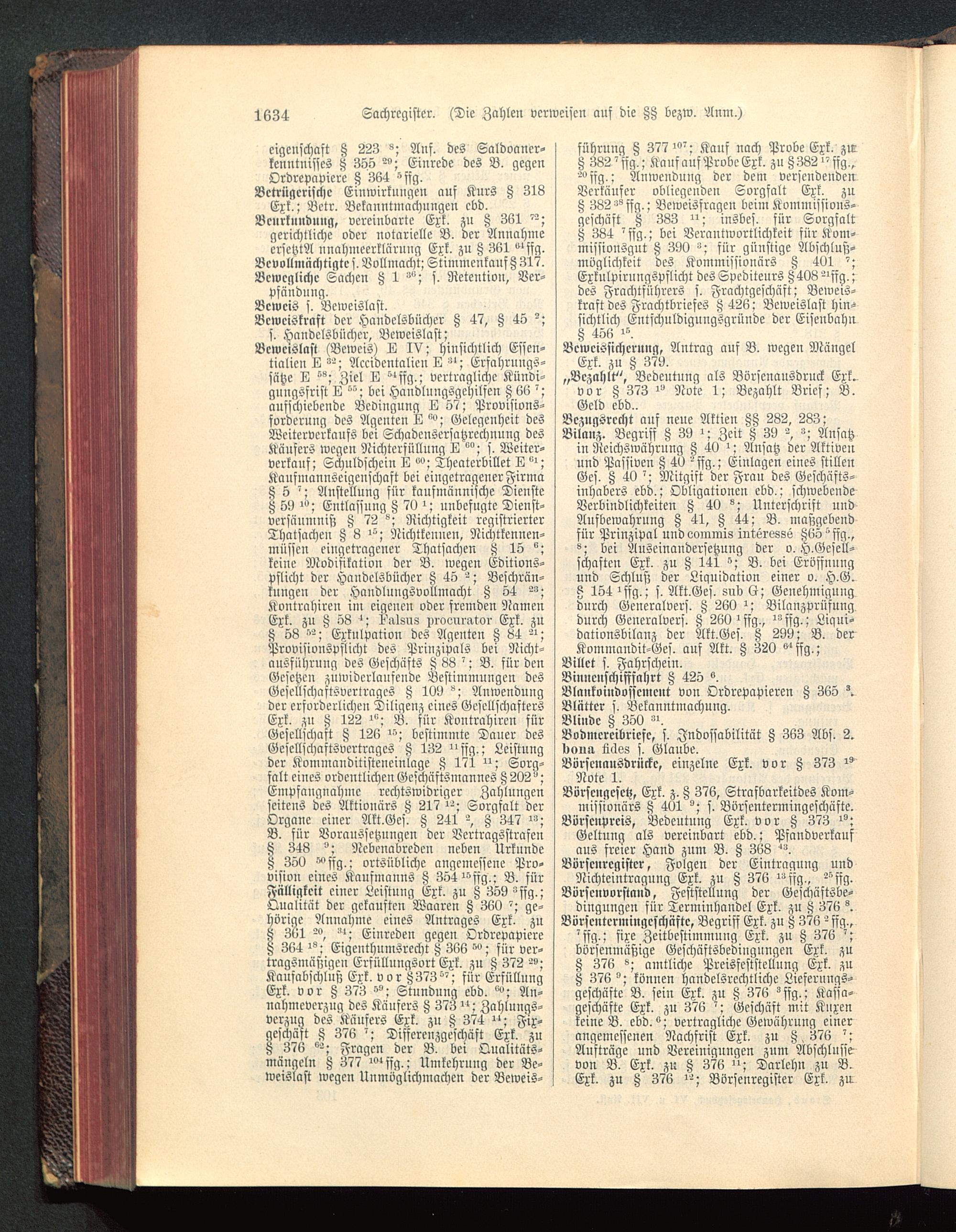 Bcwcislast (Beweis) 12 IV; hinsichtlich Esscn-tialien L "-; Accidentalien 12 ">; Erfahrnngs-fätze 12 ""; Ziel 12 "ffg.; vertragliche Kündi-gungsfrist 12 ""; bei Handlungsgehilfen ß 66aufschiebende Bedingung 12 57 : Provisions-fordcruug des Agenten L"»; Gelegenheit desWeiterverkaufs bei Schadensersatzrechnung desKäufers wegen Nichterfüllung 12 °°; f. Weiter-verkauf; Schuldschein 12 »°; Theatcrbillet 12 ">;Kaufmannscigcuschaft bei eingetragener Firma§ 5 '; Austeilung für kaufmännische Dienste8 59 "'; Entlassung H 70 ^; unbefugte Dienst-versäumuiß Z 72 "; Richtigkeit registrierterThatsachen s 3 ^; Richtkcuueu, Nichtkcnncn-müsscn eingetragener Thatsachen A 15 °;keine Modifikation der B. wegen Editions-pflicht der Handelsbüchcr K 45 '->; Beschrän-kungen der Handlungsvollmacht Z 54 "°;Kontrahiren im eigenen oder fremden NamenExk. zu ß 58 '; i'alsns proenrator Exk. zu8 58 '^; Exkulpatiou des Ageuteu ß 84 '-";Provisionspsiicht des Prinzipals bei Nicht-ansführuug des- Geschäfts 8 88 '; B. für denGesetzen zuwidcrlauscudc Bestimmungen desGesellschaftsvertragcs Z 109 ^; Anwendungder erforderlichen Diligenz eines GesellschaftersExk. zn § 122 "'; B. für Kontrahiren fürGesellschaft H 126 '»; bcstimnite Dauer desGesellschaftsvertragcs Z 132 "ffg.; Leistungder Kommanditisteneinlage § 171 "; Sorg-falt eines ordentlichen Geschäftsmannes §202";Empfaugnahmc rechtswidriger Zahlungenfeitens des Aktionärs § 217'^; Sorgfalt derOrgane einer Akt.Ges. Z 241 Z 347 ";B. für Vorausfetzungen der VertragsstrafenZ 348 °; Ncbeuabredeu neben UrkundeZ 350 ^sfg.; ortsübliche angemessene Pro-vision eines Kanfmauus ß 354 ^^sfg.: B. fürFälligkeit ciuer Leistung Exk. zn Z 359 °ffg.;Qualität der gekauften Waaren Z 360 ^; ge-hörige Annahme eines Antrages Exk. zu8 361 ">; Einreden gegen OrdrepapiereZ 364 ^; Eigenthumsrecht K 366 °»; für ver-tragsmäßigen Erfüllungsort Exk. zu § 372 -°;Kanfabschlnsz Exk. vor Z373^; für ErfüllungExk. vor Z 373 °°; Stundung ebd. ^; An-nahmcvcrzug des Käufers § 373 "; Zahlungs-verzna des Äänfers Exk. zu Z 374 "; Fix-geschäft 8 376 '; Disfcreuzgeschäft Exk. zuß 376 °-; Fragen der B. bei Qualitäts-mangeln Z 377 ""ffg.; Umkehrnng der Be-wcislast wegen Unmöglichmachcn der Beweis-