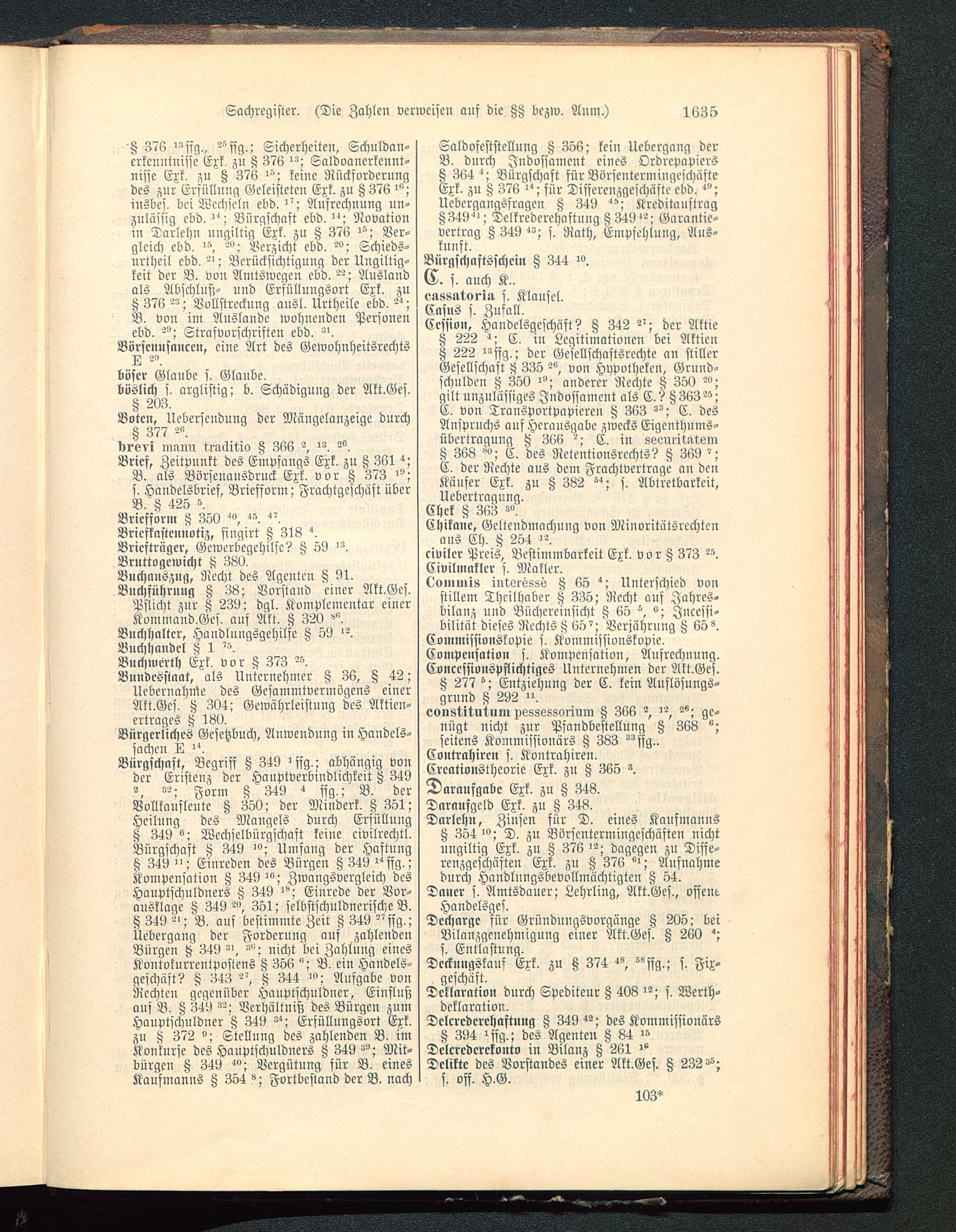 Bürgschaft, Begriff Z 349 >sfg.; abhängig vonder Eristenz der Hanptverbindlichkeit § 3492, »2. Fgr„i § 349 ffg.; B. derVollkauslcnte ß 350; der Minderk. Z 351;Heilung des Mangels durch ErfüllungH 349 °; Wechselbürgschaft keine civilrechtl.Bürgschaft iz 349 -"; Umfang der Haftungß 349 "; Einreden des Bürgen Z 349 "ffg.;Kompensation § 349 -"; Zwangsvcrglcich desHauptschuldners Z 349 ^; Einrede der Vor-ausklage Z 349 -", 351; selbstschuldncrischc B.§ 349 --; B. auf bestimmte Zeit Z 349 -'ffg.;Üebergang der Forderung auf zahlendenBürgen 349 »>, »"; nicht bei Zahlung einesKontokurrentpostens Z 356 "; B. ein Handels-geschäft? K 343 ß 344 -"; Aufgabe vonRechten gegenüber Hauptschnldner, Einflnßaus B. K 349 »-; Vcrhältnih des Bürgen zumHonptschuldner Z 349 »-; Erfüllungsort Exk.zu Z 372 "; Stellung des zahlenden B. imKonkurse des Hauptjchulduers Z 349 »"; Mit-bürgeu A 349 "'; Vergütung für B. einesKaufmanns Z 354 »; Fortbestand der B. nach