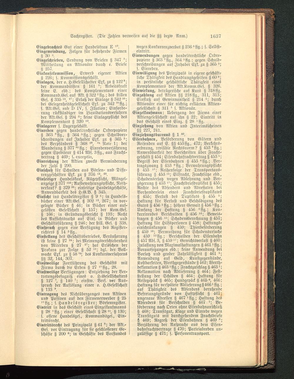 Eisenbahnen, Beförderung von Gütern undReisenden auf E. 88 453ssg., 472; VcrkchrS-ordnnng, rcvisiblc Rechtsnorm? 8 453'ssg.;Anwendbarkeit der Vorschristcn über Fracht-geschäft 8 454; Eifenbahnfrachtvertrag § 453 °>;Begriff der Eisenbahnen 8 453 "ssg.; Vcr-tragszwanz 8 453 "ffg.; Vcrwahruugspslicht8 453 >"; Reihenfolge der TranSpvrtaus-sührung 8 453 "; Eilfracht, Frachtsätze ebd.,Schadensersatz wegen Ablehnung uud Ver-zögerung 8 4ü3 ^'; Frachtbricsduplikat 8 455;Rechte des Absenders und Adressaten beiVorhandensein eines Frachtbricsdnplikates§ 455; Verlust des Duplikats ß 455 -'>;Haftung für Verlust und Beschädigung desGutes 8 456 -ssg.; höhere Gewalt 8456 ^ ssg.;Umfang der Haftung 8 456 -sfg.; Kon-knrrircndcs Vcrfchuldcn 8 456 "; Bewcis-fragen 8 456 ">; Schadensbcrcchnuug 8 457;Haftung für Hilfspersoncn 8 458; HaftnngS-einschränkungeu 8 459; Thicrbeförderiing8 459 >"; Vermuthung für Schadensnrsache8 459 --ssg.; Verschulden der Eisenbahn8 457 Abs. 3, 8459--; Gewichtsverlust 8460;Zulassung von Mnximalhaftungcn 8 461 -ffg.;Voraussetzungen ebd.; keine Anwendung beiVorsatz nud grober Fahrlässigkeit 8 461 °;Anwendung auf Geld, Kunstgegcustäudc,Kostbarkeit«', Werthgegcnstäude 8462; Werth-dcklaration 8 463 - sfa.; Frachtzuschlag 8 463 -;Reklamation nach Ablieferung 8 464; Fest-stellung der Schäden 8 464; Haftung fürReisegepäck 8 465; Handgepäck 8 465", 466;Haftung sür verspätete Ablieferung 8466 > flg.;auf Thätigkeit des Absenders beruhendeBefrciuugsgründe von Haftpflicht 8 467;ungenaue Adressen 8 467 >sfg.; Haftung desAbsenders für Verschulden 8 467 '; Be-förderung nach Orten ohne Eisenbahnanfchlnß8 468; Transitgut, Klage und Einrede wegenTransitguts mit durchgehendem Frachtbriefe8 469; Regreß der Eisenbahnen 8 469 ";Verjährung der Ansprache aus dem Eisen-bahnfrachtvcrtrage 8 470; Partciabredcn un-zulässige 8 471; f. Personentransport.