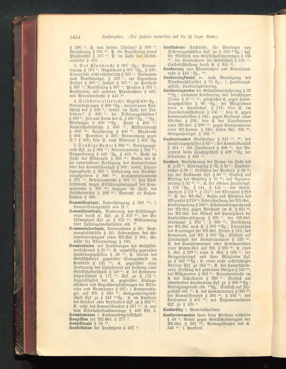 Konkurs, Veräußerung der Firma im Falle desK. 8 22 ": Eintragung 8 32, 8 34 »; Haudcls-bücher 8 38 »; Erlöschen der Prokura 8S2-2;dgl. der Vollmacht Exk. 8 58 -»; Einfluß aufBertrag der Gehilfen 8 7V -"; auf Agentur-vertrag 8 92 ->; K. der offenen Handelsges.8 131 »ffg., 8 144, 8 145 °; des Gesell-schafters 8 131'», 8 137"? des Aktionärs § 218'2; K. der Akt.Ges.! Rechte und Pflichten desAktionärs 8213-»;Ucbcrschuldung derAkt.Ges.,Konkursautrag 8 240»; Schadcnsersatzanspruchder Akt.Gcs. gegen Vorstand im K. 8 241-°;der Akt.Ges. vor Ablauf des Sperrjahres beiKapitalshcrabsctzuug 8 291 -; der Akt.Ges.überhaupt 8 292 8 306 -«; Fortsctznngder Akt.Ges. nach K. 8 307 -»ffg.; Unterlassendes K.autrages bei Akt.Ges. Strafe 8 315; desKommaud. auf Akt. § 330'>ffg.; Einfluß aufSolidarhaft des Komplementärs 8 320 ">»;K. des Komplementars oder Kommandisteneiner Komm.Ges. auf Akt. 8 330 «>; K. einesst. Ges. 8 339": einer st. Ges. 8 340 derGclegenheitsges. und ihrer Mitglieder Exk.zu 8 342 "''ffg.: K. eines nicht rechtsfähigenVereins Exk. zu 342 K. des Hauptschuld-ucrs, Stellung des zahlenden Bürgen 8 349 ^;des Assignantcn 8 363 ''': Retentionsrecht imK- des Schuldners 8 369 '": Einfluß aufschwebenden Kaufvertrag Exk. zu 8 382 »»ffg.;Verfolgungsrecht ebd. '»ffg.; Einfluß auf Fix-geschäft ebd. "; K. des Kommittenten 8 333 "-;des Kommissionärs 8 383 8 392 "; desVersenders 8 407 --; des DepotvcrwahrersExk. zu § 424