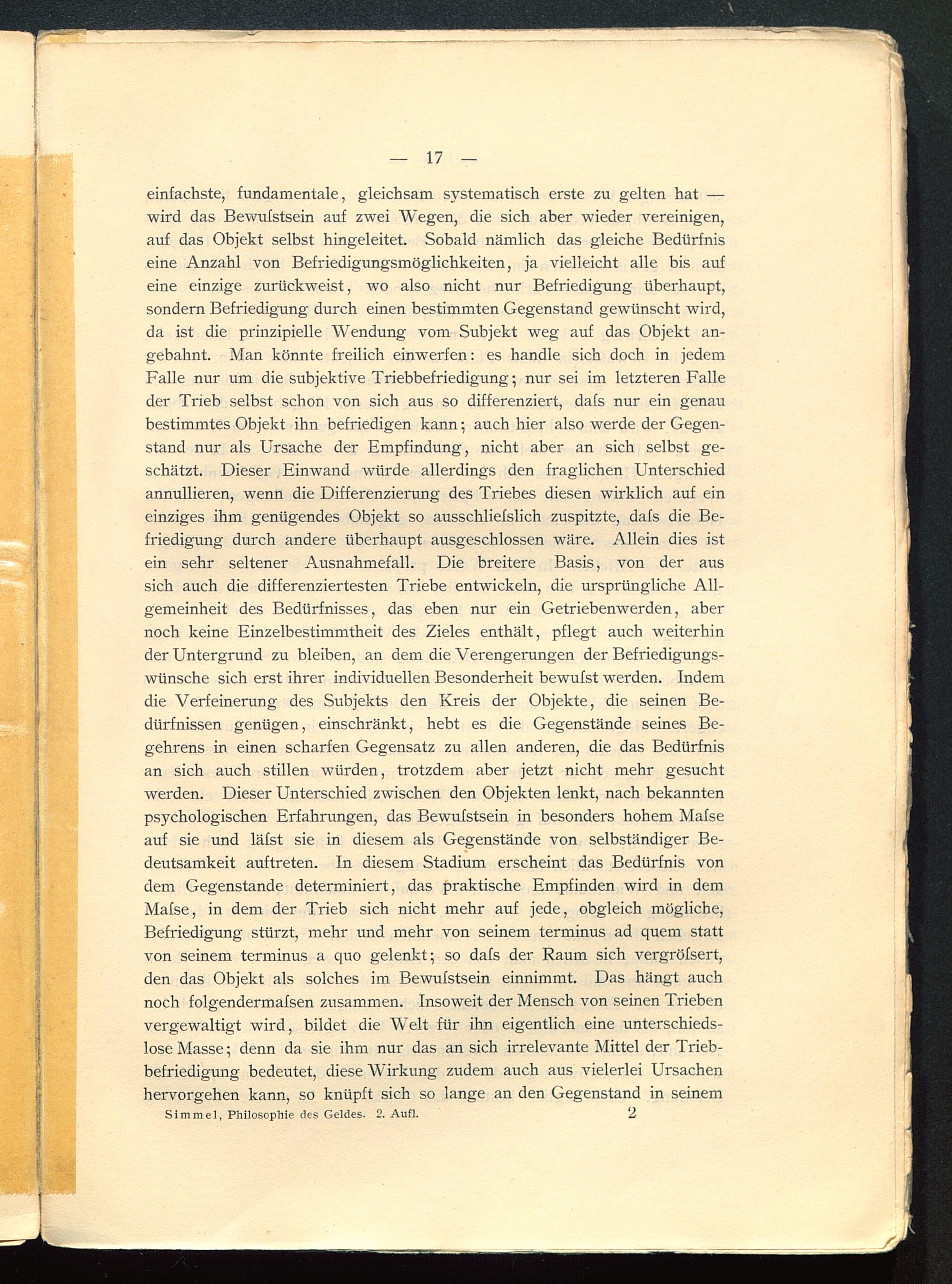 einfachste, fundamentale, gleichsam systematisch erste zu gelten hat —wird das Bewufstsein auf zwei Wegen, die sich aber wieder vereinigen,auf das Objekt selbst hingeleitet. Sobald nämlich das gleiche Bedürfniseine Anzahl von Befriedigungsmöglichkeiten, ja vielleicht alle bis aufeine einzige zurückweist, wo also nicht nur Befriedigung überhaupt,sondern Befriedigung durch einen bestimmten Gegenstand gewünscht wird,da ist die prinzipielle Wendung vom Subjekt weg auf das Objekt an-gebahnt. Man könnte freilich einwerfen: es handle sich doch in jedemFalle nur um die subjektive Triebbefriedigung; nur sei im letzteren Falleder Trieb selbst schon von sich aus so differenziert, dafs nur ein genaubestimmtes Objekt ihn befriedigen kann; auch hier also werde der Gegen-stand nur als Ursache der Empfindung, nicht aber an sich selbst ge-schätzt. Dieser Ein wand würde allerdings den fraglichen Unterschiedannullieren, wenn die Differenzierung des Triebes diesen wirklich auf eineinziges ihm genügendes Objekt so ausschliefslich zuspitzte, dafs die Be-friedigung durch andere überhaupt ausgeschlossen wäre. Allein dies istein sehr seltener Ausnahmefall. Die breitere Basis, von der aussich auch die differenziertesten Triebe entwickeln, die ursprüngliche All-gemeinheit des Bedürfnisses, das eben nur ein Getriebenwerden, abernoch keine Einzelbestimmtheit des Zieles enthält, pflegt auch weiterhinder Untergrund zu bleiben, an dem die Verengerungen der Befriedigungs-wünsche sich erst ihrer individuellen Besonderheit bewufst werden. Indemdie Verfeinerung des Subjekts den Kreis der Objekte, die seinen Be-dürfnissen genügen, einschränkt, hebt es die Gegenstände seines Be-gehrens in einen scharfen Gegensatz zu allen anderen, die das Bedürfnisan sich auch stillen würden, trotzdem aber jetzt nicht mehr gesuchtwerden. Dieser Unterschied zwischen den Objekten lenkt, nach bekanntenpsychologischen Erfahrungen, das Bewufstsein in besonders hohem Mafseauf sie und läfst sie in diesem als Gegenstände von selbständiger Be-deutsamkeit auftreten. In diesem Stadium erscheint das Bedürfnis vondem Gegenstände determiniert, das praktische Empfinden wird in demMafse, in dem der Trieb sich nicht mehr auf jede, obgleich mögliche,Befriedigung stürzt, mehr und mehr von seinem terminus ad quem stattvon seinem, terminus a quo gelenkt; so dafs der Raum sich vergröfsert,den das Objekt als solches im Bewufstsein einnimmt. Das hängt auchnoch folgendermafsen zusammen. Insoweit der Mensch von seinen Triebenvergewaltigt wird, bildet die Welt für ihn eigentlich eine unterschieds-lose Masse; denn da sie ihm nur das an sich irrelevante Mittel der Trieb-befriedigung bedeutet, diese Wirkung zudem auch aus vielerlei Ursachenhervorgehen kann, so knüpft sich so lange an den Gegenstand in seinemSimmel, Philosophie des Geldes. 2. Aufl. 2