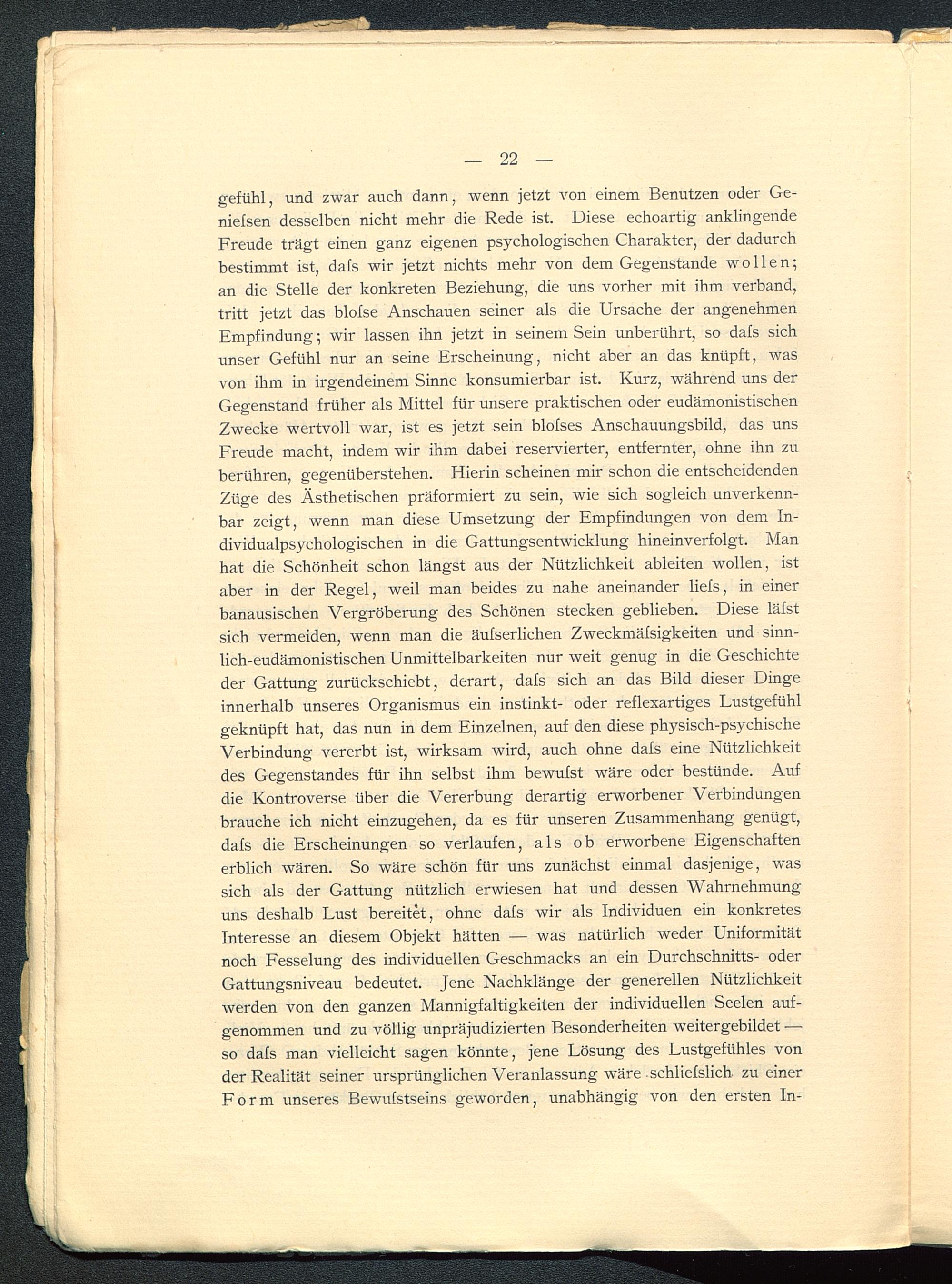 gefühl, und zwar auch dann, wenn jetzt von einem Benutzen oder Ge-niefsen desselben nicht mehr die Rede ist. Diese echoartig anklingendeFreude trägt einen ganz eigenen psychologischen Charakter, der dadurchbestimmt ist, dals wir jetzt nichts mehr von dem Gegenstände wollen;an die Stelle der konkreten Beziehung, die uns vorher mit ihm verband,tritt jetzt das blolse Anschauen seiner als die Ursache der angenehmenEmpfindung; wir lassen ihn jetzt in seinem Sein unberührt, so dafs sichunser Gefühl nur an seine Erscheinung, nicht aber an das knüpft, wasvon ihm in irgendeinem Sinne konsumierbar ist. Kurz, während uns derGegenstand früher als Mittel für unsere praktischen oder eudämonistischenZwecke wertvoll war, ist es jetzt sein blofses Anschauungsbild, das unsFreude macht, indem wir ihm dabei reservierter, entfernter, ohne ihn zuberühren, gegenüberstehen. Hierin scheinen mir schon die entscheidendenZüge des Ästhetischen präformiert zu sein, wie sich sogleich unverkenn-bar zeigt, wenn man diese Umsetzung der Empfindungen von dem In-dividualpsychologischen in die Gattungsentwicklung hineinverfolgt. Manhat die Schönheit schon längst aus der Nützlichkeit ableiten wollen, istaber in der Regel, weil man beides zu nahe aneinander liefs, in einerbanausischen Vergröberung des Schönen stecken geblieben. Diese läfstsich vermeiden, wenn man die äufserlichen Zweckmäfsigkeiten und sinn-lich-eudämonistischen Unmittelbarkeiten nur weit genug in die Geschichteder Gattung zurückschiebt, derart, dafs sich an das Bild dieser Dingeinnerhalb unseres Organismus ein instinkt- oder reflexartiges Lustgefühlgeknüpft hat, das nun in dem Einzelnen, auf den diese physisch-psychischeVerbindung vererbt ist, wirksam wird, auch ohne dafs eine Nützlichkeitdes Gegenstandes für ihn selbst ihm bewufst wäre oder bestünde. Aufdie Kontroverse über die Vererbung derartig erworbener Verbindungenbrauche ich nicht einzugehen, da es für unseren Zusammenhang genügt,dafs die Erscheinungen so verlaufen, als ob erworbene Eigenschaftenerblich wären. So wäre schön für uns zunächst einmal dasjenige, wassich als der Gattung nützlich erwiesen hat und dessen Wahrnehmunguns deshalb Lust bereitet, ohne dafs wir als Individuen ein konkretesInteresse an diesem Objekt hätten — was natürlich weder Uniformitätnoch Fesselung des individuellen Geschmacks an ein Durchschnitts- oderGattungsniveau bedeutet. Jene Nachklänge der generellen Nützlichkeitwerden von den ganzen Mannigfaltigkeiten der individuellen Seelen auf-genommen und zu völlig unpräjudizierten Besonderheiten weitergebildet —so dafs man vielleicht sagen könnte, jene Lösung des Lustgefühles vonder Realität seiner ursprünglichen Veranlassung wäre schliefslich zu einerForm unseres Bewufstseins geworden, unabhängig von den ersten In-