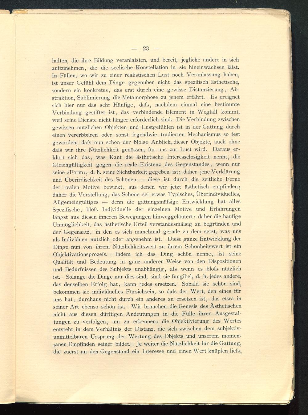 halten, die ihre Bildung veranlalsten, und bereit, jegliche andere in sichaufzunehmen, die die seelische Konstellation in sie hineinwachsen läfst.In Fällen, wo wir zu einer realistischen Lust noch Veranlassung haben,ist unser Gefühl dem Dinge gegenüber nicht das spezifisch ästhetische,sondern ein konkretes, das erst durch eine gewisse Distanzierung, Ab-straktion, Sublimierung die Metamorphose zu jenem erfährt. Es ereignetsich hier nur das sehr Häufige, dafs, nachdem einmal eine bestimmteVerbindung gestiftet ist, das verbindende Element in Wegfall kommt,weil seine Dienste nicht länger erforderlich sind. Die Verbindung zwischengewissen nützlichen Objekten und Lustgefühlen ist in der Gattung durcheinen vererbbaren oder sonst irgendwie tradierten Mechanismus so festgeworden, dafs nun schon der blofse Anblick, dieser Objekte, auch ohnedafs wir ihre Nützlichkeit genössen, für uns zur Lust wird. Daraus er-klärt sich das, was Kant die ästhetische Interesselosigkeit nennt, dieGleichgültigkeit gegen die reale Existenz des Gegenstandes, wenn nurseine »Form«, d. h. seine Sichtbarkeit gegeben ist; daher jene Verklärungund Überirdischkeit des Schönen — diese ist durch die zeitliche Ferneder realen Motive bewirkt, aus denen wir jetzt ästhetisch empfinden;daher die Vorstellung, das Schöne sei etwas Typisches, Überindividuelles,Allgemeingültiges — denn die gattungsmäfsige Entwicklung hat allesSpezifische, blofs Individuelle der einzelnen Motive und Erfahrungenlängst aus diesen inneren Bewegungen hinweggeläutert; daher die häufigeUnmöglichkeit, das ästhetische Urteil verstandesmäfsig zu begründen undder Gegensatz, in den es sich manchmal gerade zu dem setzt, was unsals Individuen nützlich oder angenehm ist. Diese ganze Entwicklung derDinge nun von ihrem Nützlichkeitswert zu ihrem Schönheitswert ist einObjektivationsprozels. Indem ich das Ding schön nenne, ist seineQualität und Bedeutung in ganz anderer Weise von den Dispositionenund Bedürfnissen des Subjekts unabhängig, als wenn es blofs nützlichist. Solange die Dinge nur dies sind, sind sie fungibel, d. h. jedes andere,das denselben Erfolg hat, kann jedes ersetzen. Sobald sie schön sind,bekommen sie individuelles Fürsichsein, so dafs der Wert, den eines füruns hat, durchaus nicht durch ein anderes zu ersetzen ist, das etwa inseiner Art ebenso schön ist. Wir brauchen die Genesis des Ästhetischen nicht aus diesen dürftigen Andeutungen in die Fülle ihrer Ausgestal-tungen zu verfolgen, um zu erkennen: die Objektivierung des Wertesentsteht in dem Verhältnis der Distanz, die sich zwischen dem subjektiv-unmittelbaren Ursprung der Wertung des Objekts und unserem momen-tanen Empfinden seiner bildet. Je weiter die Nützlichkeit für die Gattung,die zuerst an den Gegenstand ein Interesse und einen Wert knüpfen liefs,