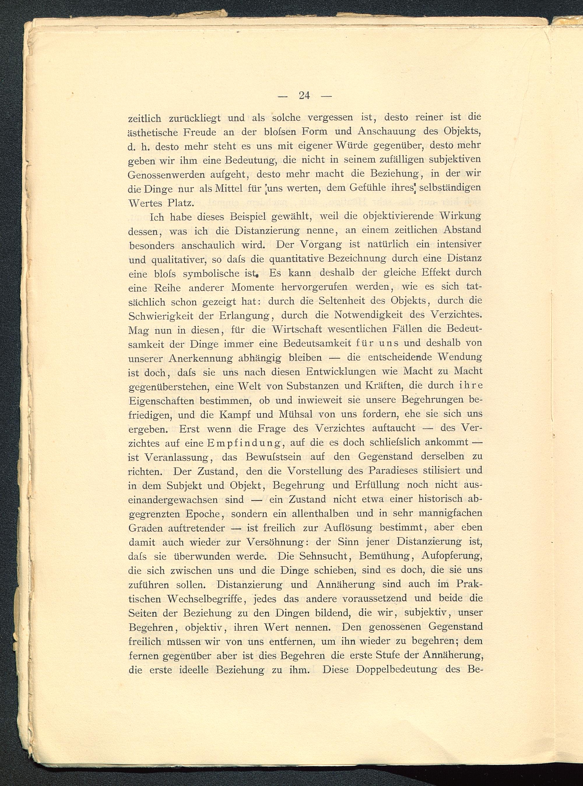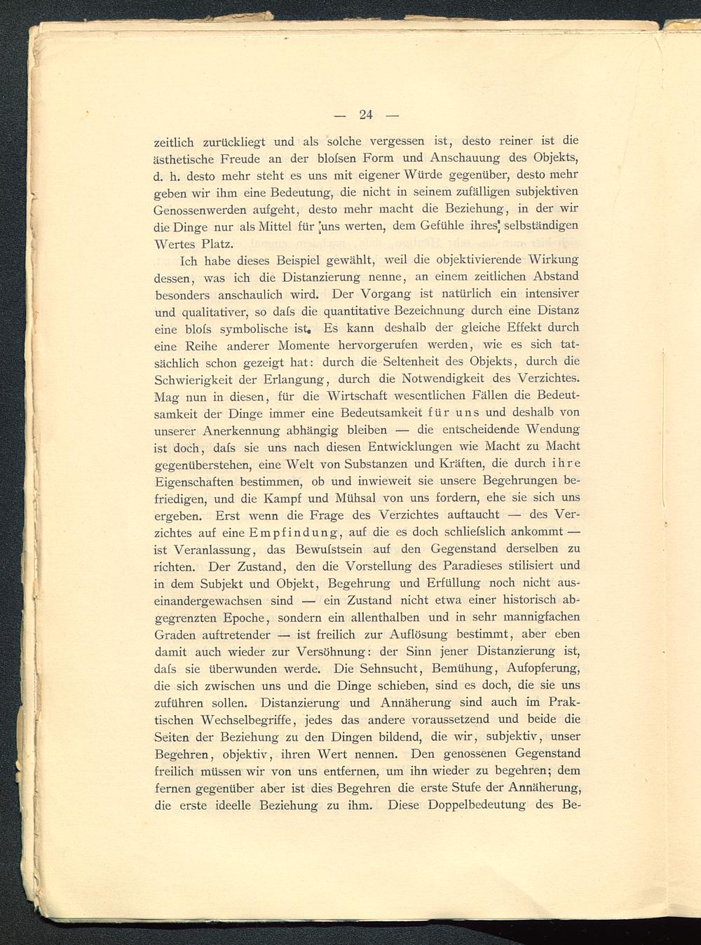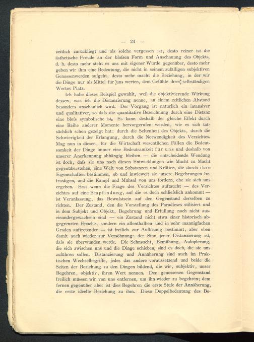 zeitlich zurückliegt und als solche vergessen ist, desto reiner ist dieästhetische Freude an der blolsen Form und Anschauung des Objekts,d. h. desto mehr steht es uns mit eigener Würde gegenüber, desto mehrgeben wir ihm eine Bedeutung, die nicht in seinem zufälligen subjektivenGenossenwerden aufgeht, desto mehr macht die Beziehung, in der wirdie Dinge nur als Mittel für [uns werten, dem Gefühle ihres) selbständigenWertes Platz.
