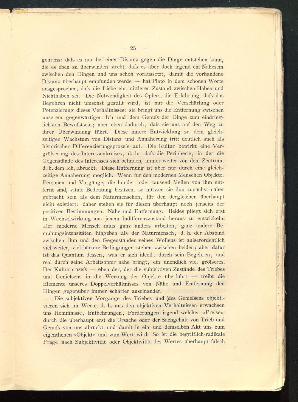 Die subjektiven Vorgänge des Triebes und 'des Geniefsens objekti-vieren sich im Werte, d. h. aus den objektiven Verhältnissen erwachsenuns Hemmnisse, Entbehrungen, Forderungen irgend welcher »Preise«,durch die überhaupt erst die Ursache oder der Sachgehalt von Trieb undGenufs von uns abrückt und damit in ein und demselben Akt uns zumeigentlichen »Objekt« und zum Wert wird. So ist die begrifflich-radikaleFrage nach Subjektivität oder Objektivität des Wertes überhaupt falsch