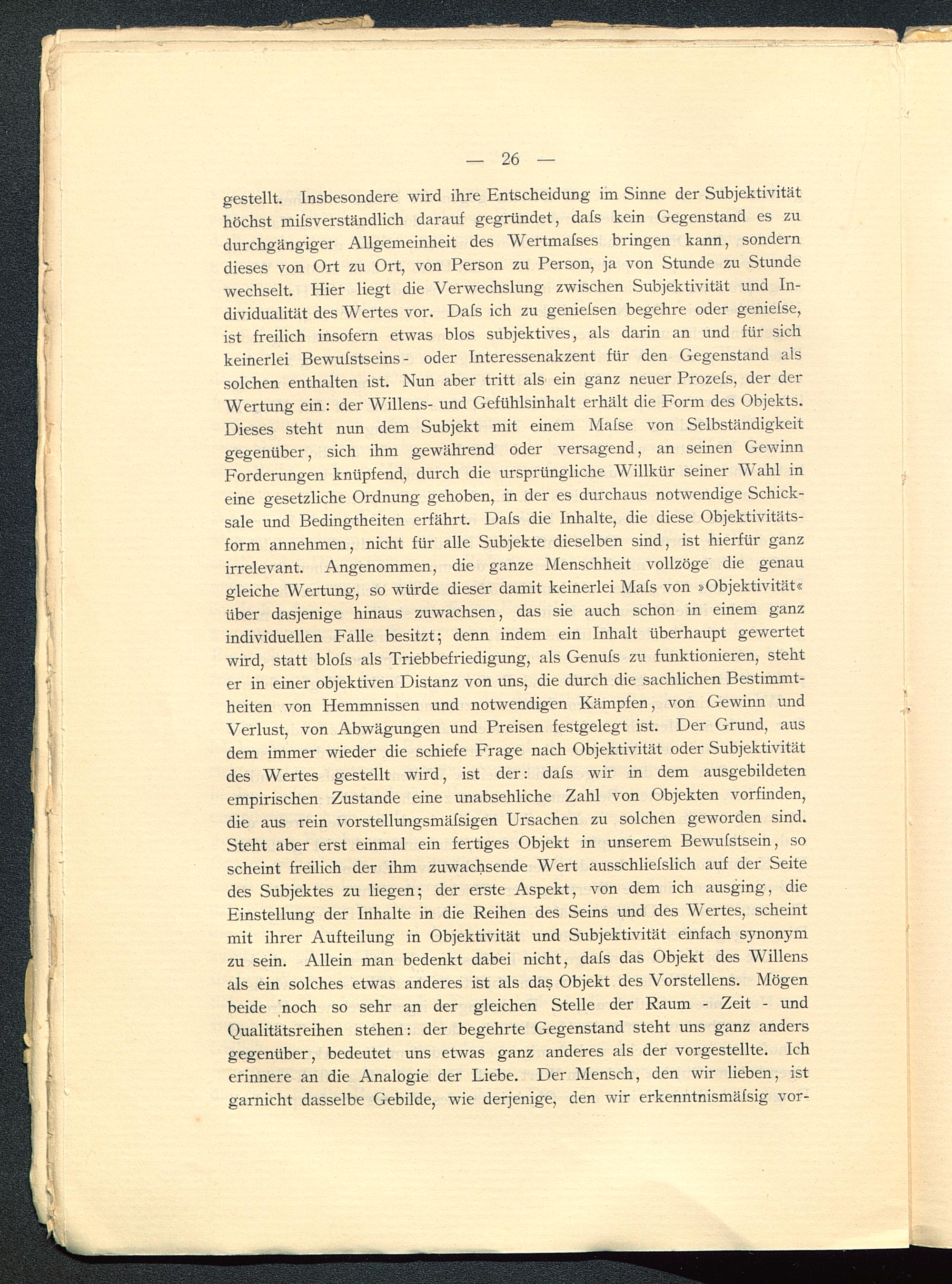 gestellt. Insbesondere wird ihre Entscheidung im Sinne der Subjektivitäthöchst milsverständlich darauf gegründet, dafs kein Gegenstand es zudurchgängiger Allgemeinheit des Wertmafses bringen kann, sonderndieses von Ort zu Ort, von Person zu Person, ja von Stunde zu Stundewechselt. Hier liegt die Verwechslung zwischen Subjektivität und In-dividualität des Wertes vor. Dafs ich zu geniefsen begehre oder geniefse,ist freilich insofern etwas blos subjektives, als darin an und für sichkeinerlei Bewufstseins - oder Interessenakzent für den Gegenstand alssolchen enthalten ist. Nun aber tritt als ein ganz neuer Prozefs, der derWertung ein: der Willens- und Gefühlsinhalt erhält die Form des Objekts.Dieses steht nun dem Subjekt mit einem Mafse von Selbständigkeitgegenüber, sich ihm gewährend oder versagend, an seinen GewinnForderungen knüpfend, durch die ursprüngliche Willkür seiner Wahl ineine gesetzliche Ordnung gehoben, in der es durchaus notwendige Schick-sale und Bedingtheiten erfährt. Dafs die Inhalte, die diese Objektivitäts-form annehmen, nicht für alle Subjekte dieselben sind, ist hierfür ganzirrelevant. Angenommen, die ganze Menschheit vollzöge die genaugleiche Wertung, so würde dieser damit keinerlei Mals von »Objektivität«über dasjenige hinaus Zuwachsen, das sie auch schon in einem ganzindividuellen Falle besitzt - , denn indem ein Inhalt überhaupt gewertetwird, statt blofs als Triebbefriedigung, als Genufs zu funktionieren, stehter in einer objektiven Distanz von uns, die durch die sachlichen Bestimmt-heiten von Hemmnissen und notwendigen Kämpfen, von Gewinn undVerlust, von Abwägungen und Preisen festgelegt ist. Der Grund, ausdem immer wieder die schiefe Frage nach Objektivität oder Subjektivitätdes Wertes gestellt wird, ist der: dafs wir in dem ausgebildetenempirischen Zustande eine unabsehliche Zahl von Objekten vorfinden,die aus rein vorstellungsmäfsigen Ursachen zu solchen geworden sind.Steht aber erst einmal ein fertiges Objekt in unserem Bewufstsein, soscheint freilich der ihm zuwachsende Wert ausschliefslich auf der Seitedes Subjektes zu liegen; der erste Aspekt, von dem ich ausging, dieEinstellung der Inhalte in die Reihen des Seins und des Wertes, scheintmit ihrer Aufteilung in Objektivität und Subjektivität einfach synonymzu sein. Allein man bedenkt dabei nicht, dafs das Objekt des Willensals ein solches etwas anderes ist als das Objekt des Vorstellens. Mögenbeide noch so sehr an der gleichen Stelle der Raum - Zeit - undQualitätsreihen stehen: der begehrte Gegenstand steht uns ganz andersgegenüber, bedeutet uns etwas ganz anderes als der vorgestellte. Icherinnere an die Analogie der Liebe. Der Mensch, den wir lieben, istgarnicht dasselbe Gebilde, wie derjenige, den wir erkenntnismäfsig vor-