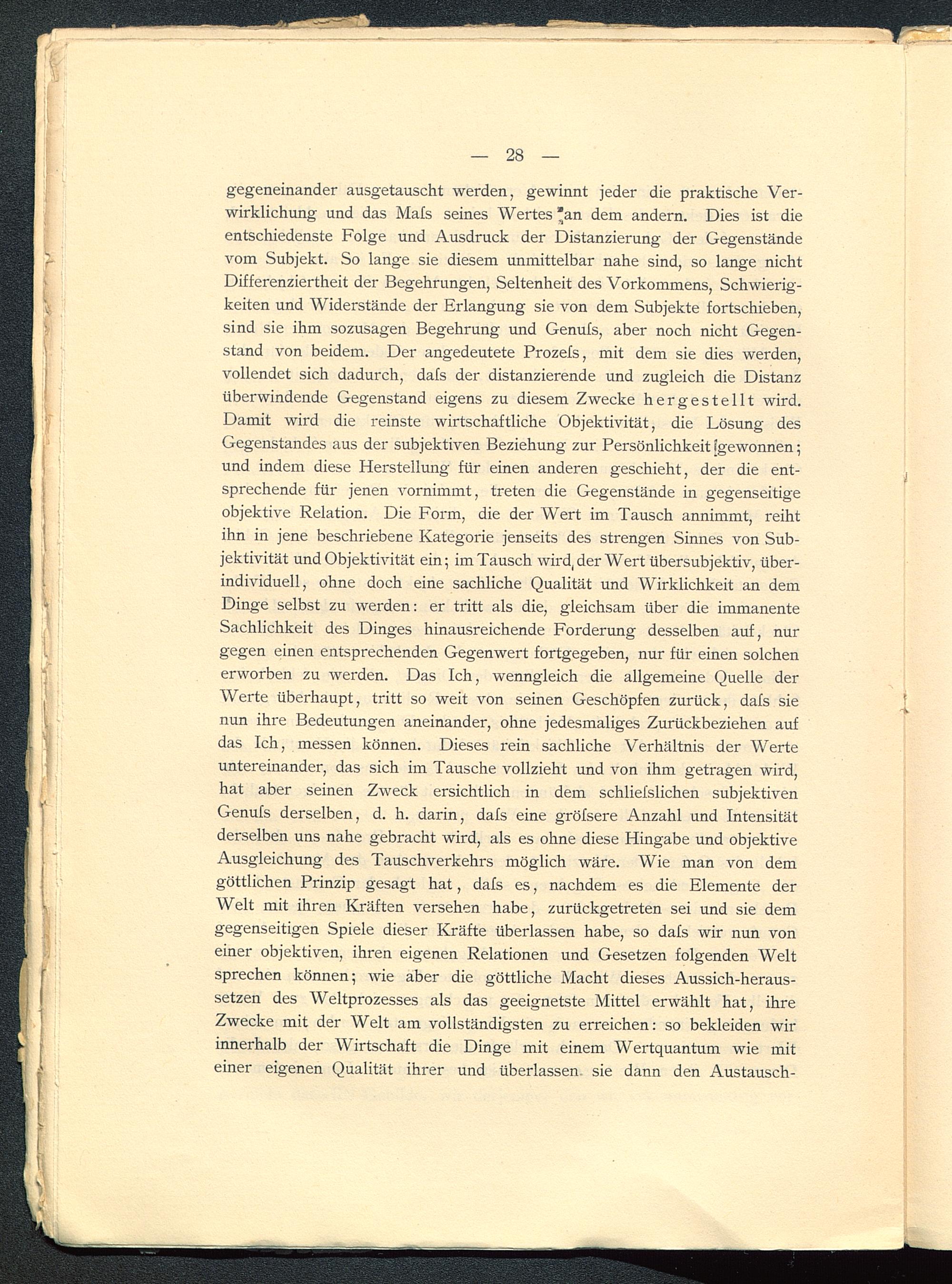 gegeneinander ausgetauscht werden, gewinnt jeder die praktische Ver-wirklichung und das Mals seines Wertes *an dem andern. Dies ist dieentschiedenste Folge und Ausdruck der Distanzierung der Gegenständevom Subjekt. So lange sie diesem unmittelbar nahe sind, so lange nichtDifferenziertheit der Begehrungen, Seltenheit des Vorkommens, Schwierig-keiten und Widerstände der Erlangung sie von dem Subjekte fortschieben,sind sie ihm sozusagen Begehrung und Genufs, aber noch nicht Gegen-stand von beidem. Der angedeutete Prozefs, mit dem sie dies werden,vollendet sich dadurch, dafs der distanzierende und zugleich die Distanzüberwindende Gegenstand eigens zu diesem Zwecke hergestellt wird.Damit wird die reinste wirtschaftliche Objektivität, die Lösung desGegenstandes aus der subjektiven Beziehung zur Persönlichkeit [gewonnen;und indem diese Herstellung für einen anderen geschieht, der die ent-sprechende für jenen vornimmt, treten die Gegenstände in gegenseitigeobjektive Relation. Die Form, die der Wert im Tausch annimmt, reihtihn in jene beschriebene Kategorie jenseits des strengen Sinnes von Sub-jektivität und Objektivität ein; im Tausch wird, der Wert übersubjektiv, über-individuell, ohne doch eine sachliche Qualität und Wirklichkeit an demDinge selbst zu werden: er tritt als die, gleichsam über die immanenteSachlichkeit des Dinges hinausreichende Forderung desselben auf, nurgegen einen entsprechenden Gegenwert fortgegeben, nur für einen solchenerworben zu werden. Das Ich, wenngleich die allgemeine Quelle derWerte überhaupt, tritt so weit von seinen Geschöpfen zurück, dafs sienun ihre Bedeutungen aneinander, ohne jedesmaliges Zurückbeziehen aufdas Ich, messen können. Dieses rein sachliche Verhältnis der Werteuntereinander, das sich im Tausche vollzieht und von ihm getragen wird,hat aber seinen Zweck ersichtlich in dem schliefslichen subjektivenGenufs derselben, d. h. darin, dafs eine gröfsere Anzahl und Intensitätderselben uns nahe gebracht wird, als es ohne diese Hingabe und objektiveAusgleichung des Tauschverkehrs möglich wäre. Wie man von demgöttlichen Prinzip gesagt hat, dafs es, nachdem es die Elemente derWelt mit ihren Kräften versehen habe, zurückgetreten sei und sie demgegenseitigen Spiele dieser Kräfte überlassen habe, so dafs wir nun voneiner objektiven, ihren eigenen Relationen und Gesetzen folgenden Weltsprechen können; wie aber die göttliche Macht dieses Aussich-heraus-setzen des Weltprozesses als das geeignetste Mittel erwählt hat, ihreZwecke mit der Welt am vollständigsten zu erreichen: so bekleiden wirinnerhalb der Wirtschaft die Dinge mit einem Wertquantum wie miteiner eigenen Qualität ihrer und überlassen, sie dann den Austausch-