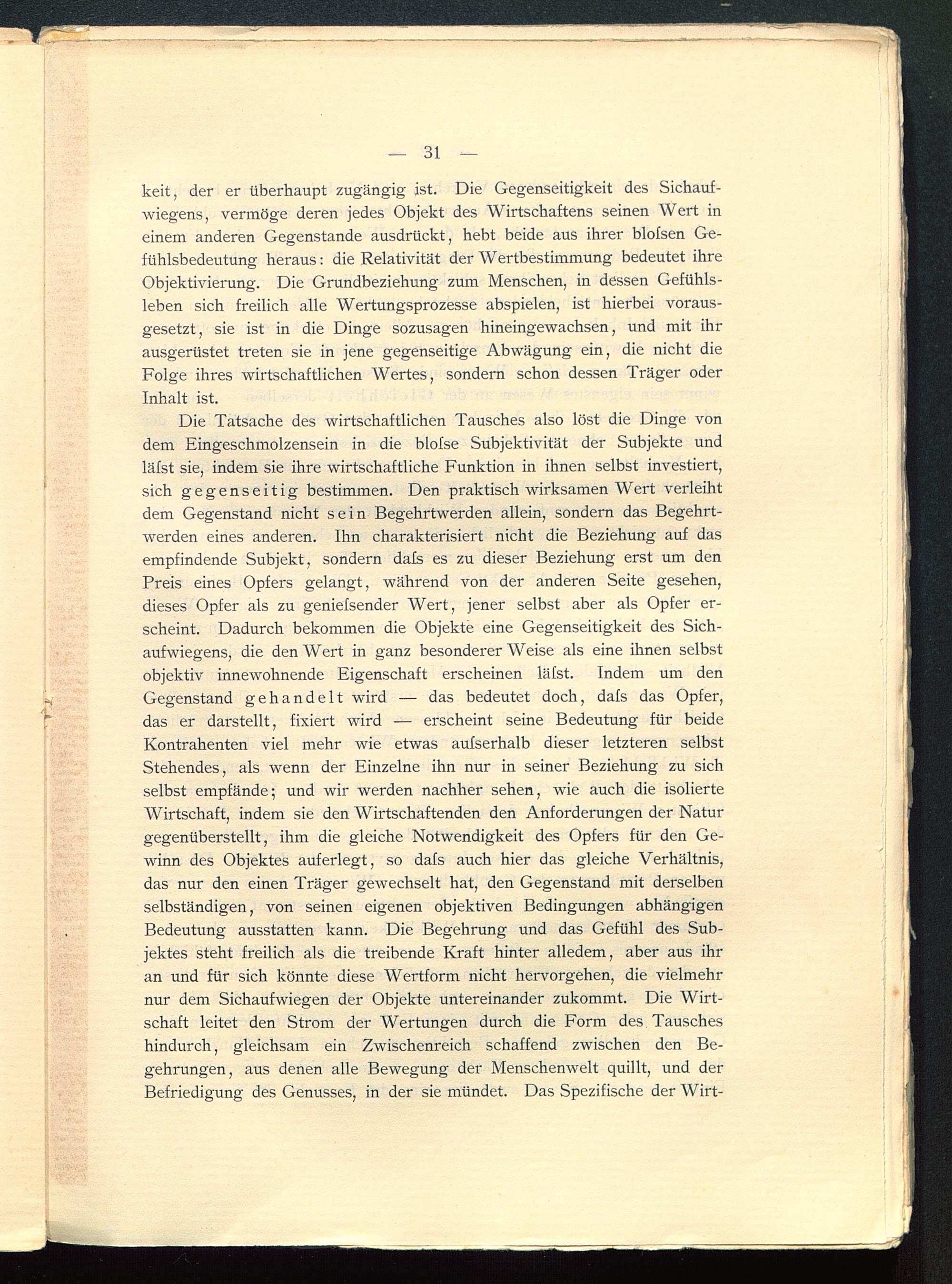 keit, der er überhaupt zugängig ist. Die Gegenseitigkeit des Sichauf-wiegens, vermöge deren jedes Objekt des Wirtschaftens seinen Wert ineinem anderen Gegenstände ausdrückt, hebt beide aus ihrer blofsen Ge-fühlsbedeutung heraus: die Relativität der Wertbestimmung bedeutet ihreObjektivierung. Die Grundbeziehung zum Menschen, in dessen Gefühls-leben sich freilich alle Wertungsprozesse abspielen, ist hierbei voraus-gesetzt, sie ist in die Dinge sozusagen hineingewachsen, und mit ihrausgerüstet treten sie in jene gegenseitige Abwägung ein, die nicht dieFolge ihres wirtschaftlichen Wertes, sondern schon dessen Träger oderInhalt ist.