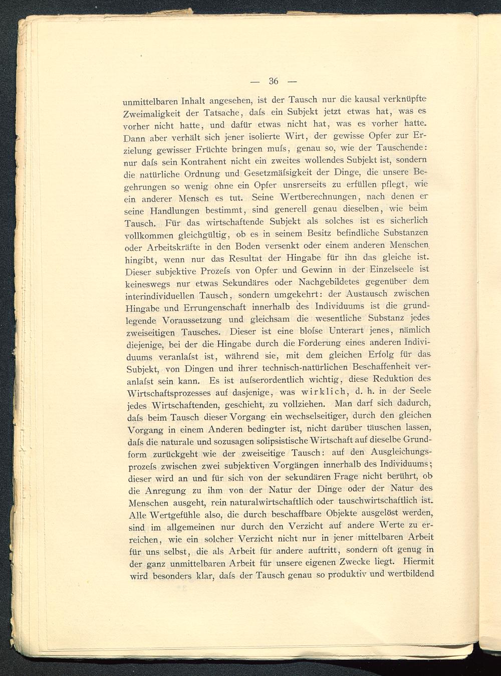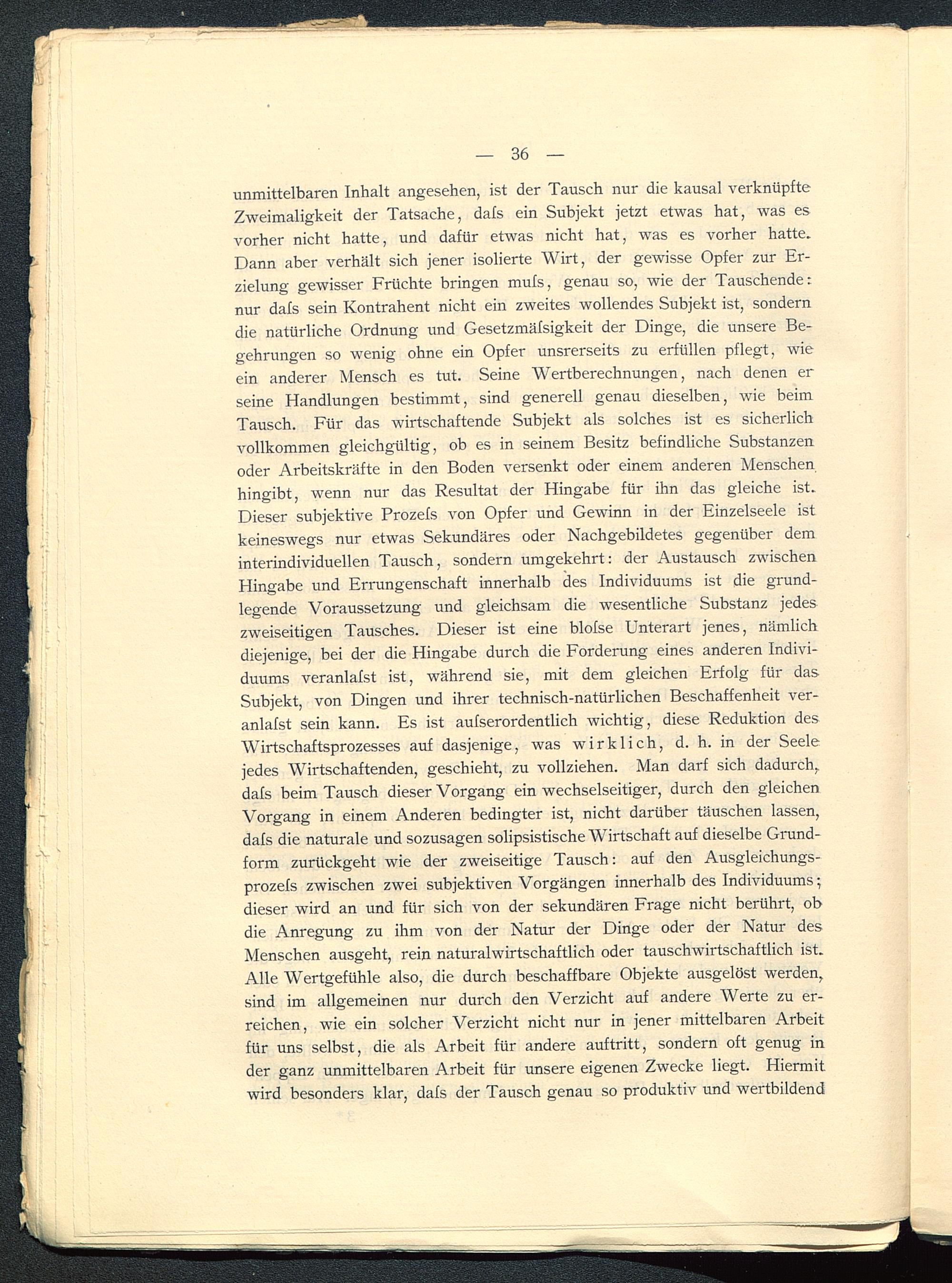 unmittelbaren Inhalt angesehen, ist der Tausch nur die kausal verknüpfteZweimaligkeit der Tatsache, dafs ein Subjekt jetzt etwas hat, was esvorher nicht hatte, und dafür etwas nicht hat, was es vorher hatte.Dann aber verhält sich jener isolierte Wirt, der gewisse Opfer zur Er-zielung gewisser Früchte bringen mufs, genau so, wie der Tauschende:nur dafs sein Kontrahent nicht ein zweites wollendes Subjekt ist, sonderndie natürliche Ordnung und Gesetzmäfsigkeit der Dinge, die unsere Be-gehrungen so wenig ohne ein Opfer unsrerseits zu erfüllen pflegt, wieein anderer Mensch es tut. Seine Wertberechnungen, nach denen erseine Handlungen bestimmt, sind generell genau dieselben, wie beimTausch. Für das wirtschaftende Subjekt als solches ist es sicherlichvollkommen gleichgültig, ob es in seinem Besitz befindliche Substanzenoder Arbeitskräfte in den Boden versenkt oder einem anderen Menschenhingibt, wenn nur das Resultat der Hingabe für ihn das gleiche ist.Dieser subjektive Prozefs von Opfer und Gewinn in der Einzelseele istkeineswegs nur etwas Sekundäres oder Nachgebildetes gegenüber deminterindividuellen Tausch, sondern umgekehrt: der Austausch zwischenHingabe und Errungenschaft innerhalb des Individuums ist die grund-legende Voraussetzung und gleichsam die wesentliche Substanz jedeszweiseitigen Tausches. Dieser ist eine blofse Unterart jenes, nämlichdiejenige, bei der die Hingabe durch die Forderung eines anderen Indivi-duums veranlafst ist, während sie, mit dem gleichen Erfolg für dasSubjekt, von Dingen und ihrer technisch-natürlichen Beschaffenheit ver-anlafst sein kann. Es ist aufserordentlich wichtig, diese Reduktion desWirtschaftsprozesses auf dasjenige, was wirklich, d. h. in der Seelejedes Wirtschaftenden, geschieht, zu vollziehen. Man darf sich dadurch,dafs beim Tausch dieser Vorgang ein wechselseitiger, durch den gleichenVorgang in einem Anderen bedingter ist, nicht darüber täuschen lassen,dafs die naturale und sozusagen solipsistische Wirtschaft auf dieselbe Grund-form zurückgeht wie der zweiseitige Tausch: auf den Ausgleichungs-prozefs zwischen zwei subjektiven Vorgängen innerhalb des Individuums;dieser wird an und für sich von der sekundären Frage nicht berührt, obdie Anregung zu ihm von der Natur der Dinge oder der Natur desMenschen ausgeht, rein naturalwirtschaftlich oder tauschwirtschaftlich ist.Alle Wertgefühle also, die durch beschaffbare Objekte ausgelöst werden,sind im allgemeinen nur durch den Verzicht auf andere Werte zu er-reichen, wie ein solcher Verzicht nicht nur in jener mittelbaren Arbeitfür uns selbst, die als Arbeit für andere auftritt, sondern oft genug inder ganz unmittelbaren Arbeit für unsere eigenen Zwecke liegt. Hiermitwird besonders klar, dafs der Tausch genau so produktiv und wertbildend