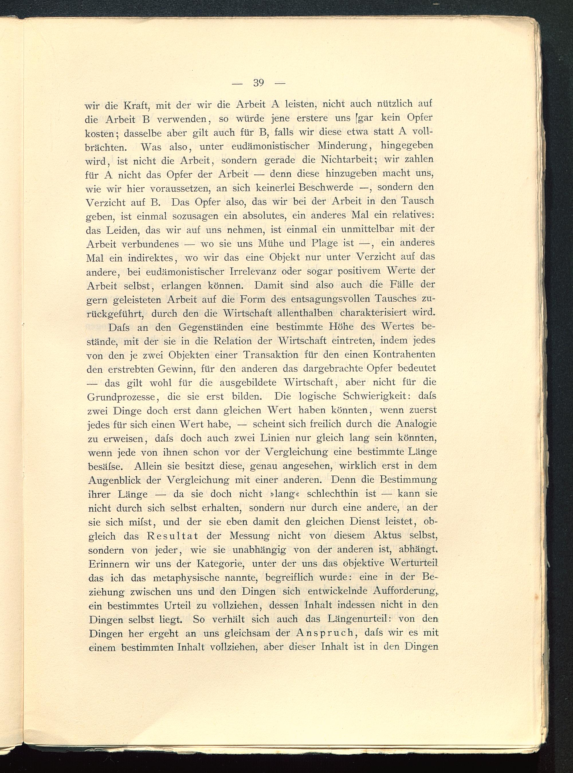 wir die Kraft, mit der wir die Arbeit A leisten, nicht auch nützlich aufdie Arbeit B verwenden, so würde jene erstere uns [gar kein Opferkosten; dasselbe aber gilt auch für B, falls wir diese etwa statt A voll-brächten. Was also, unter eudämonistischer Minderung, hingegebenwird, ist nicht die Arbeit, sondern gerade die Nichtarbeit; wir zahlenfür A nicht das Opfer der Arbeit — denn diese hinzugeben macht uns,wie wir hier voraussetzen, an sich keinerlei Beschwerde —, sondern denVerzicht auf B. Das Opfer also, das wir bei der Arbeit in den Tauschgeben, ist einmal sozusagen ein absolutes, ein anderes Mal ein relatives:das Leiden, das wir auf uns nehmen, ist einmal ein unmittelbar mit derArbeit verbundenes — wo sie uns Mühe und Plage ist —, ein anderesMal ein indirektes, wo wir das eine Objekt nur unter Verzicht auf dasandere, bei eudämonistischer Irrelevanz oder sogar positivem Werte derArbeit selbst, erlangen können. Damit sind also auch die Fälle dergern geleisteten Arbeit auf die Form des entsagungsvollen Tausches zu-rückgeführt, durch den die Wirtschaft allenthalben charakterisiert wird.