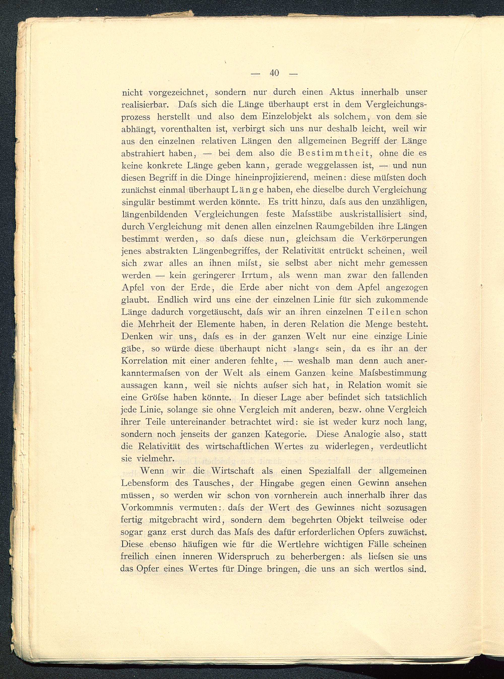 nicht vorgezeichnet, sondern nur durch einen Aktus innerhalb unserrealisierbar. Dals sich die Länge überhaupt erst in dem Vergleichungs-prozess herstellt und also dem Einzelobjekt als solchem, von dem sieabhängt, vorenthalten ist, verbirgt sich uns nur deshalb leicht, weil wiraus den einzelnen relativen Längen den allgemeinen Begriff der Längeabstrahiert haben, — bei dem also die Bestimmtheit, ohne die eskeine konkrete Länge geben kann, gerade weggelassen ist, — und nundiesen Begriff in die Dinge hineinprojizierend, meinen: diese müfsten dochzunächst einmal überhaupt L ä n g e haben, ehe dieselbe durch Vergleichungsingulär bestimmt werden könnte. Es tritt hinzu, dafs aus den unzähligen,längenbildenden Vergleichungen feste Mafsstäbe auskristallisiert sind,durch Vergleichung mit denen allen einzelnen Raumgebilden ihre Längenbestimmt werden, so dafs diese nun, gleichsam die Verkörperungenjenes abstrakten Längenbegriffes, der Relativität entrückt scheinen, weilsich zwar alles an ihnen mifst, sie selbst aber nicht mehr gemessenwerden — kein geringerer Irrtum, als wenn man zwar den fallendenApfel von der Erde, die Erde aber nicht von dem Apfel angezogenglaubt. Endlich wird uns eine der einzelnen Linie für sich zukommendeLänge dadurch vorgetäuscht, dafs wir an ihren einzelnen Teilen schondie Mehrheit der Elemente haben, in deren Relation die Menge besteht.Denken wir uns, dafs es in der ganzen Welt nur eine einzige Liniegäbe, so würde diese überhaupt nicht »lang« sein, da es ihr an derKorrelation mit einer anderen fehlte, — weshalb man denn auch aner-kanntermafsen von der Welt als einem Ganzen keine Mafsbestimmungaussagen kann, weil sie nichts aufser sich hat, in Relation womit sieeine Gröfse haben könnte. In dieser Lage aber befindet sich tatsächlichjede Linie, solange sie ohne Vergleich mit anderen, bezw. ohne Vergleichihrer Teile untereinander betrachtet wird: sie ist weder kurz noch lang,sondern noch jenseits der ganzen Kategorie. Diese Analogie also, stattdie Relativität des wirtschaftlichen Wertes zu widerlegen, verdeutlichtsie vielmehr.