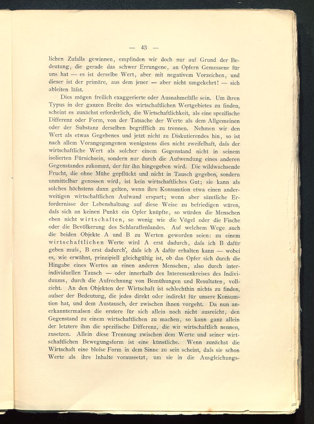 Dies mögen freilich exaggerierte oder Ausnahmefälle sein. Um ihrenTypus in der ganzen Breite des wirtschaftlichen Wertgebietes zu finden,scheint es zunächst erforderlich, die Wirtschaftlichkeit, als eine spezifischeDifferenz oder Form, von der Tatsache der Werte als dem Allgemeinenoder der Substanz derselben begrifflich zu trennen. Nehmen wir denWert als etwas Gegebenes und jetzt nicht zu Diskutierendes hin, so istnach allem Vorangegangenen wenigstens dies nicht zweifelhaft, dafs derwirtschaftliche Wert als solcher einem Gegenstand nicht in seinemisolierten Fürsichsein, sondern nur durch die Aufwendung eines anderenGegenstandes zukommt, der für ihn hingegeben wird. Die wildwachsendeFrucht, die ohne Mühe gepflückt und nicht in Tausch gegeben, sondernunmittelbar genossen wird, ist kein wirtschaftliches Gut; sie kann alssolches höchstens dann gelten, wenn ihre Konsumtion etw r a einen ander-weitigen wirtschaftlichen Aufwand erspart; wenn aber sämtliche Er-fordernisse der Lebenshaltung auf diese Weise zu befriedigen wären,dafs sich an keinen Punkt ein Opfer knüpfte, so würden die Menscheneben nicht wirtschaften, so wenig wie die Vögel oder die Fischeoder die Bevölkerung des Schlaraffenlandes. Auf welchem Wege auchdie beiden Objekte A und B zu Werten geworden seien: zu einemwirtschaftlichen Werte wird A erst dadurch, dafs ich B dafürgeben mufs, B erst dadurch', dafs ich A dafür erhalten kann — wobeies, wie erwähnt, prinzipiell gleichgültig ist, ob das Opfer sich durch dieHingabe eines Wertes an einen anderen Menschen, also durch inter-individuellen Tausch — oder innerhalb des Interessenkreises des Indivi-duums, durch die Aufrechnung von Bemühungen und Resultaten, voll-zieht. An den Objekten der Wirtschaft ist schlechthin nichts zu finden,aufser der Bedeutung, die jedes direkt oder indirekt für unsere Konsum-tion hat, und dem Austausch, der zwischen ihnen vorgeht. Da nun an-erkanntermafsen die erstere für sich allein noch nicht ausreicht, denGegenstand zu einem wirtschaftlichen zu machen, so kann ganz alleinder letztere ihm die spezifische Differenz, die wir wirtschaftlich nennen,zusetzen. Allein diese Trennung zwischen dem Werte und seiner wirt-schaftlichen Bewegungsform ist eine künstliche. Wenn zunächst dieWirtschaft eine blofse Form in dem Sinne zu sein scheint, dafs sie schonWerte als ihre Inhalte voraussetzt, um sie in die Ausgleichungs-