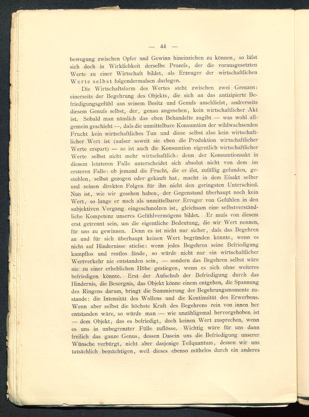 Die Wirtschaftsform des Wertes steht zwischen zwei Grenzen:einerseits der Begehrung des Objekts, die sich an das antizipierte Be-friedigungsgefühl aus seinem Besitz und Genufs anschliefst, andrerseitsdiesem Genufs selbst, der, genau angesehen, kein wirtschaftlicher Aktist. Sobald man nämlich das eben Behandelte zugibt — was wohl all-gemein geschieht —•, dafs die unmittelbare Konsumtion der wildwachsendenFrucht kein wirtschaftliches Tun und diese selbst also kein wirtschaft-licher Wert ist (aufser soweit sie eben die Produktion wirtschaftlicherWerte erspart) — so ist auch die Konsumtion eigentlich wirtschaftlicherWerte selbst nicht mehr wirtschaftlich: denn der Konsumtionsakt indiesem letzteren Falle unterscheidet sich absolut nicht von dem imersteren Falle: ob jemand die Frucht, die er ifst, zufällig gefunden, ge-stohlen, selbst gezogen oder gekauft hat, macht in dem Efsakt selberund seinen direkten Folgen für ihn nicht den geringsten Unterschied.Nun ist, wie wir gesehen haben, der Gegenstand überhaupt noch keinWert, so lange er noch als unmittelbarer Erreger von Gefühlen in densubjektiven Vorgang eingeschmolzen ist, gleichsam eine selbstverständ-liche Kompetenz unseres Gefühlvermögens bildet. Er mufs von diesemerst getrennt sein, um die eigentliche Bedeutung, die wir Wert nennen,für uns zu gewinnen. Denn es ist nicht nur sicher, dafs das Begehrenan und für sich überhaupt keinen Wert begründen könnte, wenn esnicht auf Hindernisse stiefse: wenn jedes Begehren seine Befriedigung-kampflos und restlos fände, so würde nicht nur ein wirtschaftlicherWertverkehr nie entstanden sein, —■ sondern das Begehren selbst wärenie zu einer erheblichen Höhe gestiegen, wenn es sich ohne weiteresbefriedigen könnte. Erst der Aufschub der Befriedigung durch dasHindernis, die Besorgnis, das Objekt könne einem entgehen, die Spannungdes Ringens darum, bringt die Summierung der Begehrungsmomente zu-stande: die Intensität des Wollens und die Kontinuität des Erwerbens.Wenn aber selbst die höchste Kraft des Begehrens rein von innen herentstanden wäre, so würde man — wie unzähligemal hervorgehoben ist— dem Objekt, das es befriedigt, doch keinen Wert zusprechen, wennes uns in unbegrenzter Fülle zuflösse. Wichtig wäre für uns dannfreilich das ganze Genus, dessen Dasein uns die Befriedigung unsererWünsche verbürgt, nicht aber dasjenige Teilquantum, dessen wir unstatsächlich bemächtigen, weil dieses ebenso mühelos durch ein anderes