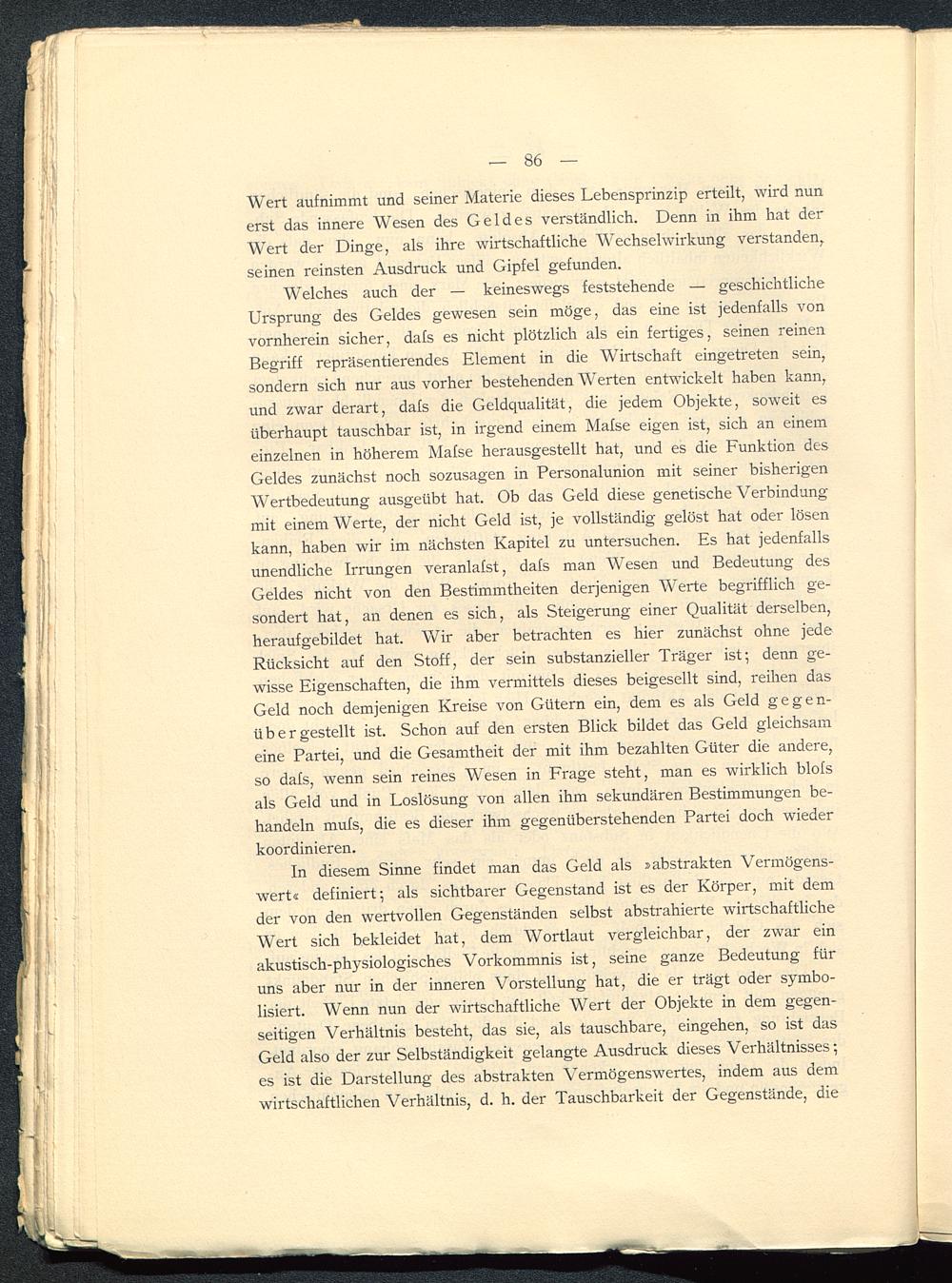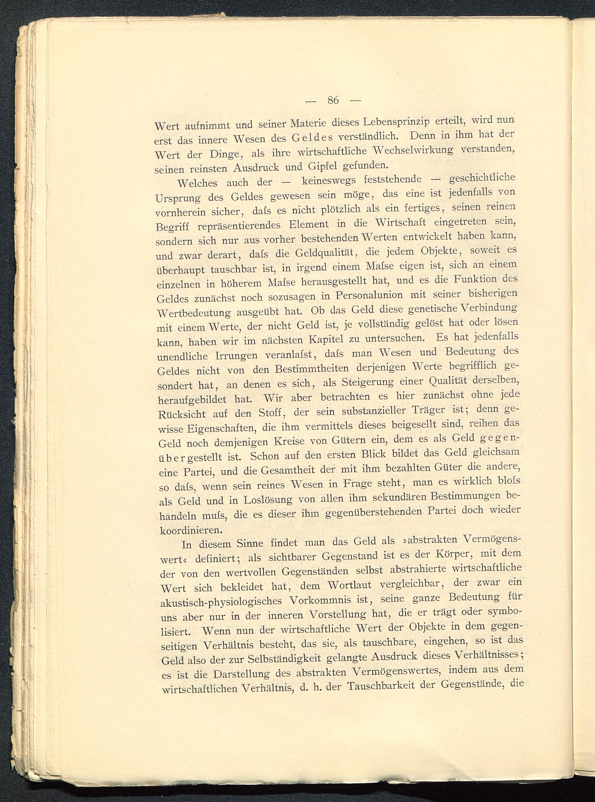 In diesem Sinne findet man das Geld als »abstrakten Vermögens-wert« definiert; als sichtbarer Gegenstand ist es der Körper, mit demder von den wertvollen Gegenständen selbst abstrahierte wirtschaftlicheWert sich bekleidet hat, dem Wortlaut vergleichbar, der zwar einakustisch-physiologisches Vorkommnis ist, seine ganze Bedeutung füruns aber nur in der inneren Vorstellung hat, die er trägt oder symbo-lisiert. Wenn nun der wirtschaftliche Wert der Objekte in dem gegen-seitigen Verhältnis besteht, das sie, als tauschbare, eingehen, so ist dasGeld also der zur Selbständigkeit gelangte Ausdruck dieses Verhältnisses;es ist die Darstellung des abstrakten Vermögenswertes, indem aus demwirtschaftlichen Verhältnis, d. h. der Tauschbarkeit der Gegenstände, die