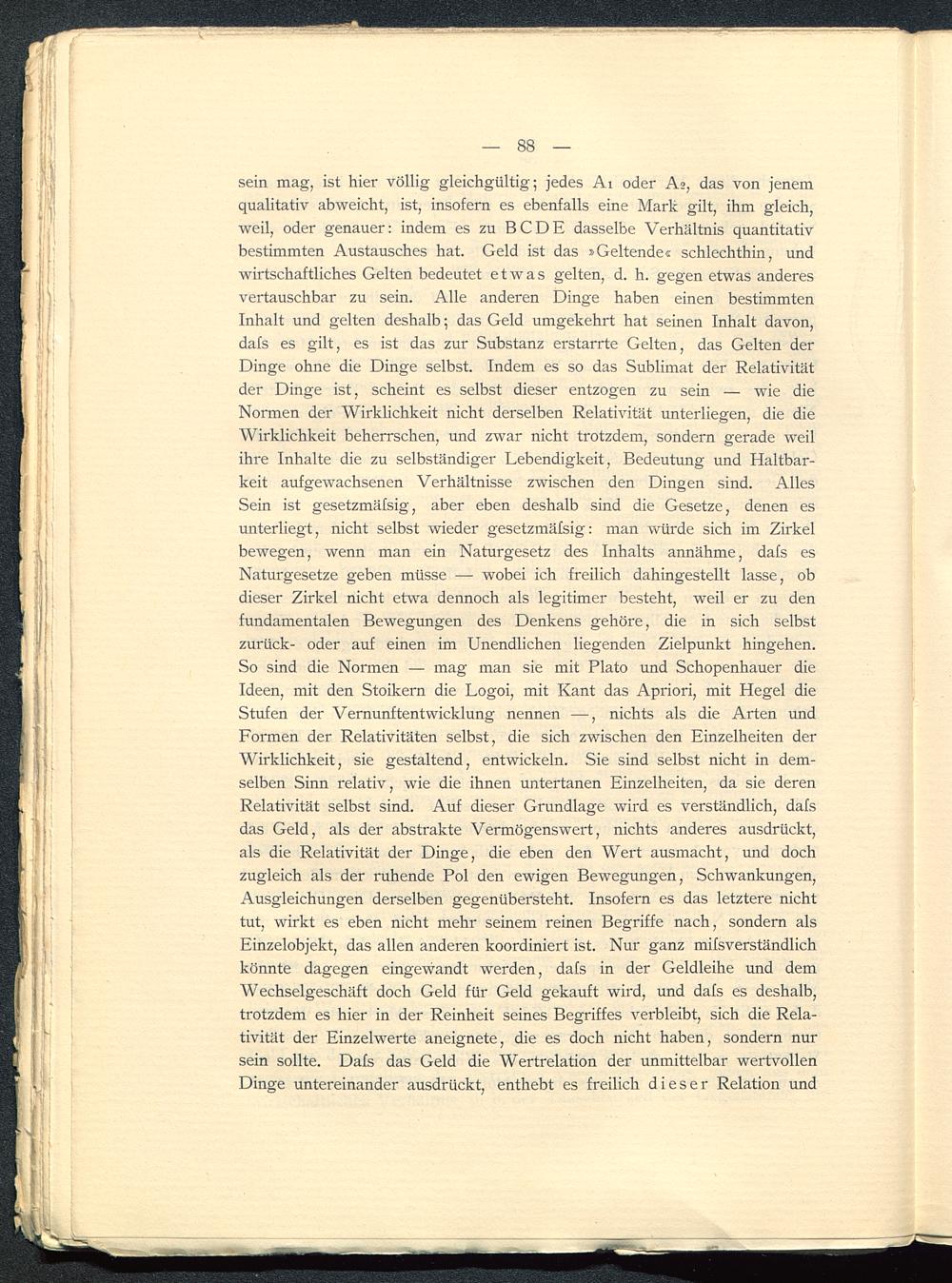 sein mag, ist hier völlig gleichgültig; jedes Ai oder A2, das von jenemqualitativ abweicht, ist, insofern es ebenfalls eine Mark gilt, ihm gleich,weil, oder genauer: indem es zu BCDE dasselbe Verhältnis quantitativbestimmten Austausches hat. Geld ist das »Geltende« schlechthin, undwirtschaftliches Gelten bedeutet etwas gelten, d. h. gegen etwas anderesvertauschbar zu sein. Alle anderen Dinge haben einen bes timm tenInhalt und gelten deshalb; das Geld umgekehrt hat seinen Inhalt davon,dafs es gilt, es ist das zur Substanz erstarrte Gelten, das Gelten derDinge ohne die Dinge selbst. Indem es so das Sublimat der Relativitätder Dinge ist, scheint es selbst dieser entzogen zu sein — wie dieNormen der Wirklichkeit nicht derselben Relativität unterliegen, die dieWirklichkeit beherrschen, und zwar nicht trotzdem, sondern gerade weilihre Inhalte die zu selbständiger Lebendigkeit, Bedeutung und Haltbar-keit aufgewachsenen Verhältnisse zwischen den Dingen sind. AllesSein ist gesetzmäfsig, aber eben deshalb sind die Gesetze, denen esunterliegt, nicht selbst wieder gesetzmäfsig: man würde sich im Zirkelbewegen, wenn man ein Naturgesetz des Inhalts annähme, dafs esNaturgesetze geben müsse — wobei ich freilich dahingestellt lasse, obdieser Zirkel nicht etwa dennoch als legitimer besteht, weil er zu denfundamentalen Bewegungen des Denkens gehöre, die in sich selbstzurück- oder auf einen im Unendlichen liegenden Zielpunkt hingehen.So sind die Normen — mag man sie mit Plato und Schopenhauer dieIdeen, mit den Stoikern die Logoi, mit Kant das Apriori, mit Hegel dieStufen der Vernunftentwicklung nennen —, nichts als die Arten undFormen der Relativitäten selbst, die sich zwischen den Einzelheiten derWirklichkeit, sie gestaltend, entwickeln. Sie sind selbst nicht in dem-selben Sinn relativ, wie die ihnen Untertanen Einzelheiten, da sie derenRelativität selbst sind. Auf dieser Grundlage wird es verständlich, dafsdas Geld, als der abstrakte Vermögenswert, nichts anderes ausdrückt,als die Relativität der Dinge, die eben den Wert ausmacht, und dochzugleich als der ruhende Pol den ewigen Bewegungen, Schwankungen,Ausgleichungen derselben gegenübersteht. Insofern es das letztere nichttut, wirkt es eben nicht mehr seinem reinen Begriffe nach, sondern alsEinzelobjekt, das allen anderen koordiniert ist. Nur ganz mifsverständlichkönnte dagegen eingewandt werden, dafs in der Geldleihe und demWechselgeschäft doch Geld für Geld gekauft wird, und dafs es deshalb,trotzdem es hier in der Reinheit seines Begriffes verbleibt, sich die Rela-tivität der Einzelwerte aneignete, die es doch nicht haben, sondern nursein sollte. Dals das Geld die Wertrelation der unmittelbar wertvollenDinge untereinander ausdrückt, enthebt es freilich dieser Relation und