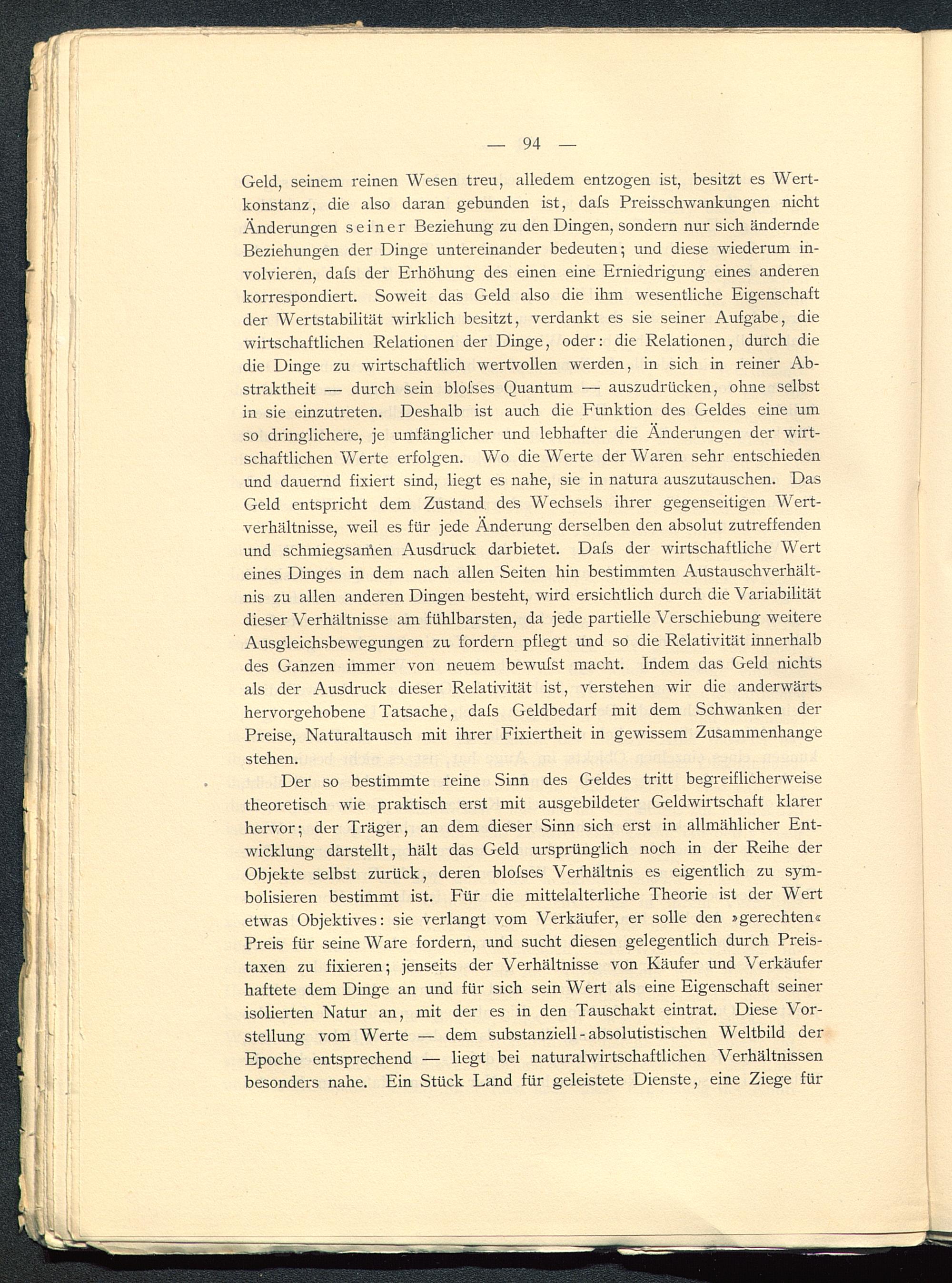 Der so bestimmte reine Sinn des Geldes tritt begreiflicherweisetheoretisch wie praktisch erst mit ausgebildeter Geldwirtschaft klarerhervor; der Träger, an dem dieser Sinn sich erst in allmählicher Ent-wicklung darstellt, hält das Geld ursprünglich noch in der Reihe derObjekte selbst zurück, deren blofses Verhältnis es eigentlich zu sym-bolisieren bestimmt ist. Für die mittelalterliche Theorie ist der Wertetwas Objektives: sie verlangt vom Verkäufer, er solle den »gerechten«Preis für seine Ware fordern, und sucht diesen gelegentlich durch Preis-taxen zu fixieren; jenseits der Verhältnisse von Käufer und Verkäuferhaftete dem Dinge an und für sich sein Wert als eine Eigenschaft seinerisolierten Natur an, mit der es in den Tauschakt eintrat. Diese Vor-stellung vom Werte — dem substanziell - absolutistischen Weltbild derEpoche entsprechend — liegt bei naturalwirtschaftlichen Verhältnissenbesonders nahe. Ein Stück Land für geleistete Dienste, eine Ziege für
