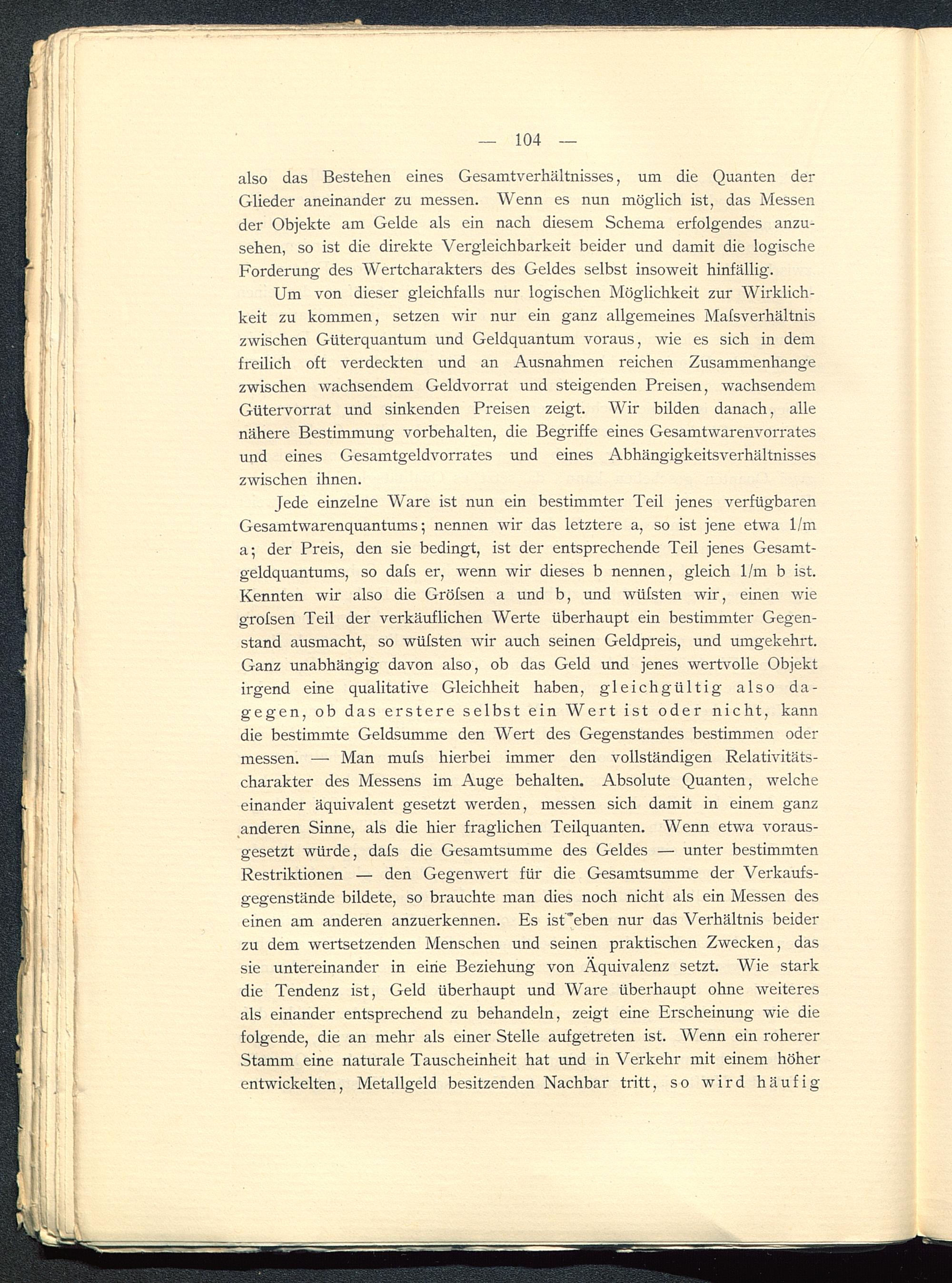 Um von dieser gleichfalls nur logischen Möglichkeit zur Wirklich-keit zu kommen, setzen wir nur ein ganz allgemeines Mafsverhältniszwischen Güterquantum und Geldquantum voraus, wie es sich in demfreilich oft verdeckten und an Ausnahmen reichen Zusammenhängezwischen wachsendem Geldvorrat und steigenden Preisen, wachsendemGütervorrat und sinkenden Preisen zeigt. Wir bilden danach, allenähere Bestimmung Vorbehalten, die Begriffe eines Gesamtwarenvorratesund eines Gesamtgeldvorrates und eines Abhängigkeitsverhältnisseszwischen ihnen.