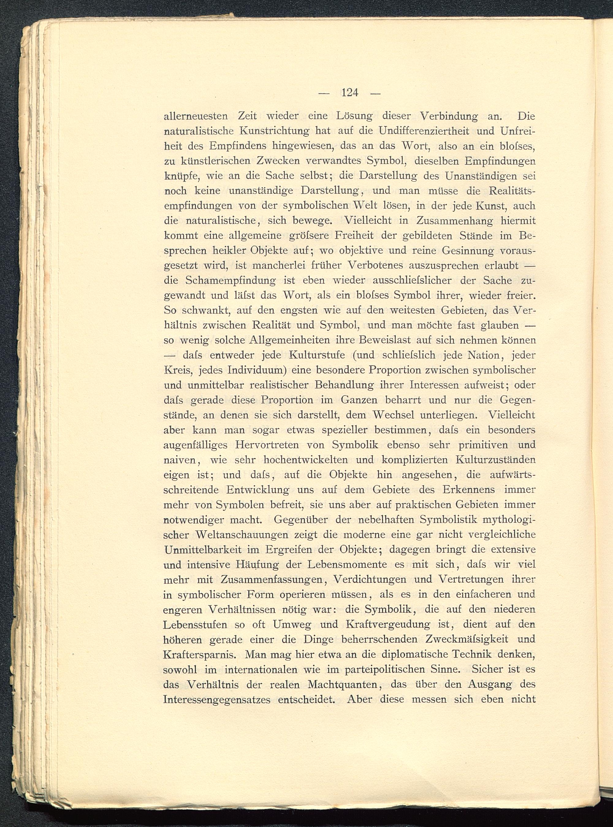 allerneuesten Zeit wieder eine Lösung dieser Verbindung an. Dienaturalistische Kunstrichtung hat auf die Undifferenziertheit und Unfrei-heit des Empfindens hingewiesen, das an das Wort, also an ein blofses,zu künstlerischen Zwecken verwandtes Symbol, dieselben Empfindungenknüpfe, wie an die Sache selbst; die Darstellung des Unanständigen seinoch keine unanständige Darstellung, und man müsse die Realitäts-empfindungen von der symbolischen Welt lösen, in der jede Kunst, auchdie naturalistische, sich bewege. Vielleicht in Zusammenhang hiermitkommt eine allgemeine gröfsere Freiheit der gebildeten Stände im Be-sprechen heikler Objekte auf; wo objektive und reine Gesinnung voraus-gesetzt wird, ist mancherlei früher Verbotenes auszusprechen erlaubt —die Schamempfindung ist eben wieder ausschliefslicher der Sache zu-gewandt und läfst das Wort, als ein blofses Symbol ihrer, wieder freier.So schwankt, auf den engsten wie auf den weitesten Gebieten, das Ver-hältnis zwischen Realität und Symbol, und man möchte fast glauben —so wenig solche Allgemeinheiten ihre Beweislast auf sich nehmen können— dafs entweder jede Kulturstufe (und schliefslich jede Nation, jederKreis, jedes Individuum) eine besondere Proportion zwischen symbolischerund unmittelbar realistischer Behandlung ihrer Interessen aufweist; oderdafs gerade diese Proportion im Ganzen beharrt und nur die Gegen-stände, an denen sie sich darstellt, dem Wechsel unterliegen. Vielleichtaber kann man sogar etwas spezieller bestimmen, dals ein besondersaugenfälliges Hervortreten von Symbolik ebenso sehr primitiven undnaiven, wie sehr hochentwickelten und komplizierten Kulturzuständeneigen ist; und dafs, auf die Objekte hin angesehen, die aufwärts-schreitende Entwicklung uns auf dem Gebiete des Erkennens immermehr von Symbolen befreit, sie uns aber auf praktischen Gebieten immernotwendiger macht. Gegenüber der nebelhaften Symbolistik mythologi-scher Weltanschauungen zeigt die moderne eine gar nicht vergleichlicheUnmittelbarkeit im Ergreifen der Objekte; dagegen bringt die extensiveund intensive Häufung der Lebensmomente es mit sich, dafs wir vielmehr mit Zusammenfassungen, Verdichtungen und Vertretungen ihrerin symbolischer Form operieren müssen, als es in den einfacheren undengeren Verhältnissen nötig war: die Symbolik, die auf den niederenLebensstufen so oft Umweg und Kraftvergeudung ist, dient auf denhöheren gerade einer die Dinge beherrschenden Zweckmäfsigkeit undKraftersparnis. Man mag hier etwa an die diplomatische Technik denken,sowohl im internationalen wie im parteipolitischen Sinne. Sicher ist esdas Verhältnis der realen Machtquanten, das über den Ausgang desInteressengegensatzes entscheidet. Aber diese messen sich eben nicht