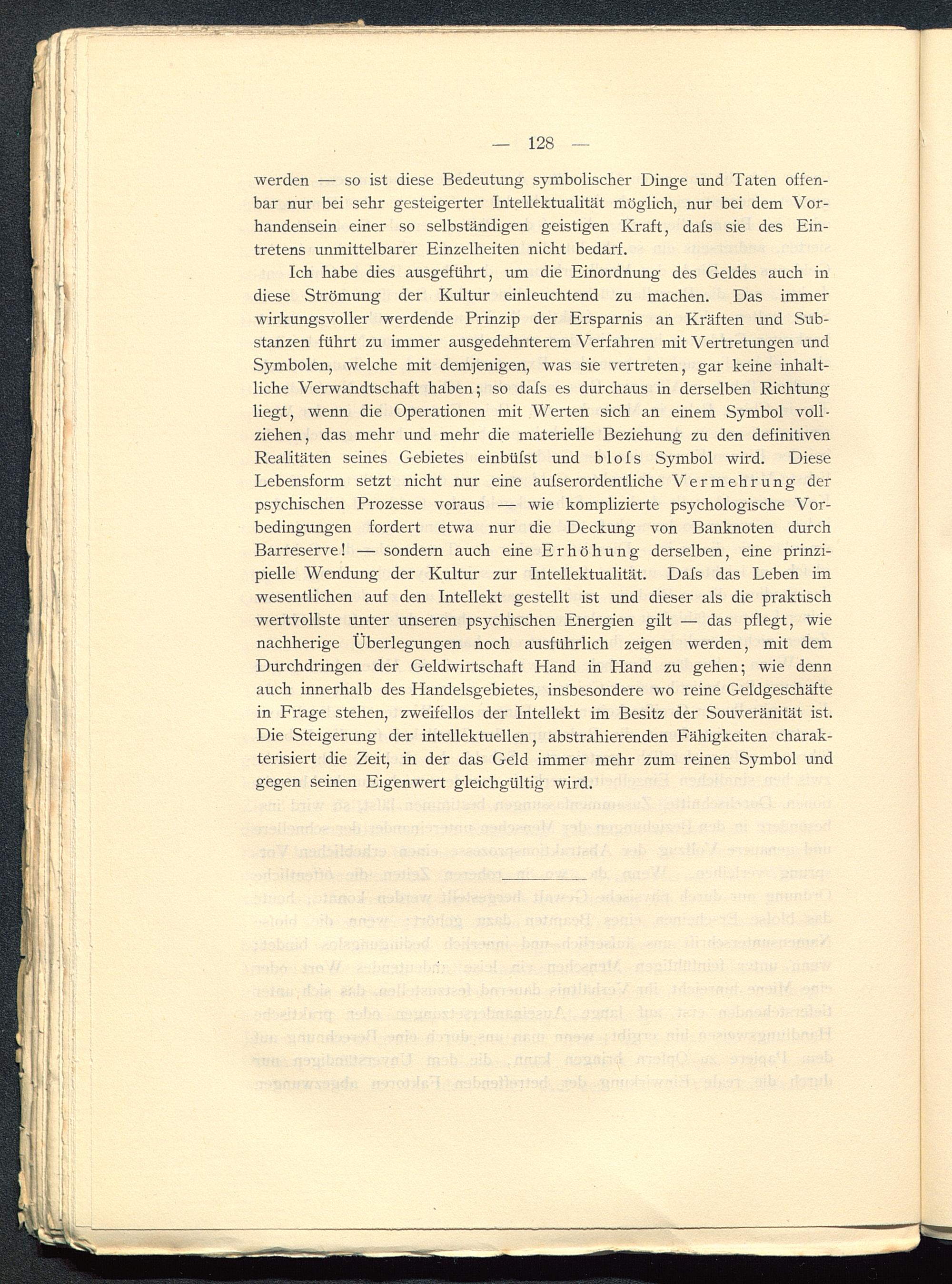Ich habe dies ausgeführt, um die Einordnung des Geldes auch indiese Strömung der Kultur einleuchtend zu machen. Das immerwirkungsvoller werdende Prinzip der Ersparnis an Kräften und Sub-stanzen führt zu immer ausgedehnterem Verfahren mit Vertretungen undSymbolen, welche mit demjenigen, was sie vertreten, gar keine inhalt-liche Verwandtschaft haben; so dafs es durchaus in derselben Richtungliegt, wenn die Operationen mit Werten sich an einem Symbol voll-ziehen, das mehr und mehr die materielle Beziehung zu den definitivenRealitäten seines Gebietes einbüfst und blofs Symbol wird. DieseLebensform setzt nicht nur eine aufserordentliche Vermehrung derpsychischen Prozesse voraus — wie komplizierte psychologische Vor-bedingungen fordert etwa nur die Deckung von Banknoten durchBarreserve! — sondern auch eine Erhöhung derselben, eine prinzi-pielle Wendung der Kultur zur Intellektualität. Dafs das Leben imwesentlichen auf den Intellekt gestellt ist und dieser als die praktischwertvollste unter unseren psychischen Energien gilt — das pflegt, wienachherige Überlegungen noch ausführlich zeigen werden, mit demDurchdringen der Geldwirtschaft Hand in Hand zu gehen; wie dennauch innerhalb des Handelsgebietes, insbesondere wo reine Geldgeschäftein Frage stehen, zweifellos der Intellekt im Besitz der Souveränität ist.Die Steigerung der intellektuellen, abstrahierenden Fähigkeiten charak-terisiert die Zeit, in der das Geld immer mehr zum reinen Symbol undgegen seinen Eigenwert gleichgültig wird.