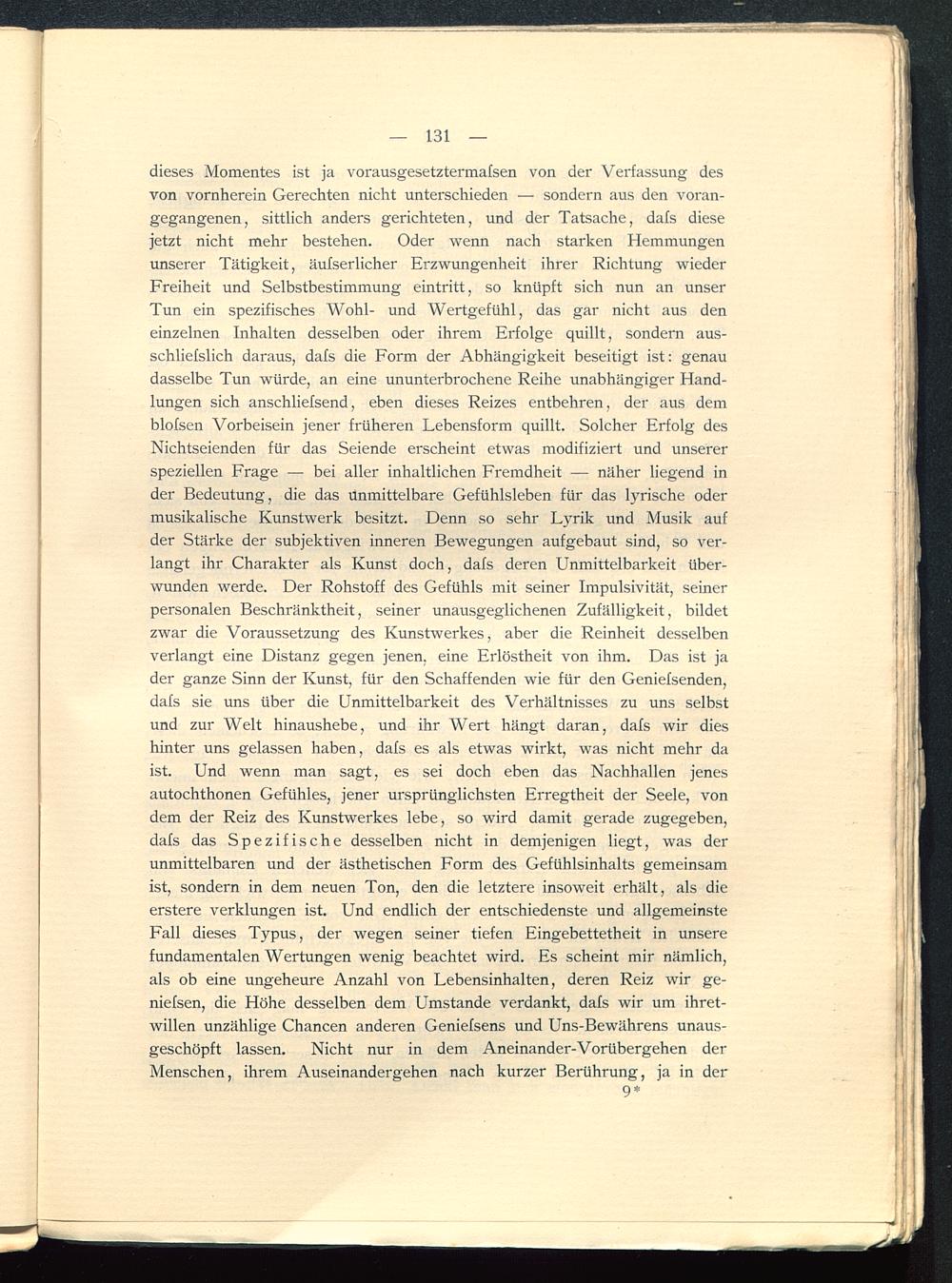 dieses Momentes ist ja vorausgesetztermafsen von der Verfassung desvon vornherein Gerechten nicht unterschieden — sondern aus den voran-gegangenen, sittlich anders gerichteten, und der Tatsache, dafs diesejetzt nicht mehr bestehen. Oder wenn nach starken Hemmungenunserer Tätigkeit, äufserlicher Erzwungenheit ihrer Richtung wiederFreiheit und Selbstbestimmung eintritt, so knüpft sich nun an unserTun ein spezifisches Wohl- und Wertgefühl, das gar nicht aus deneinzelnen Inhalten desselben oder ihrem Erfolge quillt, sondern aus-schliefslich daraus, dafs die Form der Abhängigkeit beseitigt ist: genaudasselbe Tun würde, an eine ununterbrochene Reihe unabhängiger Hand-lungen sich anschliefsend, eben dieses Reizes entbehren, der aus demblofsen Vorbeisein jener früheren Lebensform quillt. Solcher Erfolg desNichtseienden für das Seiende erscheint etwas modifiziert und unsererspeziellen Frage — bei aller inhaltlichen Fremdheit — näher liegend inder Bedeutung, die das Unmittelbare Gefühlsleben für das lyrische odermusikalische Kunstwerk besitzt. Denn so sehr Lyrik und Musik aufder Stärke der subjektiven inneren Bewegungen aufgebaut sind, so ver-langt ihr Charakter als Kunst doch, dafs deren Unmittelbarkeit über-wunden werde. Der Rohstoff des Gefühls mit seiner Impulsivität, seinerpersonalen Beschränktheit, seiner unausgeglichenen Zufälligkeit, bildetzwar die Voraussetzung des Kunstwerkes, aber die Reinheit desselbenverlangt eine Distanz gegen jenen, eine Erlöstheit von ihm. Das ist jader ganze Sinn der Kunst, für den Schaffenden wie für den Geniefsenden,dafs sie uns über die Unmittelbarkeit des Verhältnisses zu uns selbstund zur Welt hinaushebe, und ihr Wert hängt daran, dafs wir dieshinter uns gelassen haben, dafs es als etwas wirkt, was nicht mehr daist. Und wenn man sagt, es sei doch eben das Nachhallen jenesautochthonen Gefühles, jener ursprünglichsten Erregtheit der Seele, vondem der Reiz des Kunstwerkes lebe, so wird damit gerade zugegeben,dafs das Spezifische desselben nicht in demjenigen liegt, was derunmittelbaren und der ästhetischen Form des Gefühlsinhalts gemeinsamist, sondern in dem neuen Ton, den die letztere insoweit erhält, als dieerstere verklungen ist. Und endlich der entschiedenste und allgemeinsteFall dieses Typus, der wegen seiner tiefen Eingebettetheit in unserefundamentalen Wertungen wenig beachtet wird. Es scheint mir nämlich,als ob eine ungeheure Anzahl von Lebensinhalten, deren Reiz wir ge-niefsen, die Höhe desselben dem Umstande verdankt, dafs wir um ihret-willen unzählige Chancen anderen Geniefsens und Uns-Bewährens unaus-geschöpft lassen. Nicht nur in dem Aneinander-Vorübergehen derMenschen, ihrem Auseinandergehen nach kurzer Berührung, ja in der