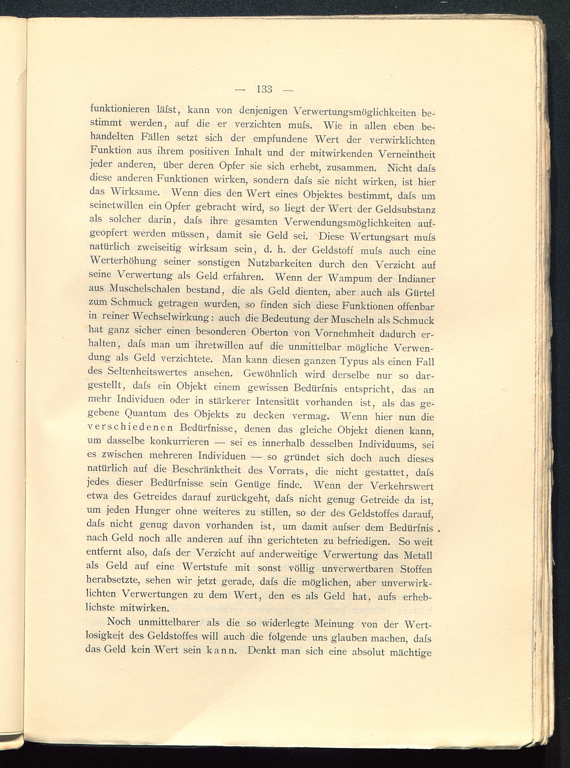 funktionieren läfst, kann von denjenigen Verwertungsmöglichkeiten be-stimmt werden, auf die er verzichten mufs. Wie in allen eben be-handelten Fällen setzt sich der empfundene Wert der verwirklichtenFunktion aus ihrem positiven Inhalt und der mitwirkenden Verneintheitjeder anderen, über deren Opfer sie sich erhebt, zusammen. Nicht dafsdiese anderen Funktionen wirken, sondern dafs sie nicht wirken, ist hierdas Wirksame. Wenn dies den Wert eines Objektes bestimmt, dafs umseinetwillen ein Opfer gebracht wird, so liegt der Wert der Geldsubstanzals solcher darin, dafs ihre gesamten Verwendungsmöglichkeiten auf-geopfert werden müssen, damit sie Geld sei. Diese Wertungsart mufsnatürlich zweiseitig wirksam sein, d. h. der Geldstoff mufs auch eineWerterhöhung seiner sonstigen Nutzbarkeiten durch den Verzicht aufseine Verwertung als Geld erfahren. Wenn der Wampum der Indianeraus Muschelschalen bestand, die als Geld dienten, aber auch als Gürtelzum Schmuck getragen wurden, so finden sich diese Funktionen offenbarin reiner Wechselwirkung: auch die Bedeutung der Muscheln als Schmuckhat ganz sicher einen besonderen Oberton von Vornehjnheit dadurch er-halten, dafs man um ihretwillen auf die unmittelbar mögliche Verwen-dung als Geld verzichtete. Man kann diesen ganzen Typus als einen Falldes Seltenheitswertes ansehen. Gewöhnlich wird derselbe nur so dar-gestellt, dafs ein Objekt einem gewissen Bedürfnis entspricht, das anmehr Individuen oder in stärkerer Intensität vorhanden ist, als das ge-gebene Quantum des Objekts zu decken vermag. Wenn hier nun dieverschiedenen Bedürfnisse, denen das gleiche Objekt dienen kann,um dasselbe konkurrieren — sei es innerhalb desselben Individuums, seies zwischen mehreren Individuen — so gründet sich doch auch diesesnatürlich auf die Beschränktheit des Vorrats, die nicht gestattet, dafsjedes dieser Bedürfnisse sein Genüge finde. Wenn der Verkehrswertetwa des Getreides darauf zurückgeht, dafs nicht genug Getreide da ist,um jeden Hunger ohne weiteres zu stillen, so der des Geldstoffes darauf,dafs nicht genug davon vorhanden ist, um damit aufser dem Bedürfnis .nach Geld noch alle anderen auf ihn gerichteten zu befriedigen. So weitentfernt also, dafs der Verzicht auf anderweitige Verwertung das Metallals Geld auf eine Wertstufe mit sonst völlig unverwertbaren Stoffenherabsetzte, sehen wir jetzt gerade, dafs die möglichen, aber unverwirk-lichten Verwertungen zu dem Wert, den es als Geld hat, aufs erheb-lichste mitwirken.