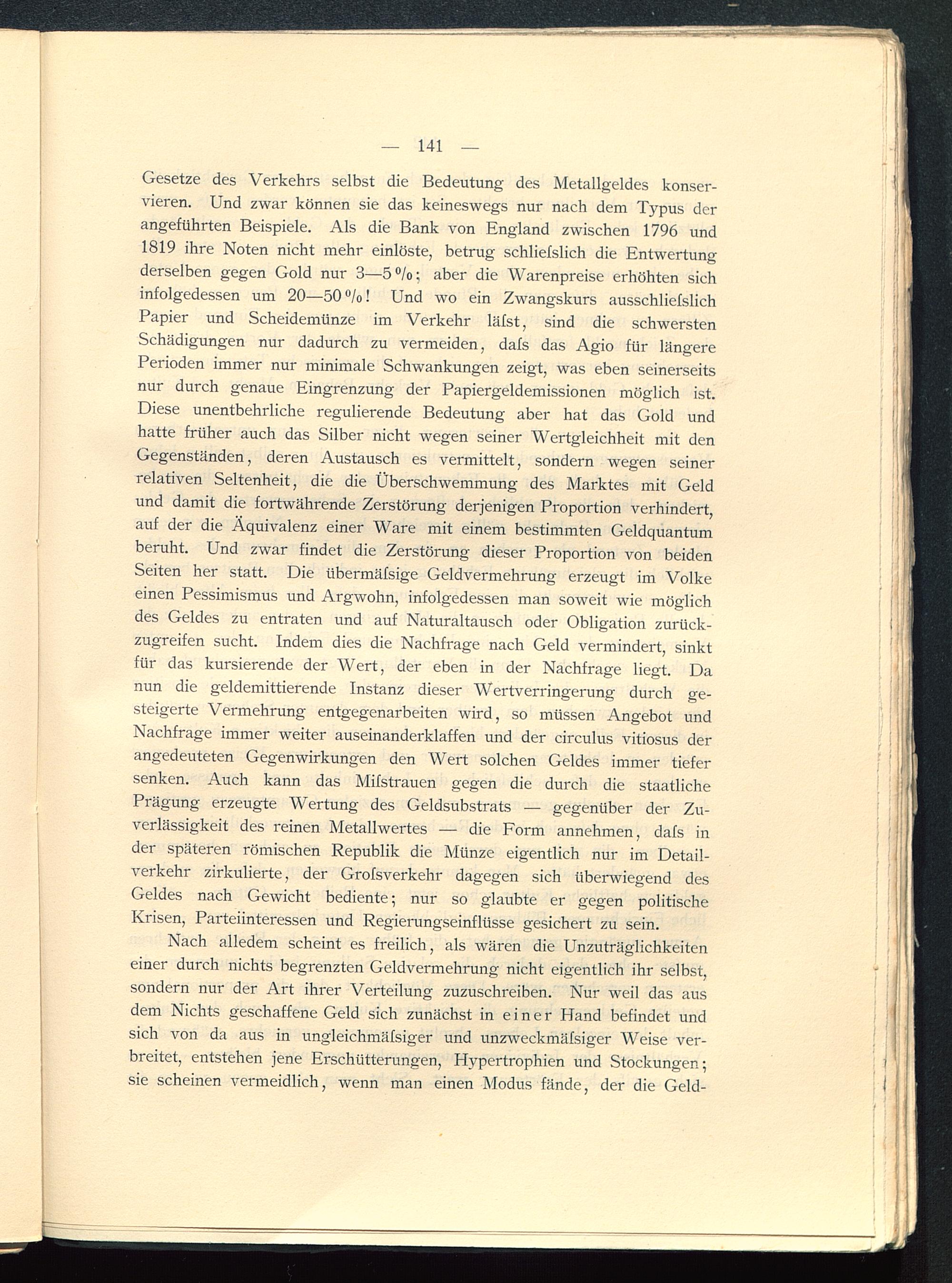 Gesetze des Verkehrs selbst die Bedeutung des Metallgeldes konser-vieren. Und zwar können sie das keineswegs nur nach dem Typus derangeführten Beispiele. Als die Bank von England zwischen 1796 und1819 ihre Noten nicht mehr einlöste, betrug schliefslich die Entwertungderselben gegen Gold nur 3—5°/o; aber die Warenpreise erhöhten sichinfolgedessen um 20—50 °/o! Und wo ein Zwangskurs ausschliefslichPapier und Scheidemünze im Verkehr läfst, sind die schwerstenSchädigungen nur dadurch zu vermeiden, dafs das Agio für längerePerioden immer nur minimale Schwankungen zeigt, was eben seinerseitsnur durch genaue Eingrenzung der Papiergeldemissionen möglich ist.Diese unentbehrliche regulierende Bedeutung aber hat das Gold undhatte früher auch das Silber nicht wegen seiner Wertgleichheit mit denGegenständen, deren Austausch es vermittelt, sondern wegen seinerrelativen Seltenheit, die die Überschwemmung des Marktes mit Geldund damit die fortwährende Zerstörung derjenigen Proportion verhindert,auf der die Äquivalenz einer Ware mit einem bestimmten Geldquantumberuht. Und zwar findet die Zerstörung dieser Proportion von beidenSeiten her statt. Die übermäfsige Geldvermehrung erzeugt im Volkeeinen Pessimismus und Argwohn, infolgedessen man soweit wie möglichdes Geldes zu entraten und auf Naturaltausch oder Obligation zurück-zugreifen sucht. Indem dies die Nachfrage nach Geld vermindert, sinktfür das kursierende der Wert, der eben in der Nachfrage liegt. Danun die geldemittierende Instanz dieser Wertverringerung durch ge-steigerte Vermehrung entgegenarbeiten wird, so müssen Angebot undNachfrage immer weiter auseinanderklaffen und der circulus vitiosus derangedeuteten Gegenwirkungen den Wert solchen Geldes immer tiefersenken. Auch kann das Mifstrauen gegen die durch die staatlichePrägung erzeugte Wertung des Geldsubstrats — gegenüber der Zu-verlässigkeit des reinen Metallwertes — die Form annehmen, dafs inder späteren römischen Republik die Münze eigentlich nur im Detail-verkehr zirkulierte, der Grofsverkehr dagegen sich überwiegend desGeldes nach Gewicht bediente; nur so glaubte er gegen politischeKrisen, Parteiinteressen und Regierungseinflüsse gesichert zu sein.
