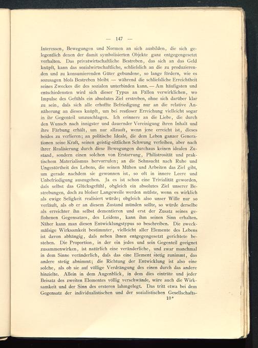 Interessen, Bewegungen und Normen an sich ausbilden, die sich ge-legentlich denen der damit symbolisierten Objekte ganz entgegengesetztverhalten. Das privatwirtschaftliche Bestreben, das sich an das Geldknüpft, kann das sozialwirtschaftliche, schliefslich an die zu produzieren-den und zu konsumierenden Güter gebundene, so lange fördern, wie essozusagen blofs Bestreben bleibt — während die schliefsliche Erreichtheitseines Zweckes die des sozialen unterbinden kann. — Am häufigsten undentschiedensten wird sich dieser Typus an Fällen verwirklichen, woImpulse des Gefühls ein absolutes Ziel erstreben, ohne sich darüber klarzu sein, dafs sich alle erhoffte Befriedigung nur an die relative An-näherung an dieses knüpft, um bei restloser Erreichung vielleicht sogarin ihr Gegenteil umzuschlagen. Ich erinnere an die Liebe, die durchden Wunsch nach innigster und dauernder Vereinigung ihren Inhalt undihre Färbung erhält, um nur allzuoft, wenn jene erreicht ist, diesesbeides zu verlieren; an politische Ideale, die dem Leben ganzer Genera-tionen seine Kraft, seinen geistig-sittlichen Schwung verleihen, aber nachihrer Realisierung durch diese Bewegungen durchaus keinen idealen Zu-stand, sondern einen solchen von Erstarrung, Philistrosität und prak-tischem Materialismus hervorrufen; an die Sehnsucht nach Ruhe undUngestörtheit des Lebens, die seinen Mühen und Arbeiten das Ziel gibt,um gerade nachdem sie gewonnen ist, so oft in innere Leere undUnbefriedigung auszugehen. Ja es ist schon eine Trivialität geworden,dafs selbst das Glücksgefühl, obgleich ein absolutes Ziel unserer Be-strebungen, doch zu blofser Langeweile werden müfste, wenn es wirklichals ewige Seligkeit realisiert würde; obgleich also unser Wille nur soverläuft, als ob er an diesem Zustand münden sollte, so würde derselbeals erreichter ihn selbst dementieren und erst der Zusatz seines ge-flohenen Gegensatzes, des Leidens, kann ihm seinen Sinn erhalten.Näher kann man diesen Entwicklungstypus so beschreiben. Die zweck-mäfsige Wirksamkeit bestimmter, vielleicht aller Elemente des Lebensist davon abhängig, dafs neben ihnen entgegengesetzt gerichtete be-stehen. Die Proportion, in der ein jedes und sein Gegenteil geeignetZusammenwirken, ist natürlich eine veränderliche, und zwar manchmalin dem Sinne veränderlich, dafs das eine Element stetig zunimmt, dasandere stetig abnimmt; die Richtung der Entwicklung ist also einesolche, als ob sie auf völlige Verdrängung des einen durch das anderehinzielte. Allein in dem Augenblick, in dem dies einträte und jederBeisatz des zweiten Elementes völlig verschwände, wäre auch die Wirk-samkeit und der Sinn des ersteren lahmgelegt. Das tritt etwa bei demGegensatz der individualistischen und der sozialistischen Gesellschafts-