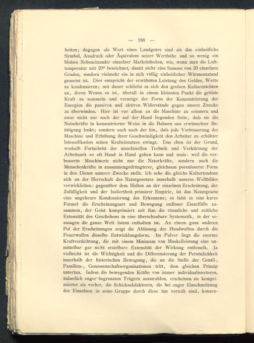 heiten; dagegen als Wert eines Landgutes sind sie das einheitlicheSymbol, Ausdruck oder Äquivalent seiner Werthöhe und so wenig einblofses Nebeneinander einzelner Markeinheiten, wie, wenn man die Luft-temperatur mit 20° bezeichnet, damit nicht eine Summe von 20 einzelnenGraden, sondern vielmehr ein in sich völlig einheitlicher Wärmezustandgemeint ist. Dies entspricht der erwähnten Leistung des Geldes, Wertezu kondensieren; mit dieser schliefst es sich den grofsen Kulturmächtenan, deren Wesen es ist, überall in einem kleinsten Punkt die gröfsteKraft zu sammeln und vermöge der Form der Konzentrierung derEnergien die passiven und aktiven Widerstände gegen unsere Zweckezu überwinden. Hier ist vor allem an die Maschine zu erinnern undzwar nicht nur nach der auf der Hand liegenden Seite, dafs sie dieNaturkräfte in konzentrierter Weise in die Bahnen uns erwünschter Be-tätigung lenkt; sondern auch nach der hin, dafs jede Verbesserung derMaschine und Erhöhung ihrer Geschwindigkeit den Arbeiter zu erhöhterIntensifikation seines Krafteinsatzes zwingt. Das eben ist der Grund,weshalb Fortschritt der maschinellen Technik und Verkürzung derArbeitszeit so oft Hand in Hand gehen kann und mufs: weil die ver-besserte Maschinerie nicht nur die Naturkräfte, sondern auch dieMenschenkräfte in zusammengedrängterer, gleichsam porenloserer Formin den Dienst unserer Zwecke stellt. Ich sehe die gleiche Kulturtendenzsich an der Herrschaft des Naturgesetzes innerhalb unseres Weltbildesverwirklichen: gegenüber dem Haften an der einzelnen Erscheinung, derZufälligkeit und der Isoliertheit primärer Empirie, ist das Naturgesetzeine ungeheure Kondensierung des Erkennens; es fafst in eine kurzeFormel die Erscheinungsart und Bewegung endloser Einzelfälle zu-sammen, der Geist komprimiert mit ihm die räumliche und zeitlicheExtensität des Geschehens in eine überschaubare Systematik, in der so-zusagen die ganze Welt latent enthalten ist. An einem ganz anderenPol der Erscheinungen zeigt die Ablösung der Handwaffen durch dieFeuerwaffen dieselbe Entwicklungsform. Im Pulver liegt die enormeKraftverdichtung, die mit einem Minimum von Muskelleistung eine un-mittelbar gar nicht erzielbare Extensität der Wirkung entfesselt. Javielleicht ist die Wichtigkeit und die Differenzierung der Persönlichkeitinnerhalb der historischen Bewegung, die an die Stelle der Gentil-,Familien-, Genossenschaftsorganisationen tritt, dem gleichen Prinzipuntertan. Indem die bewegenden Kräfte von immer individualisierteren,äufserlich enger' begrenzten Trägern ausstrahlen, erscheinen sie kompri-mierter als vorher, die Schicksalsfaktoren, die bei enger Einschmelzungdes Einzelnen in seine Gruppe durch diese hin verteilt sind, konzen-