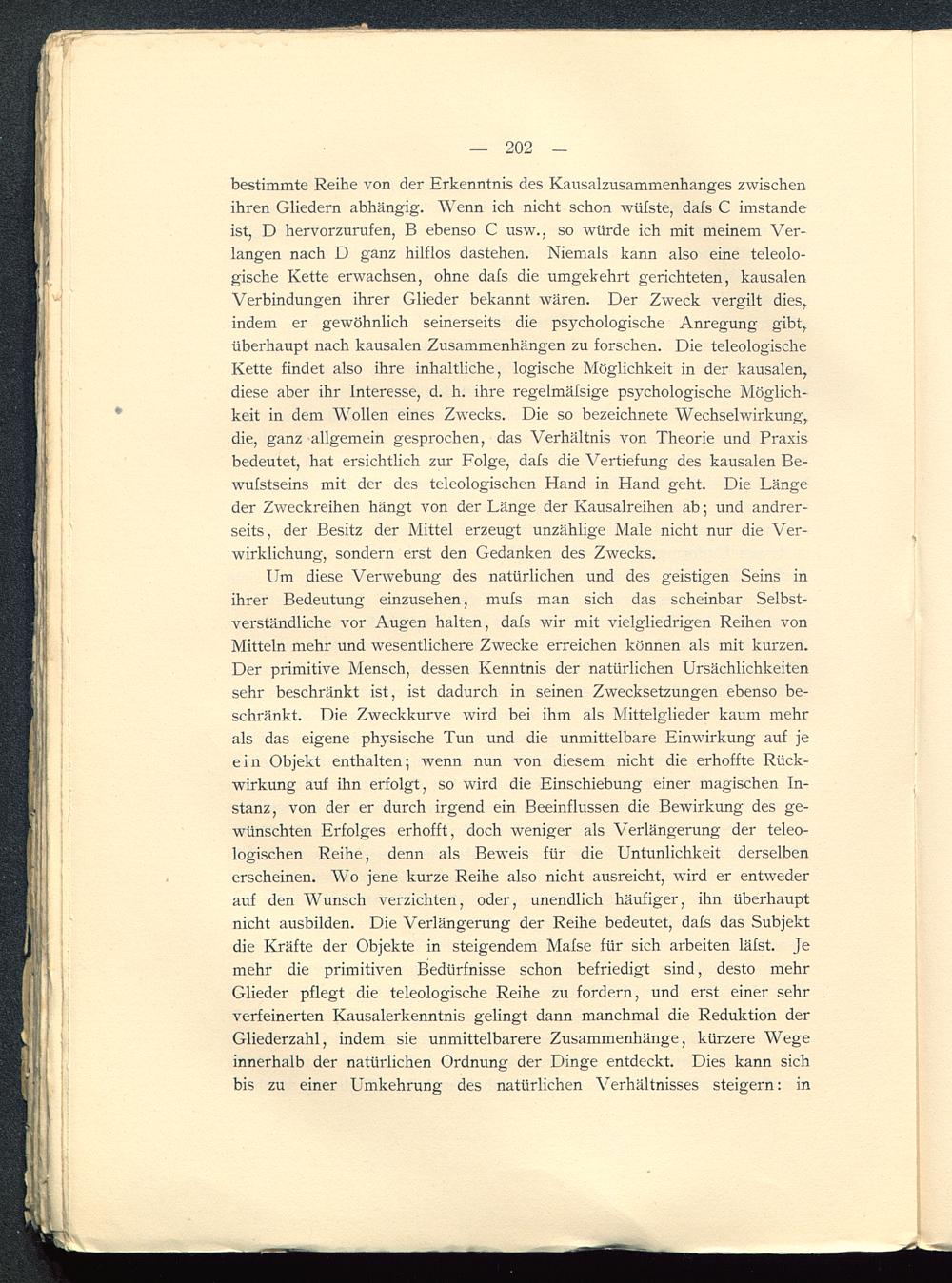 bestimmte Reihe von der Erkenntnis des Kausalzusammenhanges zwischenihren Gliedern abhängig. Wenn ich nicht schon wüfste, dals C imstandeist, D hervorzurufen, B ebenso C usw., so würde ich mit meinem Ver-langen nach D ganz hilflos dastehen. Niemals kann also eine teleolo-gische Kette erwachsen, ohne dafs die umgekehrt gerichteten, kausalenVerbindungen ihrer Glieder bekannt wären. Der Zweck vergilt dies,indem er gewöhnlich seinerseits die psychologische Anregung gibt,überhaupt nach kausalen Zusammenhängen zu forschen. Die teleologischeKette findet also ihre inhaltliche, logische Möglichkeit in der kausalen,diese aber ihr Interesse, d. h. ihre regelmäfsige psychologische Möglich-keit in dem Wollen eines Zwecks. Die so bezeichnete Wechselwirkung,die, ganz allgemein gesprochen, das Verhältnis von Theorie und Praxisbedeutet, hat ersichtlich zur Folge, dafs die Vertiefung des kausalen Be-wufstseins mit der des teleologischen Hand in Hand geht. Die Längeder Zweckreihen hängt von der Länge der Kausalreihen ab; und andrer-seits, der Besitz der Mittel erzeugt unzählige Male nicht nur die Ver-wirklichung, sondern erst den Gedanken des Zwecks.