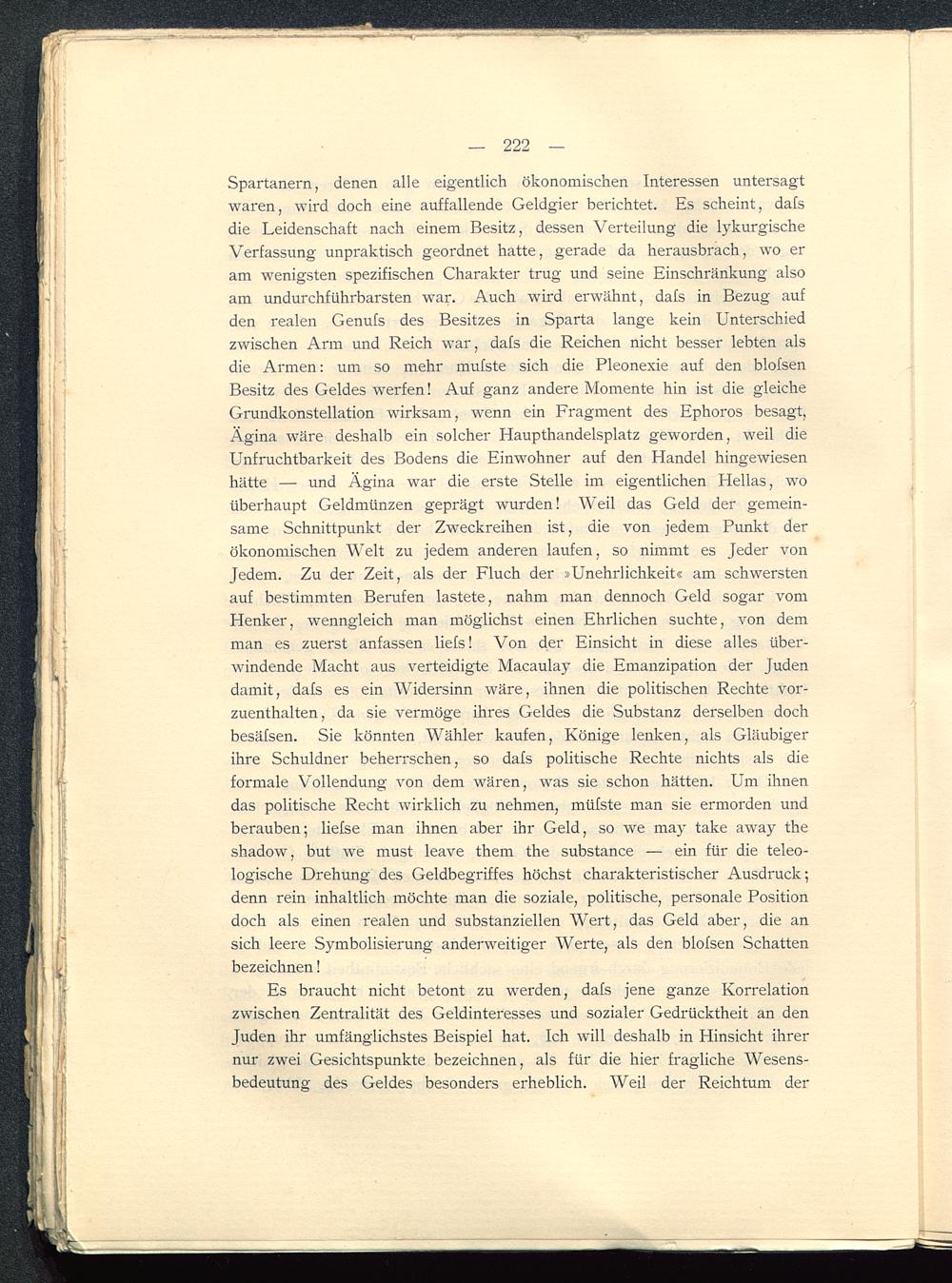 Spartanern, denen alle eigentlich ökonomischen Interessen untersagtwaren, wird doch eine auffallende Geldgier berichtet. Es scheint, dafsdie Leidenschaft nach einem Besitz, dessen Verteilung die lykurgischeVerfassung unpraktisch geordnet hatte, gerade da herausbrach, wo eram wenigsten spezifischen Charakter trug und seine Einschränkung alsoam undurchführbarsten war. Auch wird erwähnt, dafs in Bezug aufden realen Genufs des Besitzes in Sparta lange kein Unterschiedzwischen Arm und Reich war, dafs die Reichen nicht besser lebten alsdie Armen: um so mehr mufste sich die Pleonexie auf den blofsenBesitz des Geldes werfen! Auf ganz andere Momente hin ist die gleicheGrundkonstellation wirksam, wenn ein Fragment des Ephoros besagt,Ägina wäre deshalb ein solcher Haupthandelsplatz geworden, weil dieUnfruchtbarkeit des Bodens die Einwohner auf den Handel hingewiesenhätte — und Ägina war die erste Stelle im eigentlichen Hellas, woüberhaupt Geldmünzen geprägt wurden! Weil das Geld der gemein-same Schnittpunkt der Zweckreihen ist, die von jedem Punkt derökonomischen Welt zu jedem anderen laufen, so nimmt es Jeder vonJedem. Zu der Zeit, als der Fluch der »Unehrlichkeit« am schwerstenauf bestimmten Berufen lastete, nahm man dennoch Geld sogar vomHenker, wenngleich man möglichst einen Ehrlichen suchte, von demman es zuerst anfassen liefs! Von der Einsicht in diese alles über-windende Macht aus verteidigte Macaulay die Emanzipation der Judendamit, dafs es ein Widersinn wäre, ihnen die politischen Rechte vor-zuenthalten, da sie vermöge ihres Geldes die Substanz derselben dochbesäfsen. Sie könnten Wähler kaufen, Könige lenken, als Gläubigerihre Schuldner beherrschen, so dafs politische Rechte nichts als dieformale Vollendung von dem wären, was sie schon hätten. Um ihnendas politische Recht wirklich zu nehmen, müfste man sie ermorden undberauben; liefse man ihnen aber ihr Geld, so we may take away theshadow, but we must leave them the substance — ein für die teleo-logische Drehung des Geldbegriffes höchst charakteristischer Ausdruck;denn rein inhaltlich möchte man die soziale, politische, personale Positiondoch als einen realen und substanziellen Wert, das Geld aber, die ansich leere Symbolisierung anderweitiger Werte, als den blofsen Schattenbezeichnen!