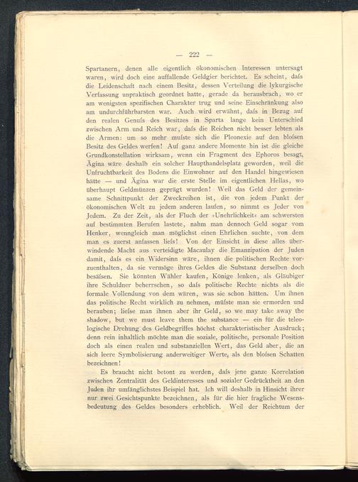 Es braucht nicht betont zu werden, dafs jene ganze Korrelationzwischen Zentralität des Geldinteresses und sozialer Gedrücktheit an denJuden ihr umfänglichstes Beispiel hat. Ich will deshalb in Hinsicht ihrernur zwei Gesichtspunkte bezeichnen, als für die hier fragliche Wesens-bedeutung des Geldes besonders erheblich. Weil der Reichtum der