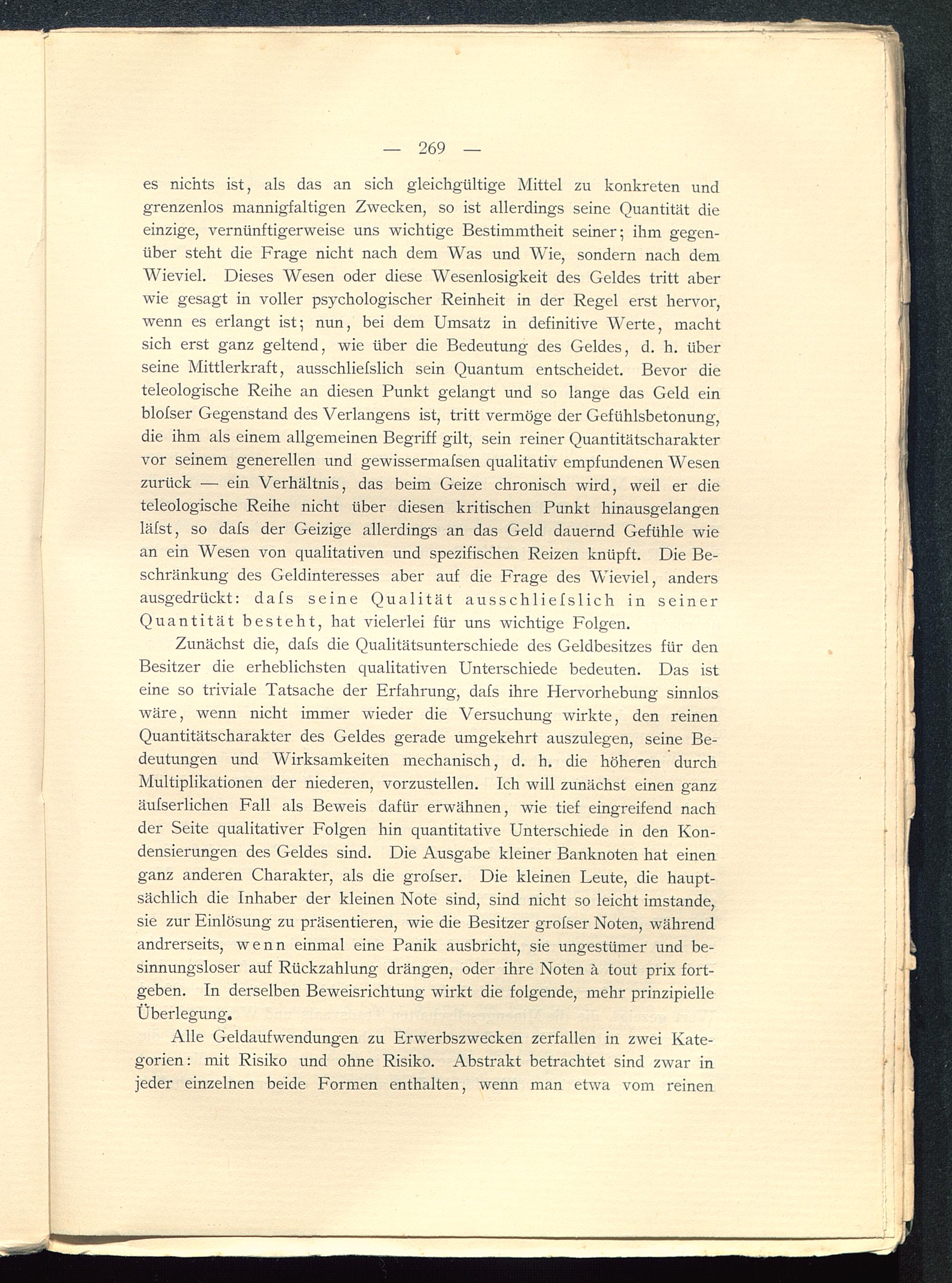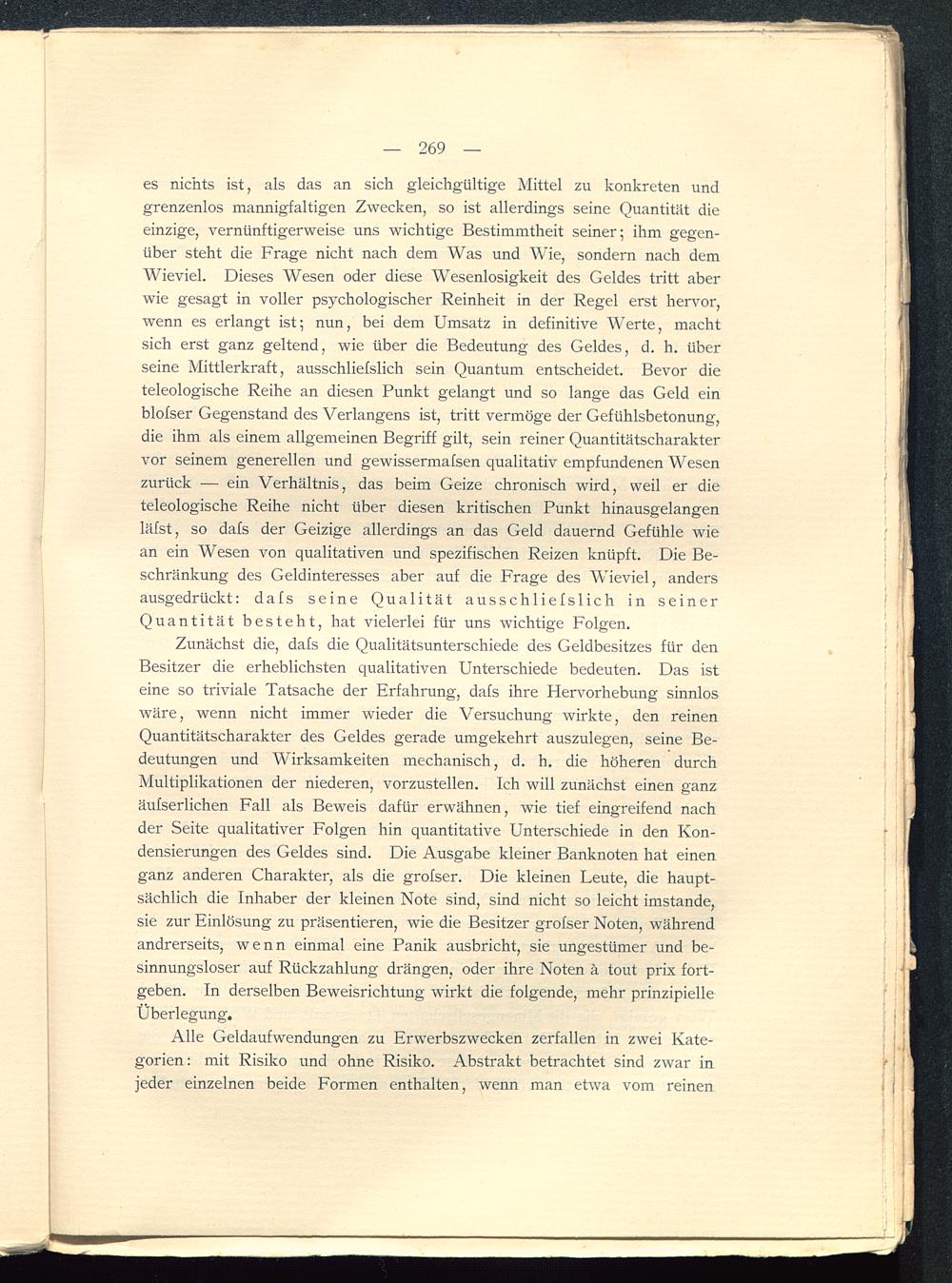 es nichts ist, als das an sich gleichgültige Mittel zu konkreten undgrenzenlos mannigfaltigen Zwecken, so ist allerdings seine Quantität dieeinzige, vernünftigerweise uns wichtige Bestimmtheit seiner; ihm gegen-über steht die Frage nicht nach dem Was und Wie, sondern nach demWieviel. Dieses Wesen oder diese Wesenlosigkeit des Geldes tritt aberwie gesagt in voller psychologischer Reinheit in der Regel erst hervor,wenn es erlangt ist; nun, bei dem Umsatz in definitive Werte, machtsich erst ganz geltend, wie über die Bedeutung des Geldes, d. h. überseine Mittlerkraft, ausschliefslich sein Quantum entscheidet. Bevor dieteleologische Reihe an diesen Punkt gelangt und so lange das Geld einblofser Gegenstand des Verlangens ist, tritt vermöge der Gefühlsbetonung,die ihm als einem allgemeinen Begriff gilt, sein reiner Quantitätscharaktervor seinem generellen und gewissermafsen qualitativ empfundenen Wesenzurück — ein Verhältnis, das beim Geize chronisch wird, weil er dieteleologische Reihe nicht über diesen kritischen Punkt hinausgelangenläfst, so dafs der Geizige allerdings an das Geld dauernd Gefühle wiean ein Wesen von qualitativen und spezifischen Reizen knüpft. Die Be-schränkung des Geldinteresses aber auf die Frage des Wieviel, andersausgedrückt: dafs seine Qualität ausschliefslich in seinerQuantität besteht, hat vielerlei für uns wichtige Folgen.