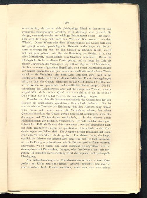 Zunächst die, dafs die Qualitätsunterschiede des Geldbesitzes für denBesitzer die erheblichsten qualitativen Unterschiede bedeuten. Das isteine so triviale Tatsache der Erfahrung, dafs ihre Hervorhebung sinnloswäre, wenn nicht immer wieder die Versuchung wirkte, den reinenQuantitätscharakter des Geldes gerade umgekehrt auszulegen, seine Be-deutungen und Wirksamkeiten mechanisch, d. h. die höheren durchMultiplikationen der niederen, vorzustellen. Ich will zunächst einen ganzäufserlichen Fall als Beweis dafür erwähnen, wie tief eingreifend nachder Seite qualitativer Folgen hin quantitative Unterschiede in den Kon-densierungen des Geldes sind. Die Ausgabe kleiner Banknoten hat einenganz anderen Charakter, als die grofser. Die kleinen Leute, die haupt-sächlich die Inhaber der kleinen Note sind, sind nicht so leicht imstande,sie zur Einlösung zu präsentieren, wie die Besitzer grofser Noten, währendandrerseits, wenn einmal eine Panik ausbricht, sie ungestümer und be-sinnungsloser auf Rückzahlung drängen, oder ihre Noten ä tout prix fort-geben. In derselben Beweisrichtung wirkt die folgende, mehr prinzipielleÜberlegung.