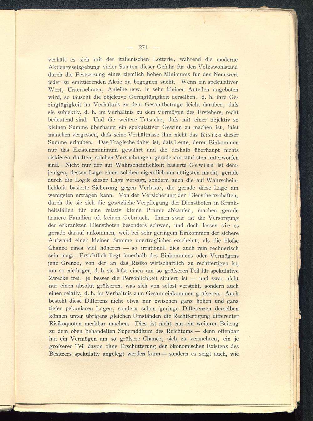 verhält es sich mit der italienischen Lotterie, während die moderneAktiengesetzgebung vieler Staaten dieser Gefahr für den Volkswohlstanddurch die Festsetzung eines ziemlich hohen Minimums für den Nennwertjeder zu emittierenden Aktie zu begegnen sucht. Wenn ein spekulativerWert, Unternehmen, Anleihe usw. in sehr kleinen Anteilen angebotenwird, so täuscht die objektive Geringfügigkeit derselben, d. h. ihre Ge-ringfügigkeit im Verhältnis zu dem Gesamtbeträge leicht darüber, dafssie subjektiv, d. h. im Verhältnis zu dem Vermögen des Erstehers, rechtbedeutend sind. Und die weitere Tatsache, dafs mit einer objektiv sokleinen Summe überhaupt ein spekulativer Gewinn zu machen ist, läfstmanchen vergessen, dafs seine Verhältnisse ihm nicht das Risiko dieserSumme erlauben. Das Tragische dabei ist, dafs Leute, deren Einkommennur das Existenzminimum gewährt und die deshalb überhaupt nichtsriskieren dürften, solchen Versuchungen gerade am stärksten unterworfensind. Nicht nur der auf Wahrscheinlichkeit basierte Gewinn ist dem-jenigen, dessen Lage einen solchen eigentlich am nötigsten macht, geradedurch die Logik dieser Lage versagt, sondern auch die auf Wahrschein-lichkeit basierte Sicherung gegen Verluste, die gerade diese Lage amwenigsten ertragen kann. Von der Versicherung der Dienstherrschaften,durch die sie sich die gesetzliche Verpflegung der Dienstboten in Krank-heitsfällen für eine relativ kleine Prämie abkaufen, machen geradeärmere Familien oft keinen Gebrauch. Ihnen zwar ist die Versorgungder erkrankten Dienstboten besonders schwer, und doch lassen sie esgerade darauf ankommen, weil bei sehr geringem Einkommen der sichereAufwand einer kleinen Summe unerträglicher erscheint, als die blofseChance eines viel höheren —- so irrationell dies auch rein rechnerischsein mag. Ersichtlich liegt innerhalb des Einkommens oder Vermögensjene Grenze, von der an das,Risiko wirtschaftlich zu rechtfertigen ist,um so niedriger, d. h. sie läfst einen um so gröfseren Teil für spekulativeZwecke frei, je besser die Persönlichkeit situiert ist — und zwar nichtnur einen absolut gröfseren, was sich von selbst versteht, sondern aucheinen relativ, d. h. im Verhältnis zum Gesamteinkommen gröfseren. Auchbesteht diese Differenz nicht etwa nur zwischen ganz hohen und ganztiefen pekuniären Lagen, sondern schon geringe Differenzen derselbenkönnen unter übrigens gleichen Umständen die Rechtfertigung differenterRisikoquoten merkbar machen. Dies ist nicht nur ein weiterer Beitragzu dem oben behandelten Superadditum des Reichtums — denn offenbarhat ein Vermögen um so gröfsere Chance, sich zu vermehren, ein jegröfserer Teil davon ohne Erschütterung der ökonomischen Existenz desBesitzers spekulativ angelegt werden kann — sondern es zeigt auch, wie