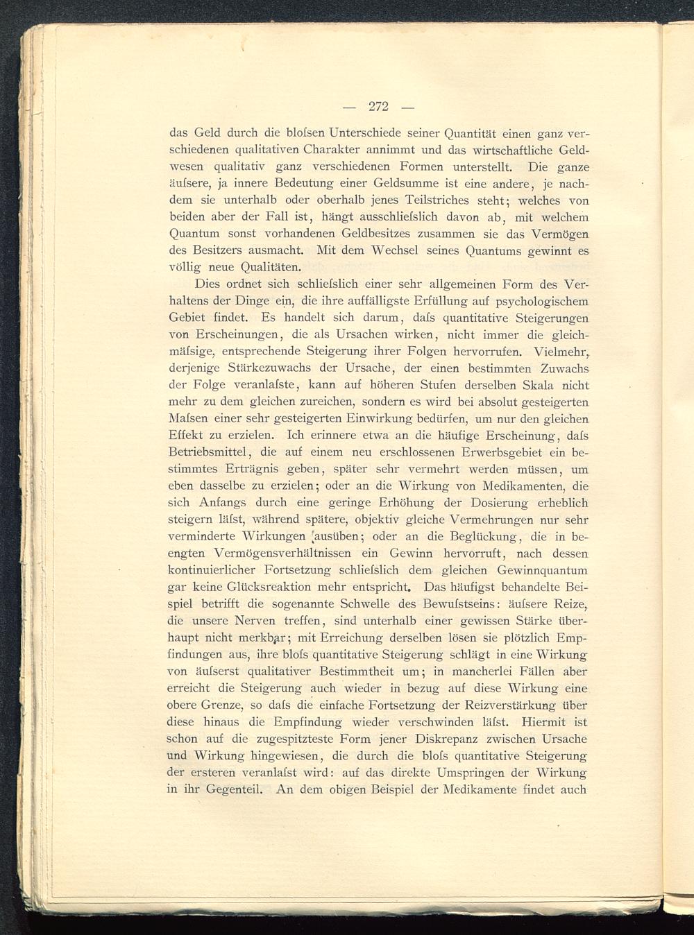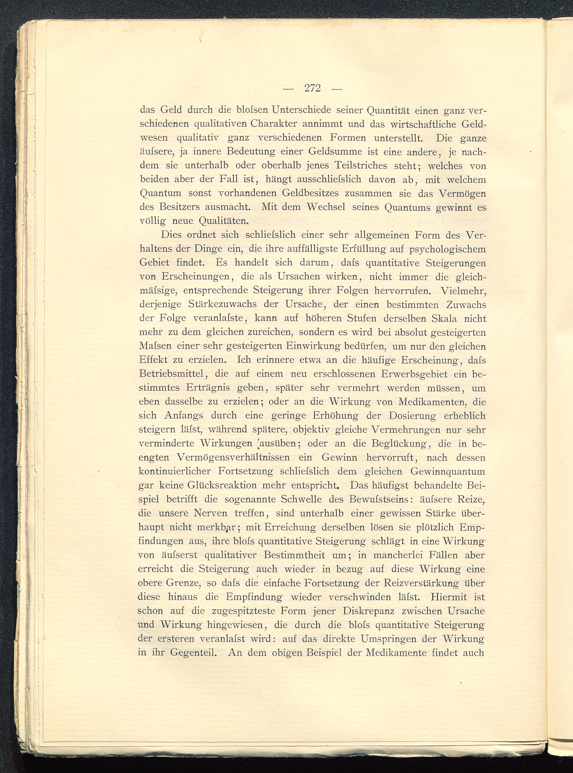 Dies ordnet sich schliefslich einer sehr allgemeinen Form des Ver-haltens der Dinge ein, die ihre auffälligste Erfüllung auf psychologischemGebiet findet. Es handelt sich darum, dafs quantitative Steigerungenvon Erscheinungen, die als Ursachen wirken, nicht immer die gleich-mäfsige, entsprechende Steigerung ihrer Folgen hervorrufen. Vielmehr,,derjenige Stärkezuwachs der Ursache, der einen bestimmten Zuwachsder Folge veranlafste, kann auf höheren Stufen derselben Skala nichtmehr zu dem gleichen zureichen, sondern es wird bei absolut gesteigertenMafsen einer sehr gesteigerten Einwirkung bedürfen, um nur den gleichenEffekt zu erzielen. Ich erinnere etwa an die häufige Erscheinung, dafsBetriebsmittel, die auf einem neu erschlossenen Erwerbsgebiet ein be-stimmtes Erträgnis geben, später sehr vermehrt werden müssen, umeben dasselbe zu erzielen; oder an die Wirkung von Medikamenten, diesich Anfangs durch eine geringe Erhöhung der Dosierung erheblichsteigern läfst, während spätere, objektiv gleiche Vermehrungen nur sehrverminderte Wirkungen [ausüben; oder an die Beglückung, die in be-engten Vermögensverhältnissen ein Gewinn hervorruft, nach dessenkontinuierlicher Fortsetzung schliefslich dem gleichen Gewinnquantumgar keine Glücksreaktion mehr entspricht. Das häufigst behandelte Bei-spiel betrifft die sogenannte Schwelle des Bewufstseins: äufsere Reize,die unsere Nerven treffen, sind unterhalb einer gewissen Stärke über-haupt nicht merkbar; mit Erreichung derselben lösen sie plötzlich Emp-findungen aus, ihre blofs quantitative Steigerung schlägt in eine Wirkungvon äufserst qualitativer Bestimmtheit um; in mancherlei Fällen abererreicht die Steigerung auch wieder in bezug auf diese Wirkung eineobere Grenze, so dafs die einfache Fortsetzung der Reizverstärkung überdiese hinaus die Empfindung wieder verschwinden läfst. Hiermit istschon auf die zugespitzteste Form jener Diskrepanz zwischen Ursacheund Wirkung hingewiesen, die durch die blofs quantitative Steigerungder ersteren veranlafst wird: auf das direkte Umspringen der Wirkungin ihr Gegenteil. An dem obigen Beispiel der Medikamente findet auch