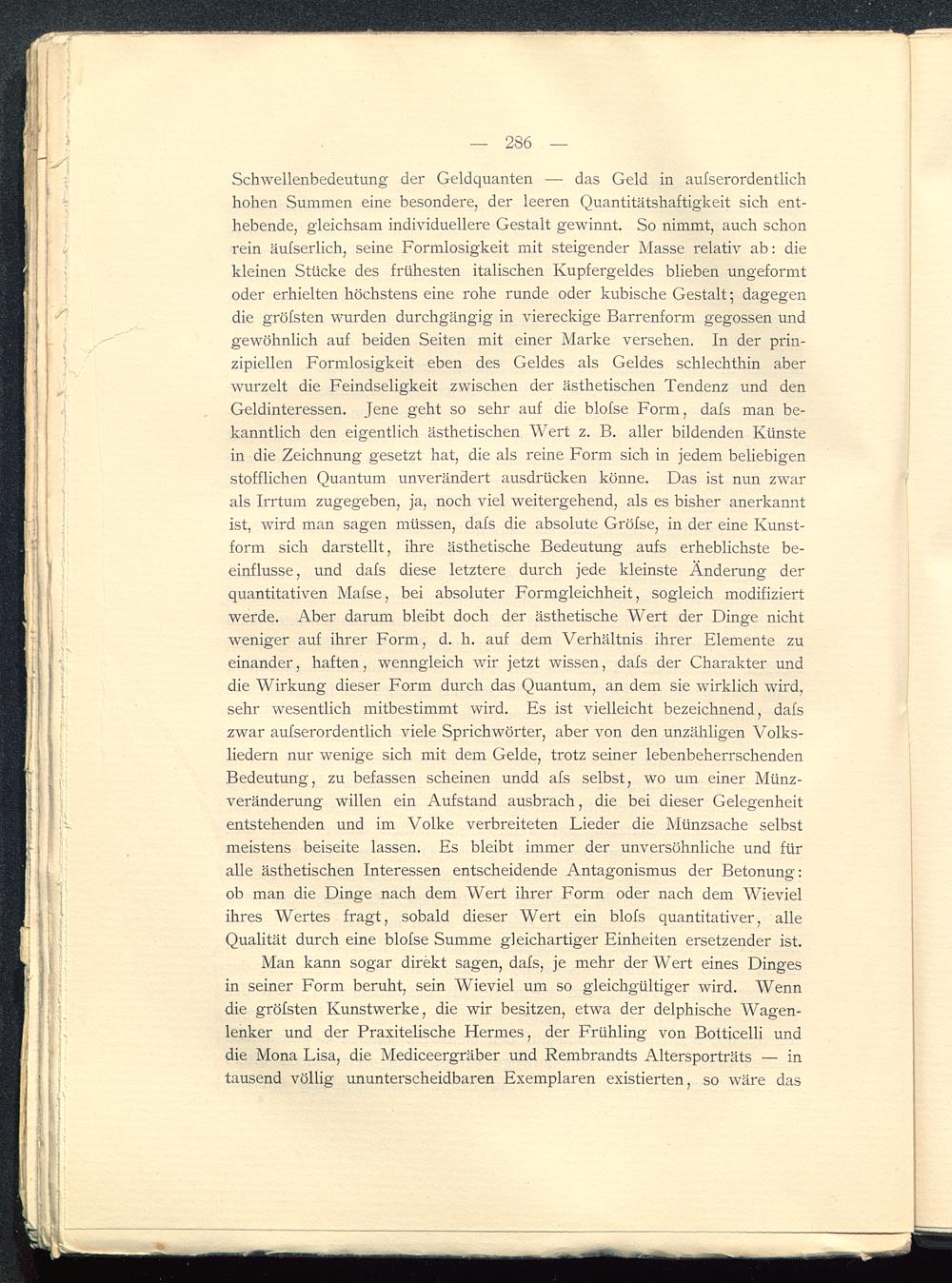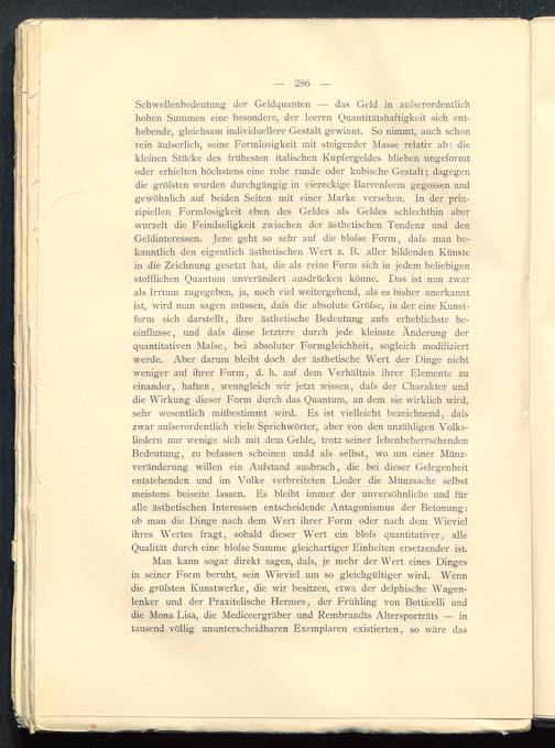 Schwellenbedeutung der Geldquanten — das Geld in aulserordentlichhohen Summen eine besondere, der leeren Quantitätshaftigkeit sich ent-hebende, gleichsam individuellere Gestalt gewinnt. So nimmt, auch schonrein äufserlich, seine Formlosigkeit mit steigender Masse relativ ab: diekleinen Stücke des frühesten italischen Kupfergeldes blieben ungeformtoder erhielten höchstens eine rohe runde oder kubische Gestalt; dagegendie gröfsten wurden durchgängig in viereckige Barrenform gegossen undgewöhnlich auf beiden Seiten mit einer Marke versehen. In der prin-zipiellen Formlosigkeit eben des Geldes als Geldes schlechthin aberwurzelt die Feindseligkeit zwischen der ästhetischen Tendenz und denGeldinteressen. Jene geht so sehr auf die blofse Form, dafs man be-kanntlich den eigentlich ästhetischen Wert z. B. aller bildenden Künstein die Zeichnung gesetzt hat, die als reine Form sich in jedem beliebigenstofflichen Quantum unverändert ausdrücken könne. Das ist nun zwarals Irrtum zugegeben, ja, noch viel weitergehend, als es bisher anerkanntist, wird man sagen müssen, dafs die absolute Gröfse, in der eine Kunst-form sich darstellt, ihre ästhetische Bedeutung aufs erheblichste be-einflusse , und dafs diese letztere durch jede kleinste Änderung derquantitativen Mafse, bei absoluter Formgleichheit, sogleich modifiziertwerde. Aber darum bleibt doch der ästhetische Wert der Dinge nichtweniger auf ihrer Form, d. h. auf dem Verhältnis ihrer Elemente zueinander, haften, wenngleich wir jetzt wissen, dafs der Charakter unddie Wirkung dieser Form durch das Quantum, an dem sie 'wirklich wird,sehr wesentlich mitbestimmt wird. Es ist vielleicht bezeichnend, dafszwar aufserordentlich viele Sprichwörter, aber von den unzähligen Volks-liedern nur wenige sich mit dem Gelde, trotz seiner lebenbeherrschendenBedeutung, zu befassen scheinen undd als selbst, wo um einer Münz-veränderung willen ein Aufstand ausbrach, die bei dieser Gelegenheitentstehenden und im Volke verbreiteten Lieder die Münzsache selbstmeistens beiseite lassen. Es bleibt immer der unversöhnliche und füralle ästhetischen Interessen entscheidende Antagonismus der Betonung:ob man die Dinge nach dem Wert ihrer Form oder nach dem Wievielihres Wertes fragt, sobald dieser Wert ein blofs quantitativer, alleQualität durch eine blofse Summe gleichartiger Einheiten ersetzender ist.