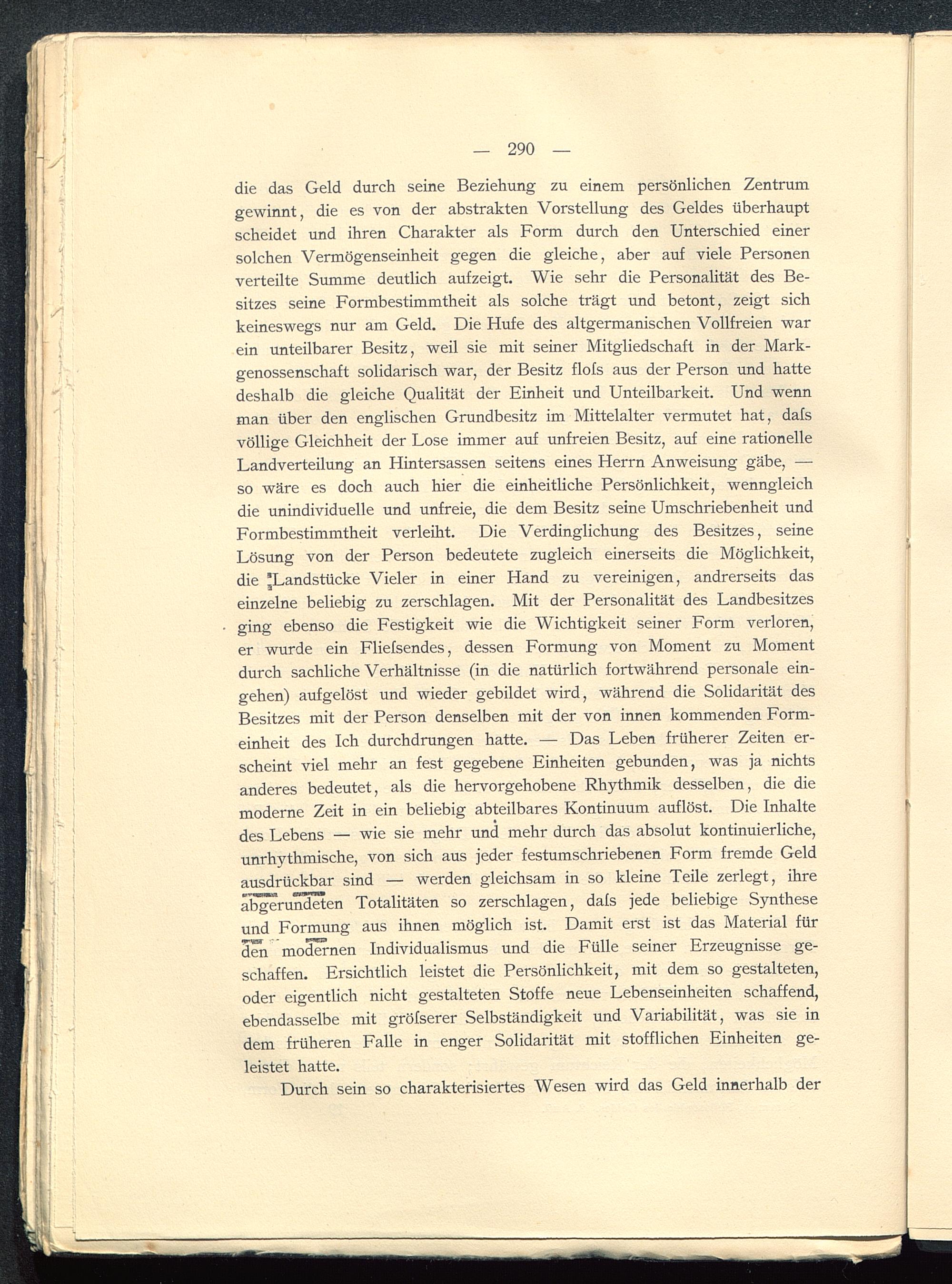 die das Geld durch seine Beziehung zu einem persönlichen Zentrumgewinnt, die es von der abstrakten Vorstellung des Geldes überhauptscheidet und ihren Charakter als Form durch den Unterschied einersolchen Vermögenseinheit gegen die gleiche, aber auf viele Personenverteilte Summe deutlich aufzeigt. Wie sehr die Personalität des Be-sitzes seine Formbestimmtheit als solche trägt und betont, zeigt sichkeineswegs nur am Geld. Die Hufe des altgermanischen Vollfreien warein unteilbarer Besitz, weil sie mit seiner Mitgliedschaft in der Mark-genossenschaft solidarisch war, der Besitz flofs aus der Person und hattedeshalb die gleiche Qualität der Einheit und Unteilbarkeit. Und wennman über den englischen Grundbesitz im Mittelalter vermutet hat, dafsvöllige Gleichheit der Lose immer auf unfreien Besitz, auf eine rationelleLandverteilung an Hintersassen seitens eines Herrn Anweisung gäbe, —so wäre es doch auch hier die einheitliche Persönlichkeit, wenngleichdie unindividuelle und unfreie, die dem Besitz seine Umschriebenheit undFormbestimmtheit verleiht. Die Verdinglichung des Besitzes, seineLösung von der Person bedeutete zugleich einerseits die Möglichkeit,die ’Landstücke Vieler in einer Hand zu vereinigen, andrerseits daseinzelne beliebig zu zerschlagen. Mit der Personalität des Landbesitzesging ebenso die Festigkeit wie die Wichtigkeit seiner Form verloren,er wurde ein Fliefsendes, dessen Formung von Moment zu Momentdurch sachliche Verhältnisse (in die natürlich fortwährend personale ein-gehen) aufgelöst und wieder gebildet wird, während die Solidarität desBesitzes mit der Person denselben mit der von innen kommenden Form-einheit des Ich durchdrungen hatte. — Das Leben früherer Zeiten er-scheint viel mehr an fest gegebene Einheiten gebunden, was ja nichtsanderes bedeutet, als die hervorgehobene Rhythmik desselben, die diemoderne Zeit in ein beliebig abteilbares Kontinuum auflöst. Die Inhaltedes Lebens — wie sie mehr und mehr durch das absolut kontinuierliche,unrhythmische, von sich aus jeder festumschriebenen Form fremde Geldausdrückbar sind — werden gleichsam in so kleine Teile zerlegt, ihreabgerundeten Totalitäten so zerschlagen, dafs jede beliebige Syntheseund Formung aus ihnen möglich ist. Damit erst ist das Material fürden modernen Individualismus und die Fülle seiner Erzeugnisse ge-schaffen. Ersichtlich leistet die Persönlichkeit, mit dem so gestalteten,oder eigentlich nicht gestalteten Stoffe neue Lebenseinheiten schaffend,ebendasselbe mit gröfserer Selbständigkeit und Variabilität, was sie indem früheren Falle in enger Solidarität mit stofflichen Einheiten ge-leistet hatte.